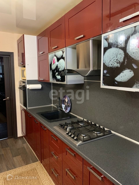 В подарок новым собственникам оставим кухонный гарнитур со встроенной техникой (духовой шкаф, варочная панель, посудомоечная машина).