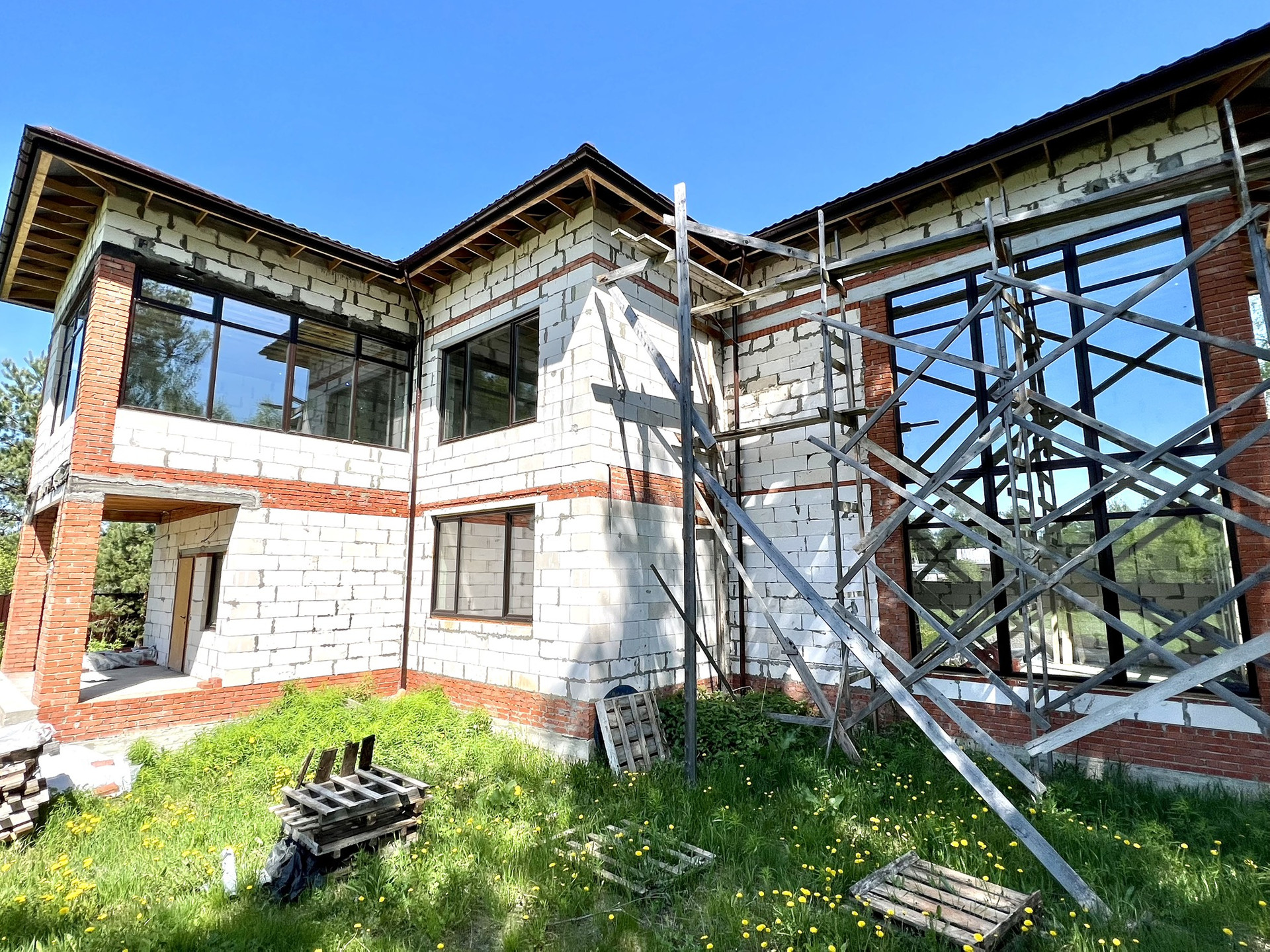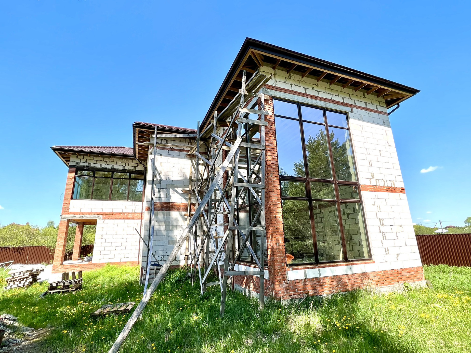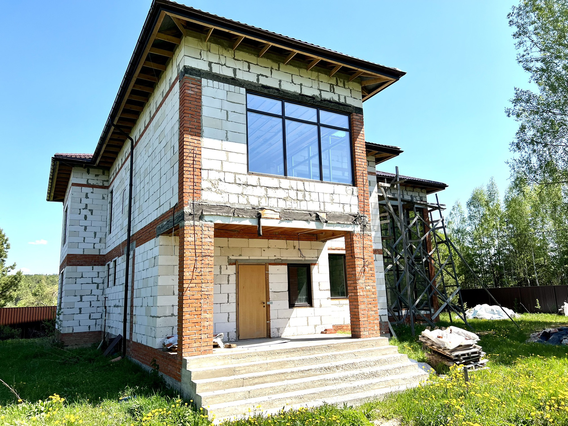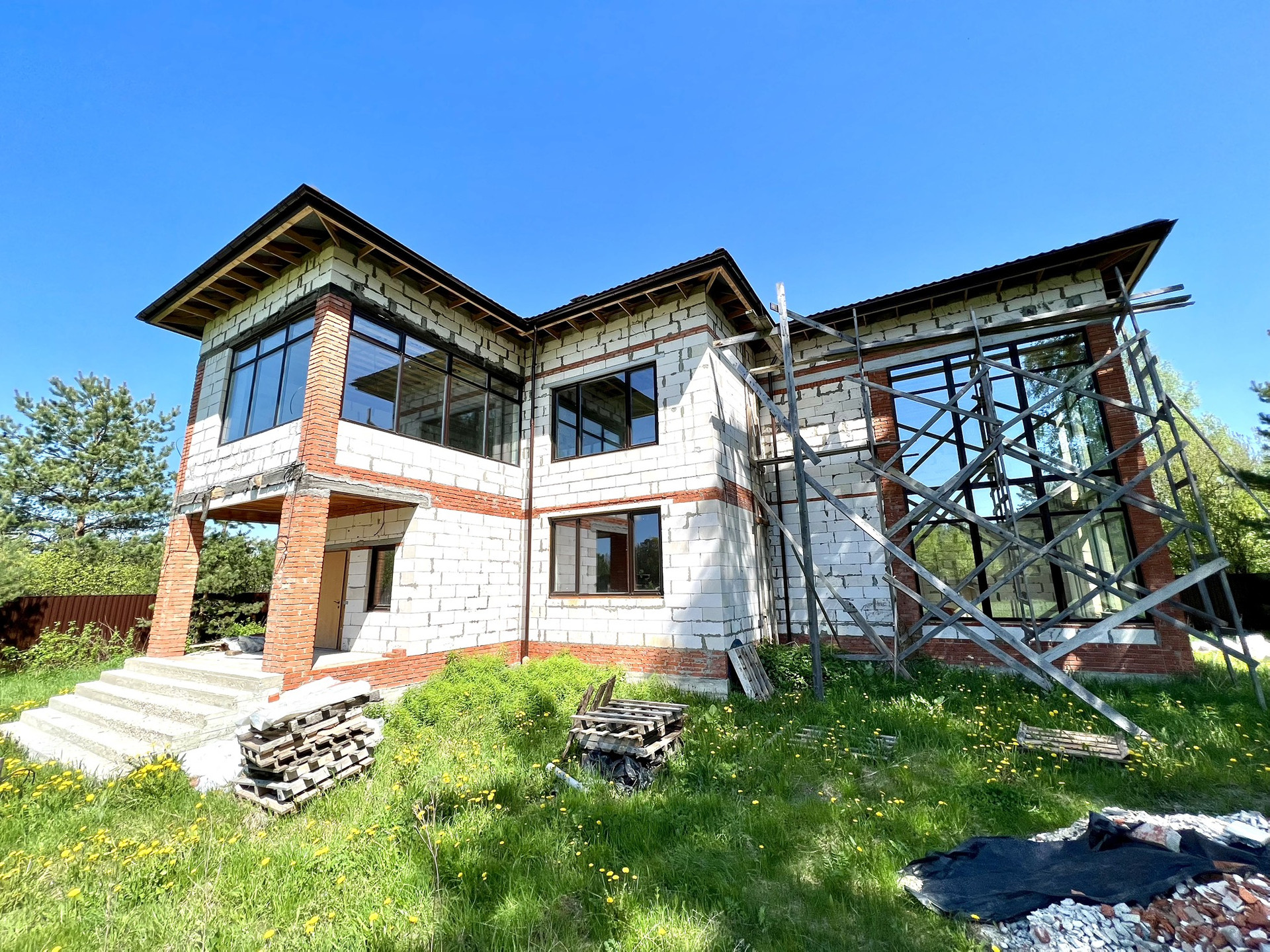 Перекрытия монолитные плиты + брусья. Крыша металлочерепица Grandline, очень хорошего качества. Под камин подготовлен дымоход.