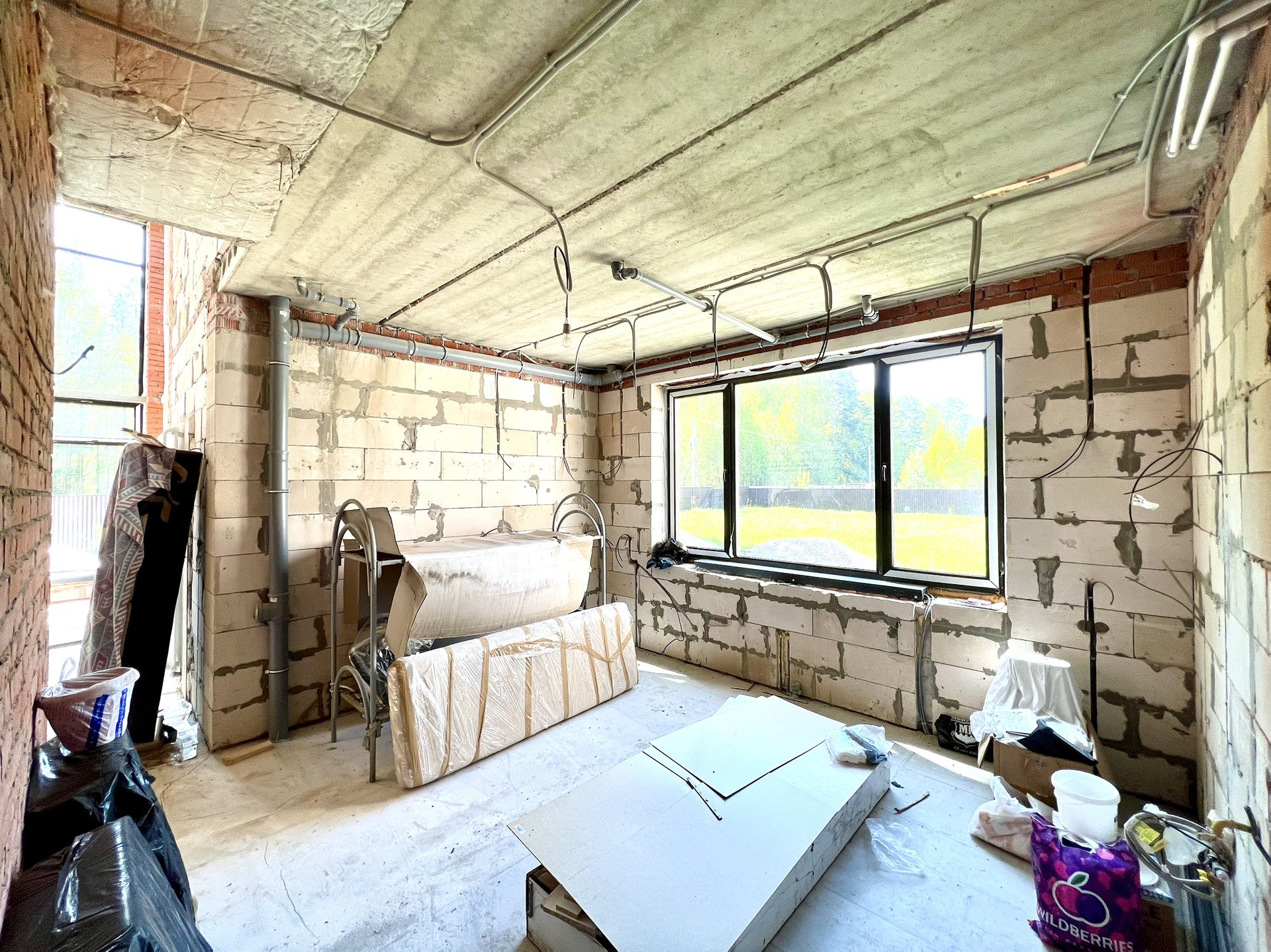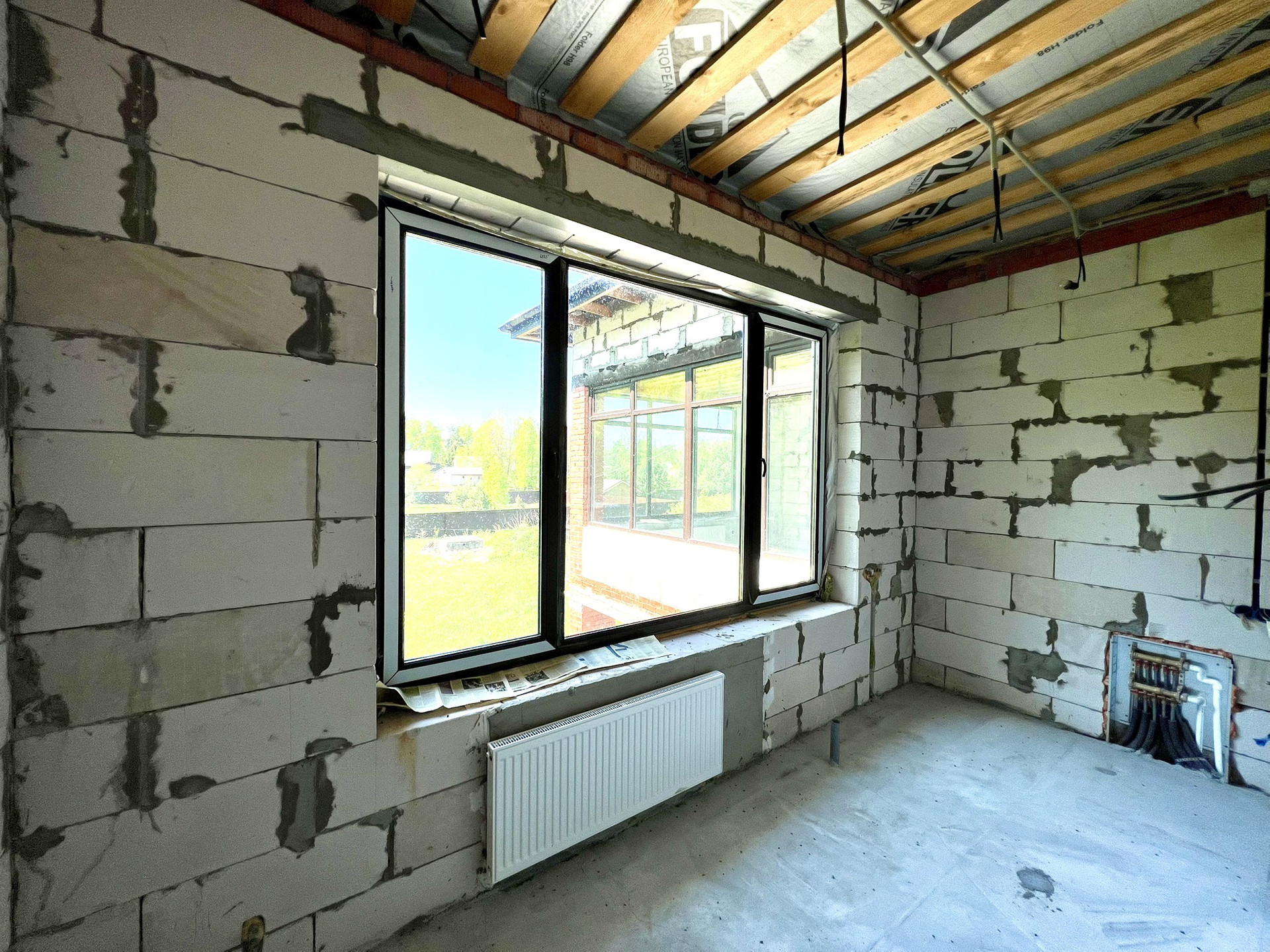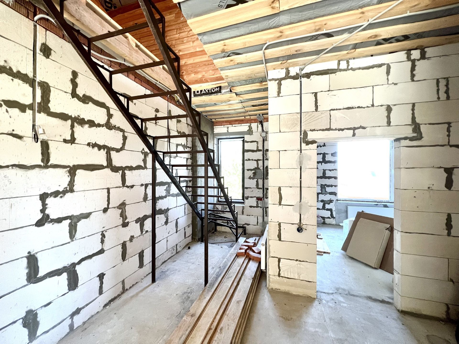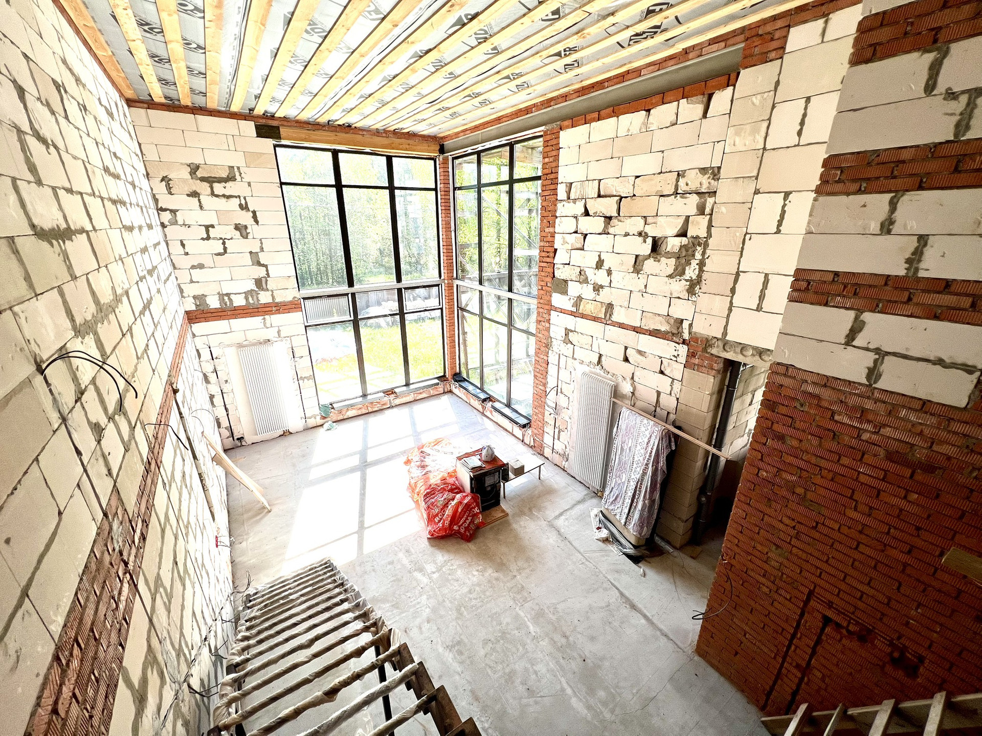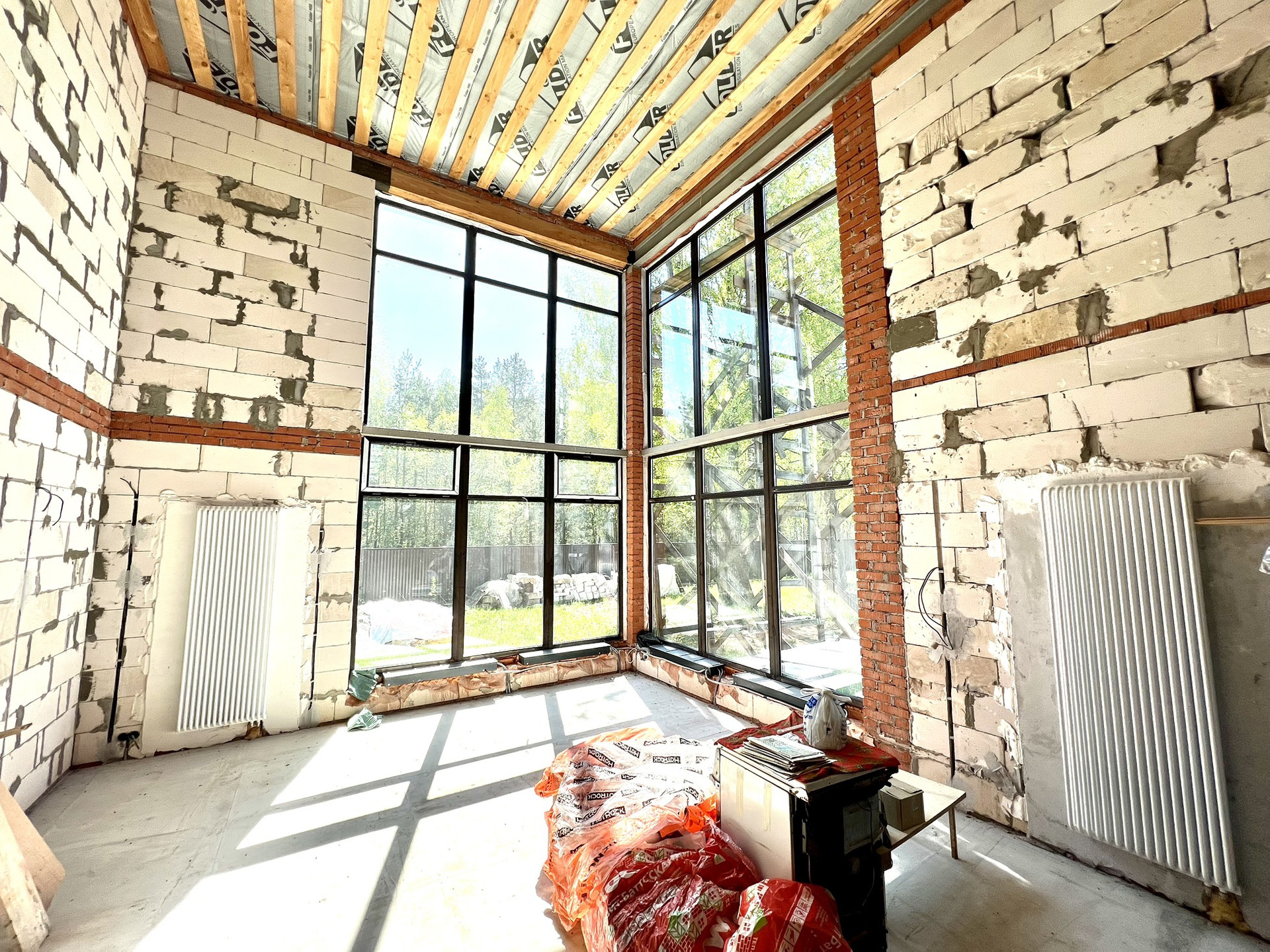 Перекрытия монолитные плиты + брусья. Крыша металлочерепица Grandline, очень хорошего качества. Под камин подготовлен дымоход.