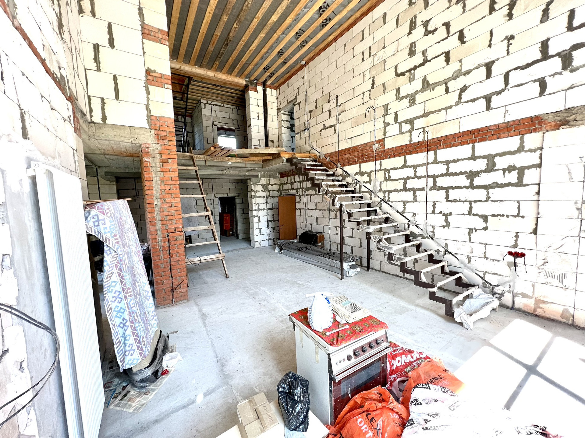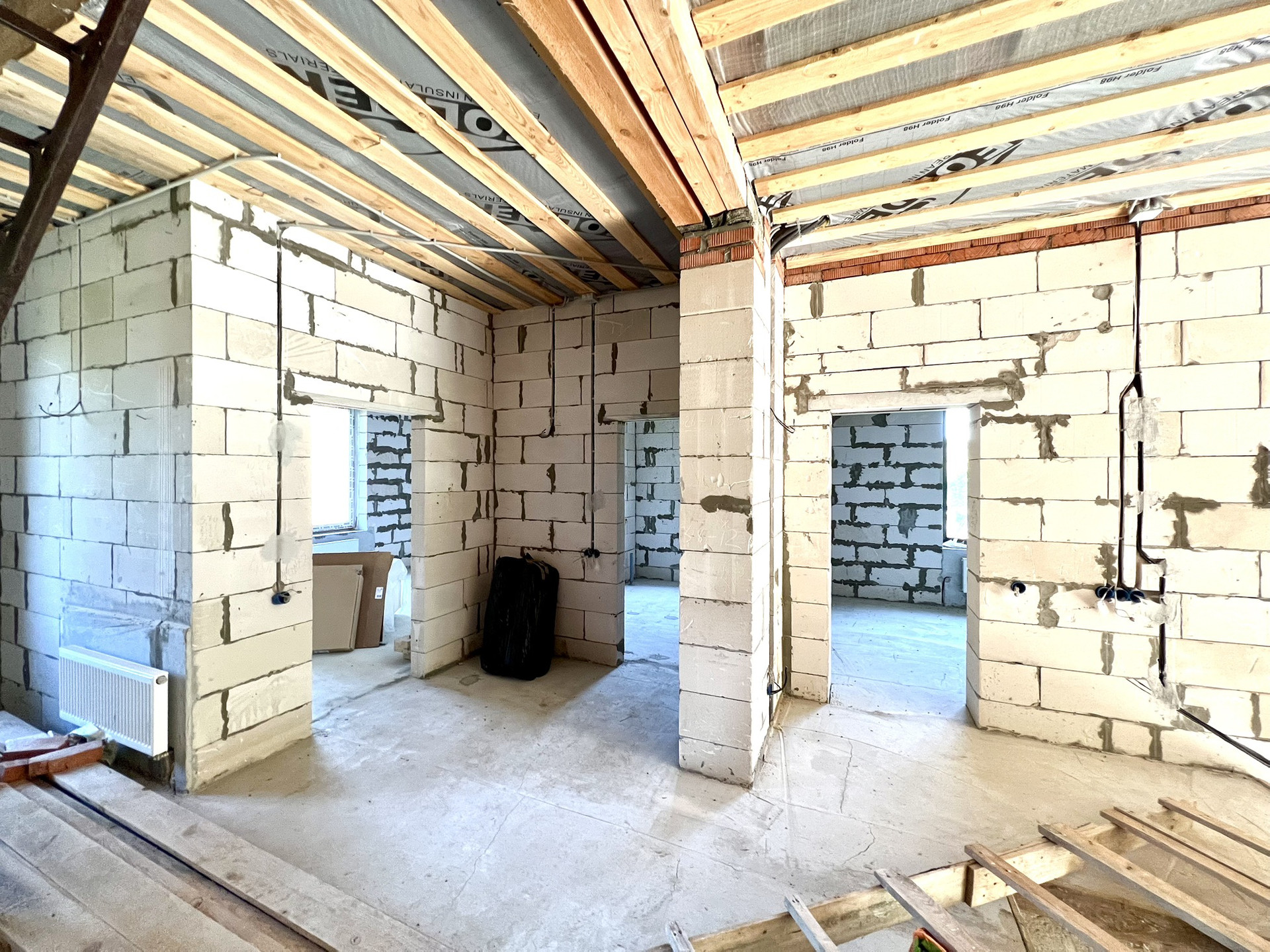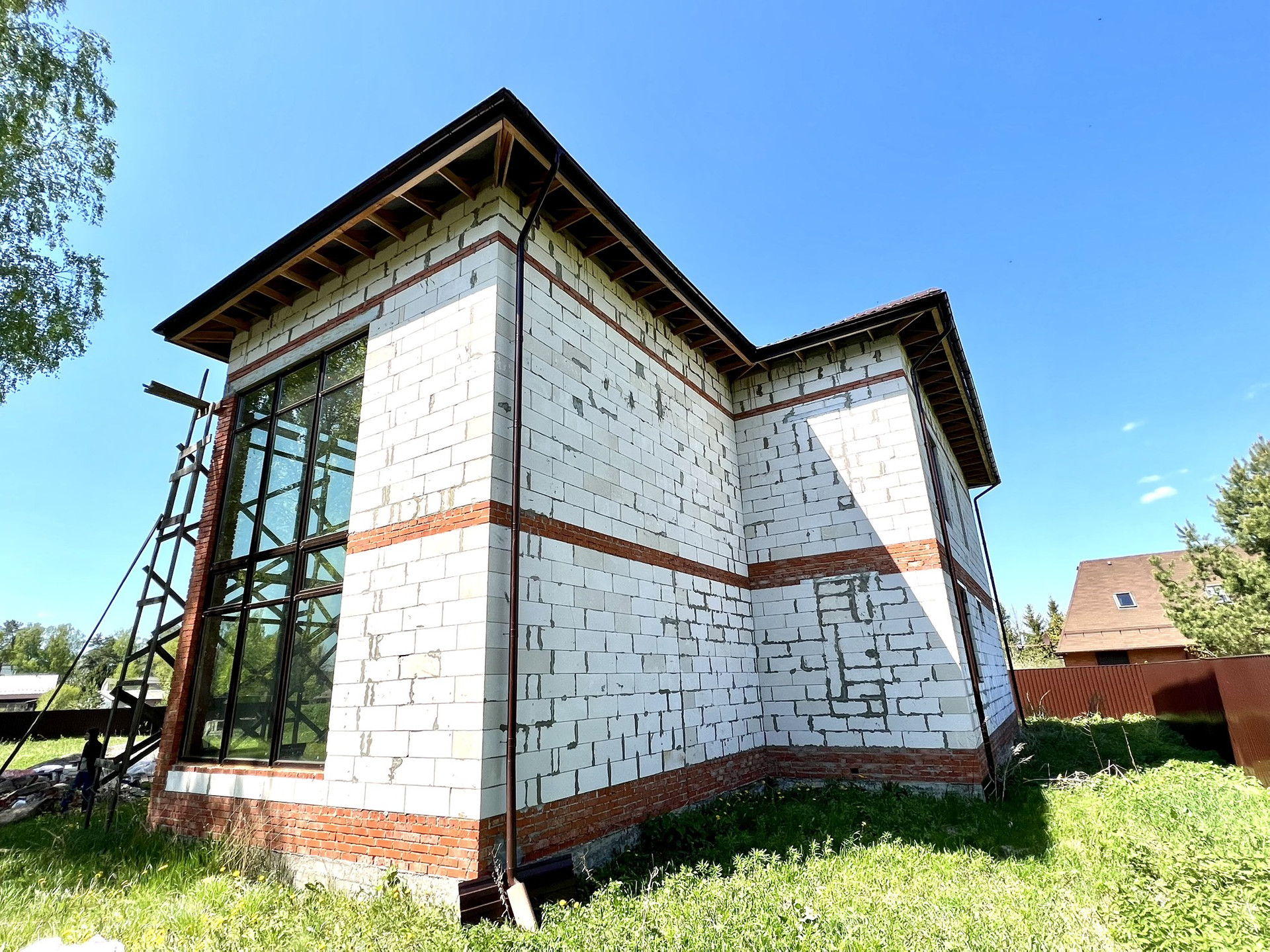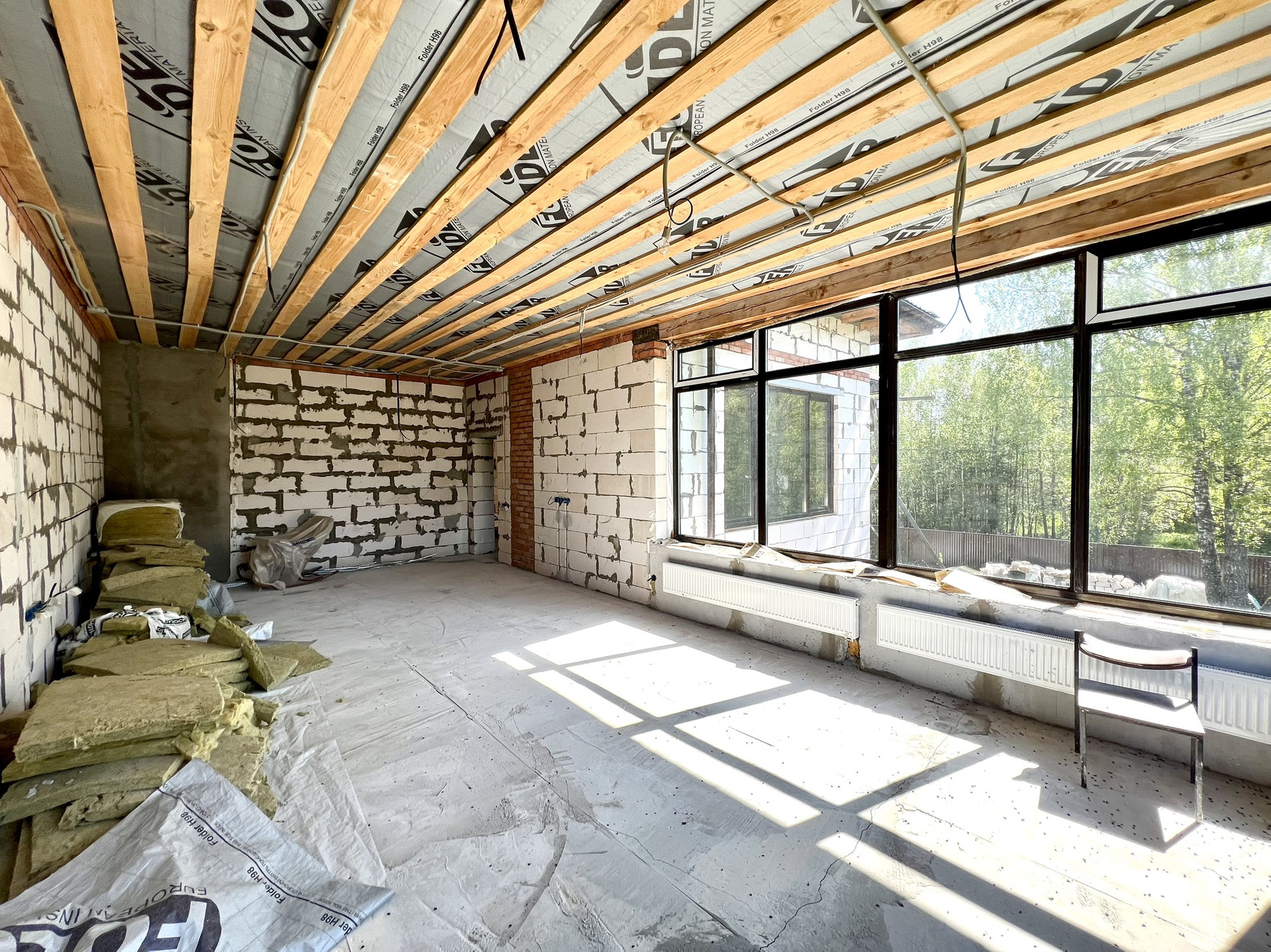 Перекрытия монолитные плиты + брусья. Крыша металлочерепица Grandline, очень хорошего качества. Под камин подготовлен дымоход.
