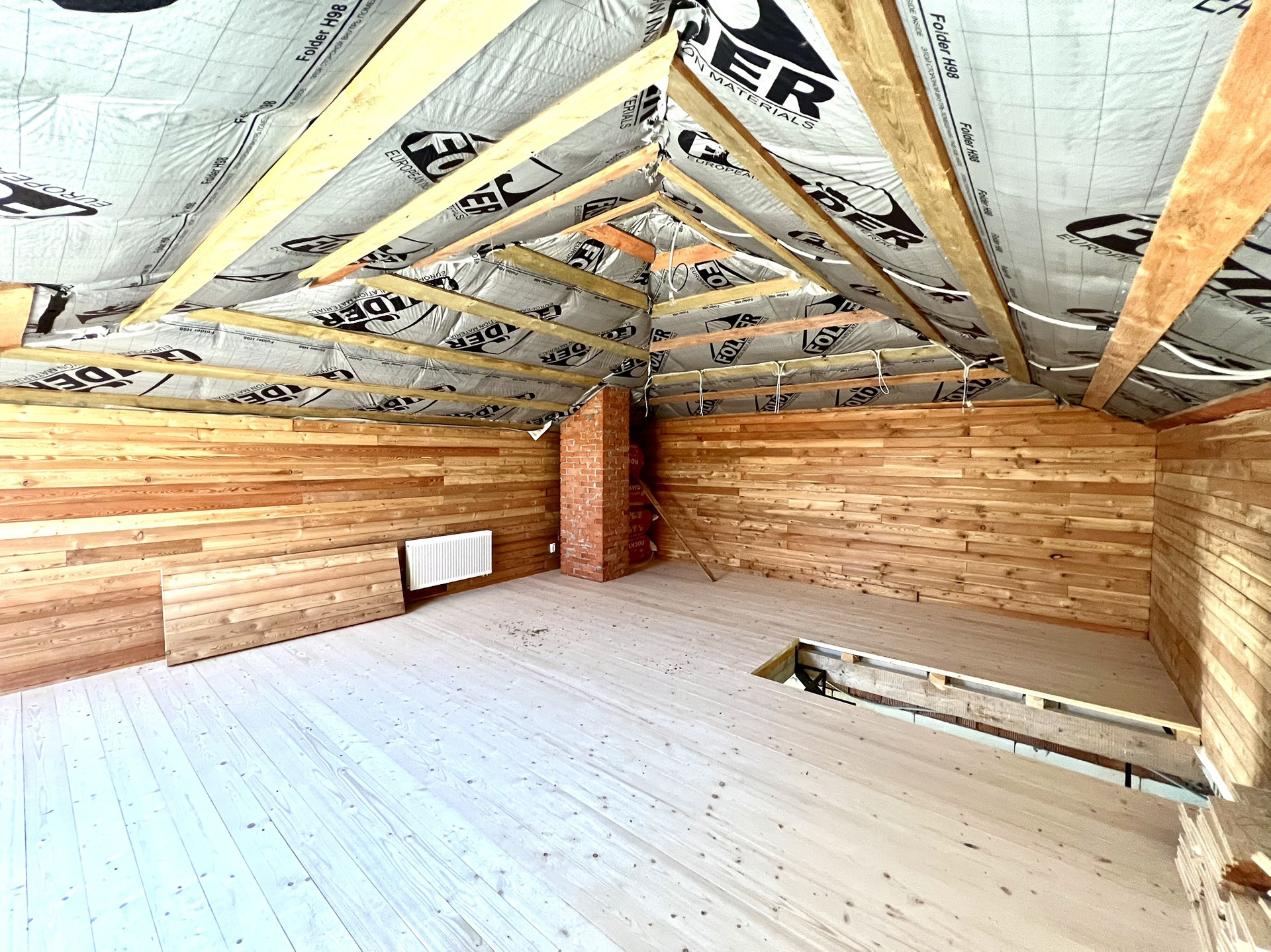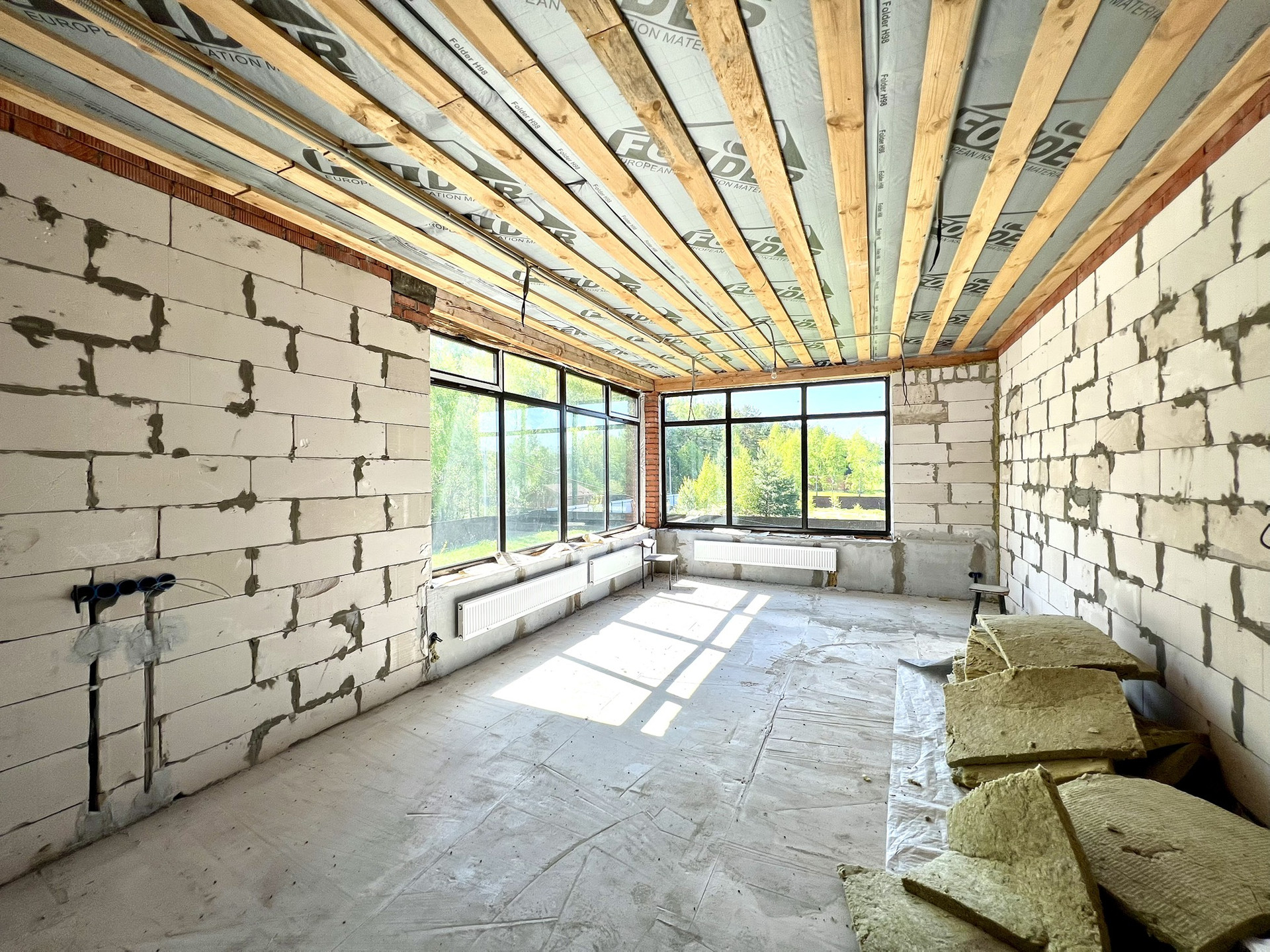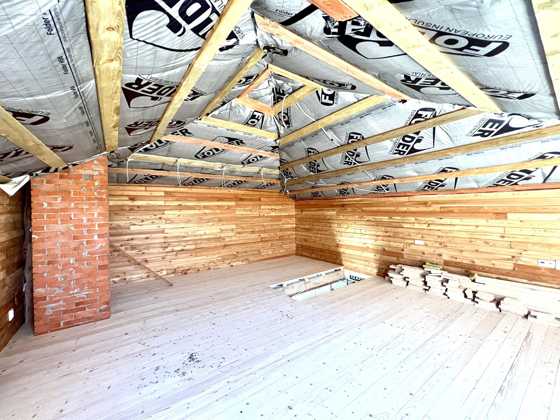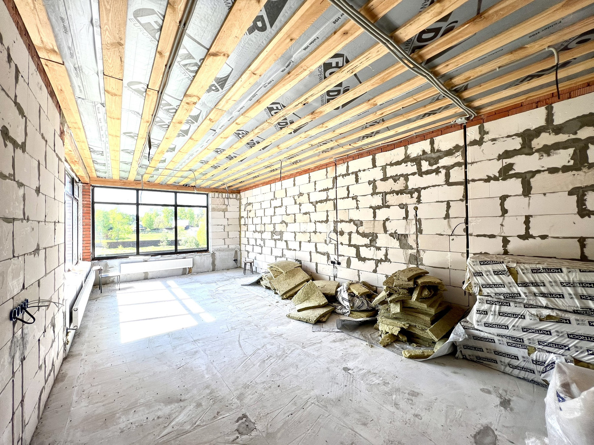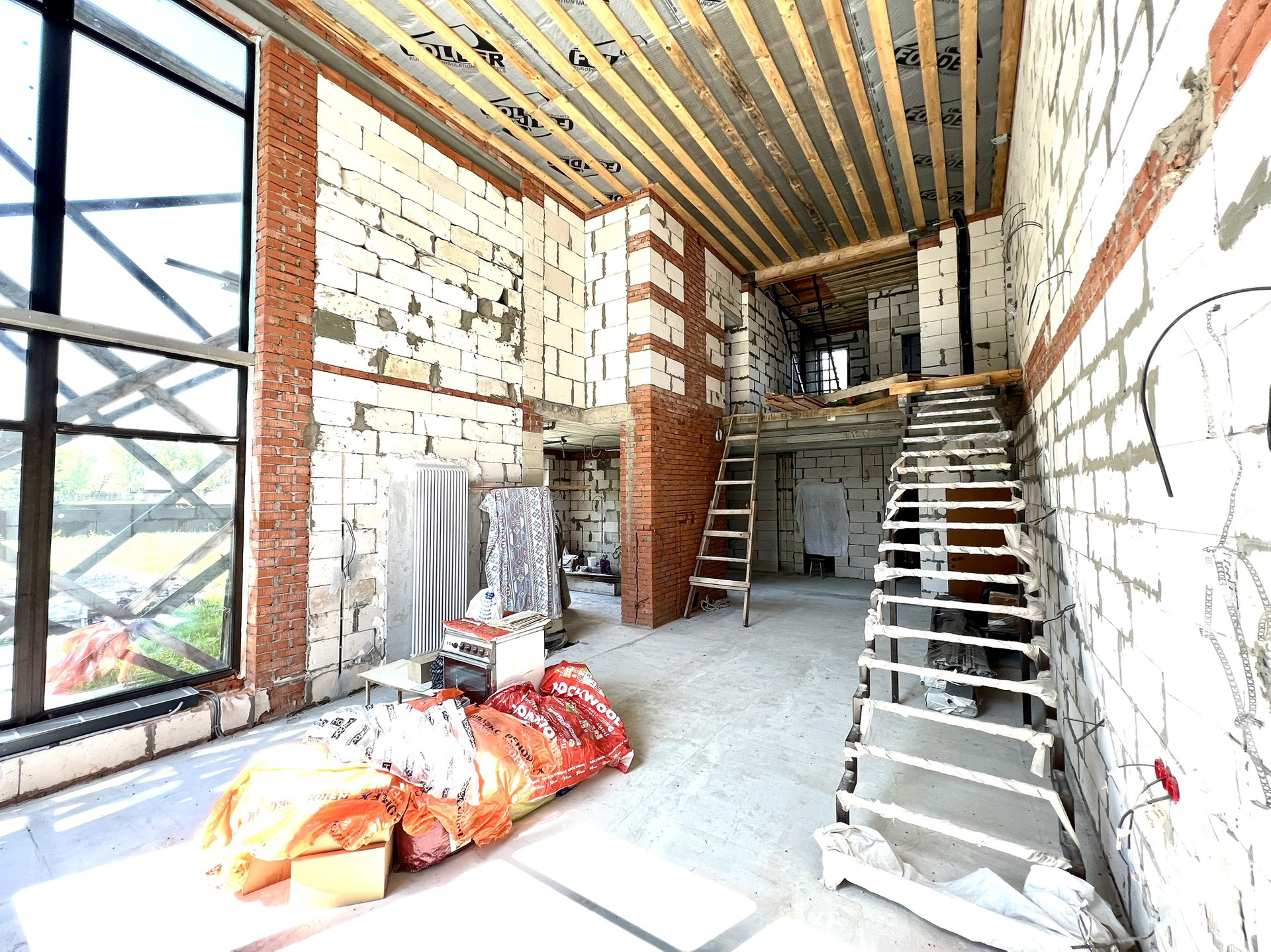 Перекрытия монолитные плиты + брусья. Крыша металлочерепица Grandline, очень хорошего качества. Под камин подготовлен дымоход.