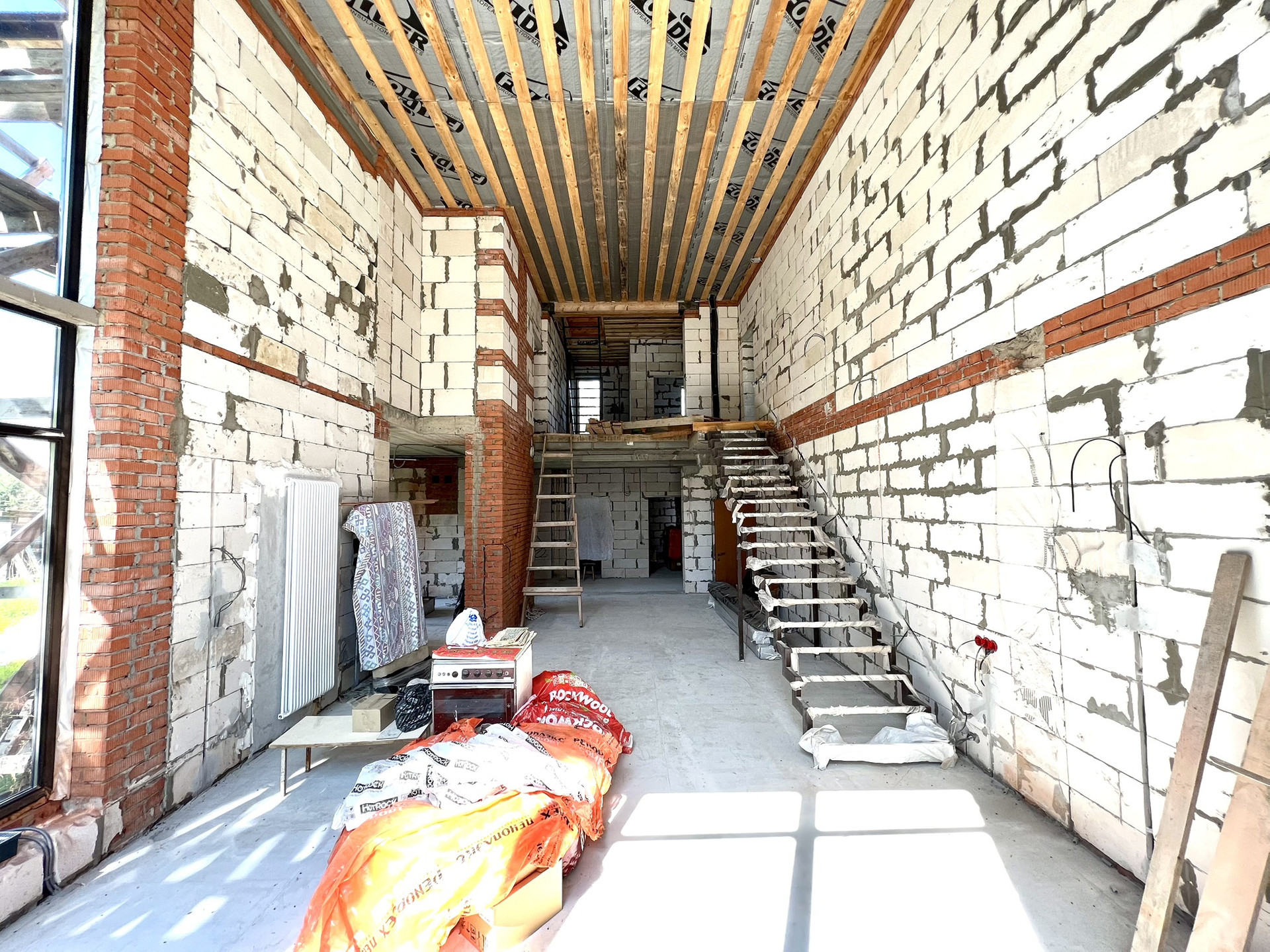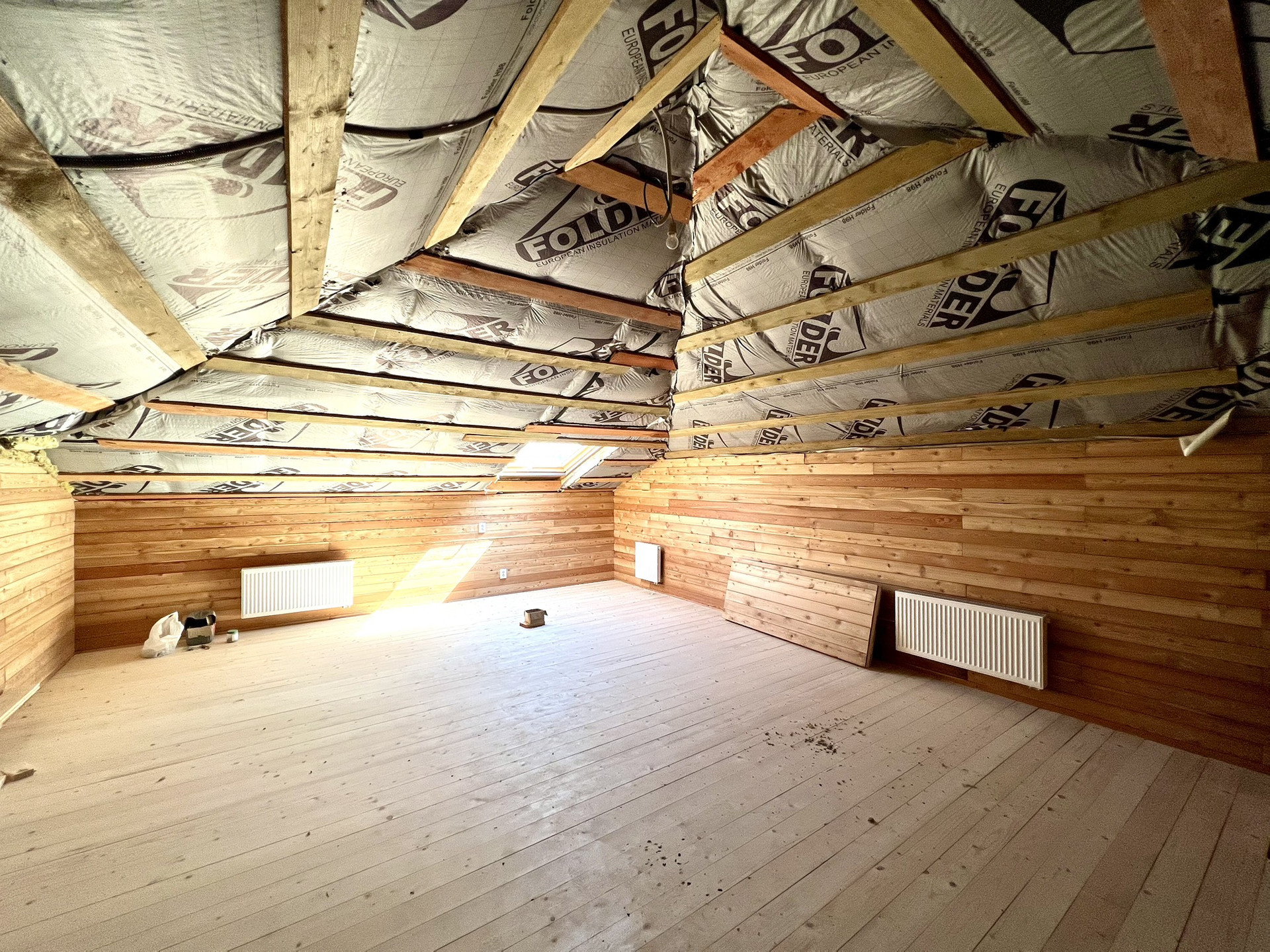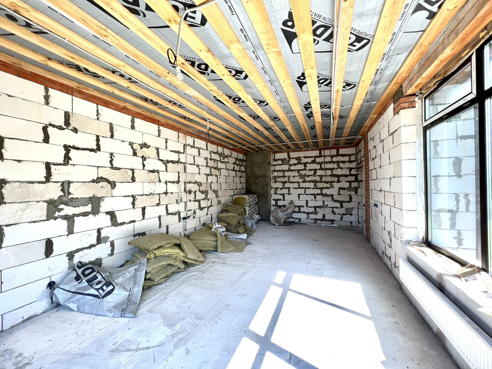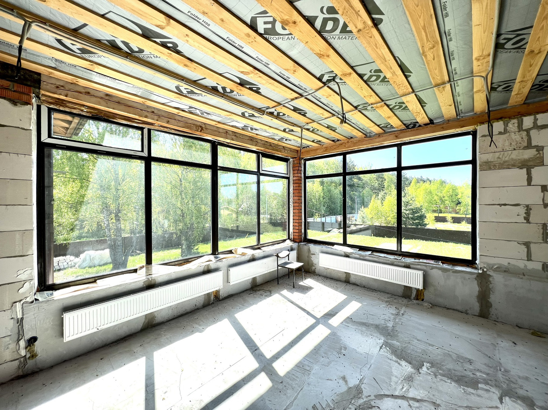 Перекрытия монолитные плиты + брусья. Крыша металлочерепица Grandline, очень хорошего качества. Под камин подготовлен дымоход.