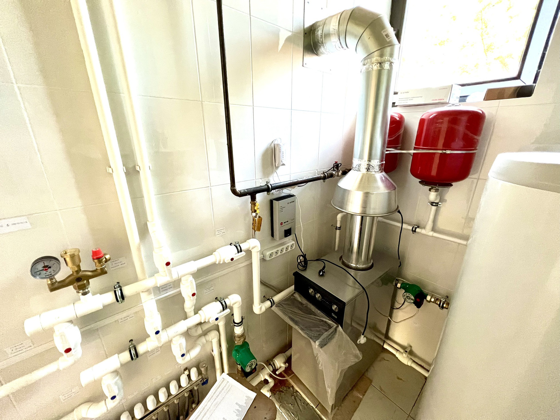 В коттедже 2 этажа + мансарда с отоплением, подвал. Высота потолков 3,4 метра. Панорамные окна с видом на участок и лес. Установлены окна REHAU. Газовый напольный котёл Baxi SLIM. Бойлер.