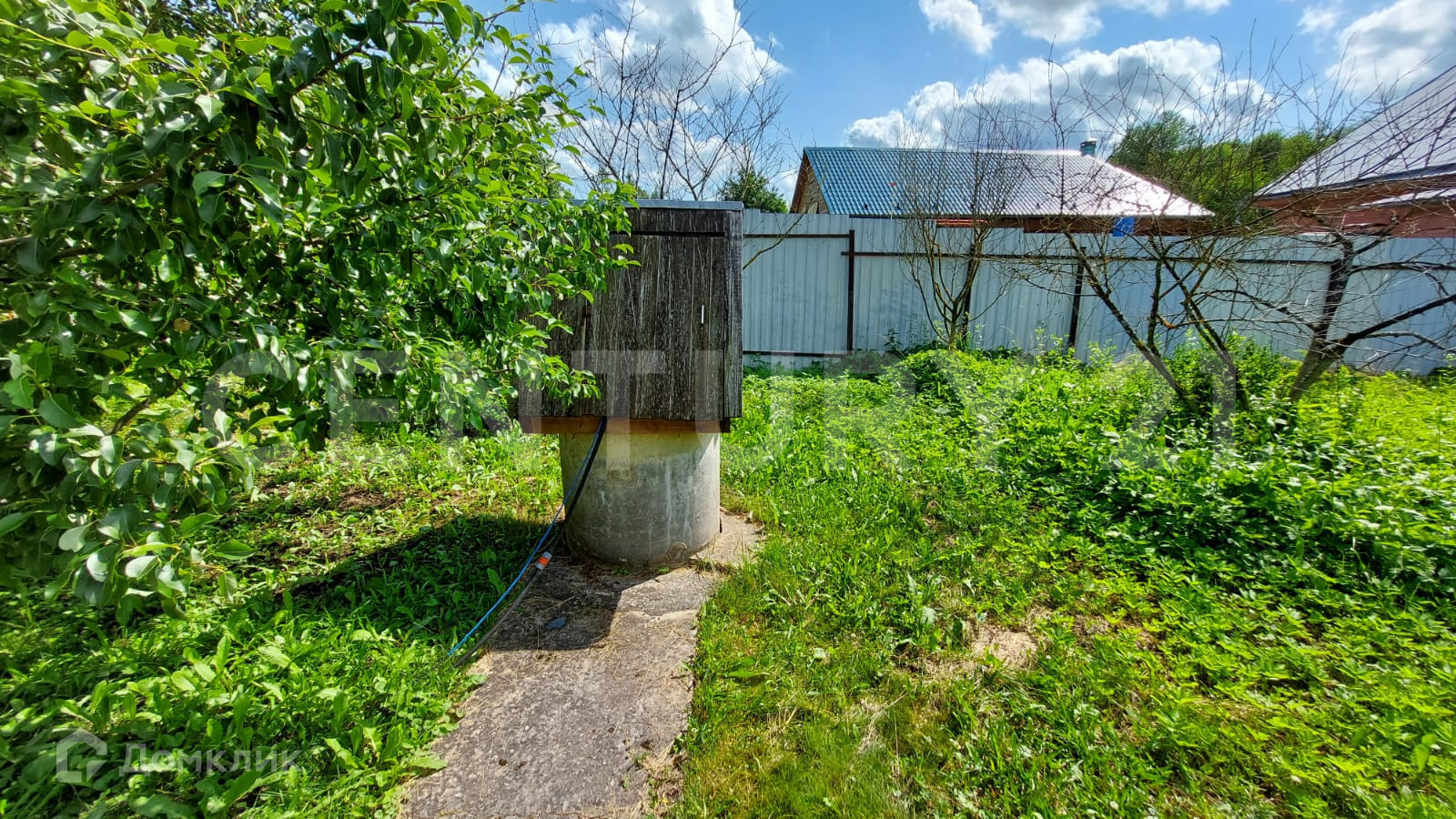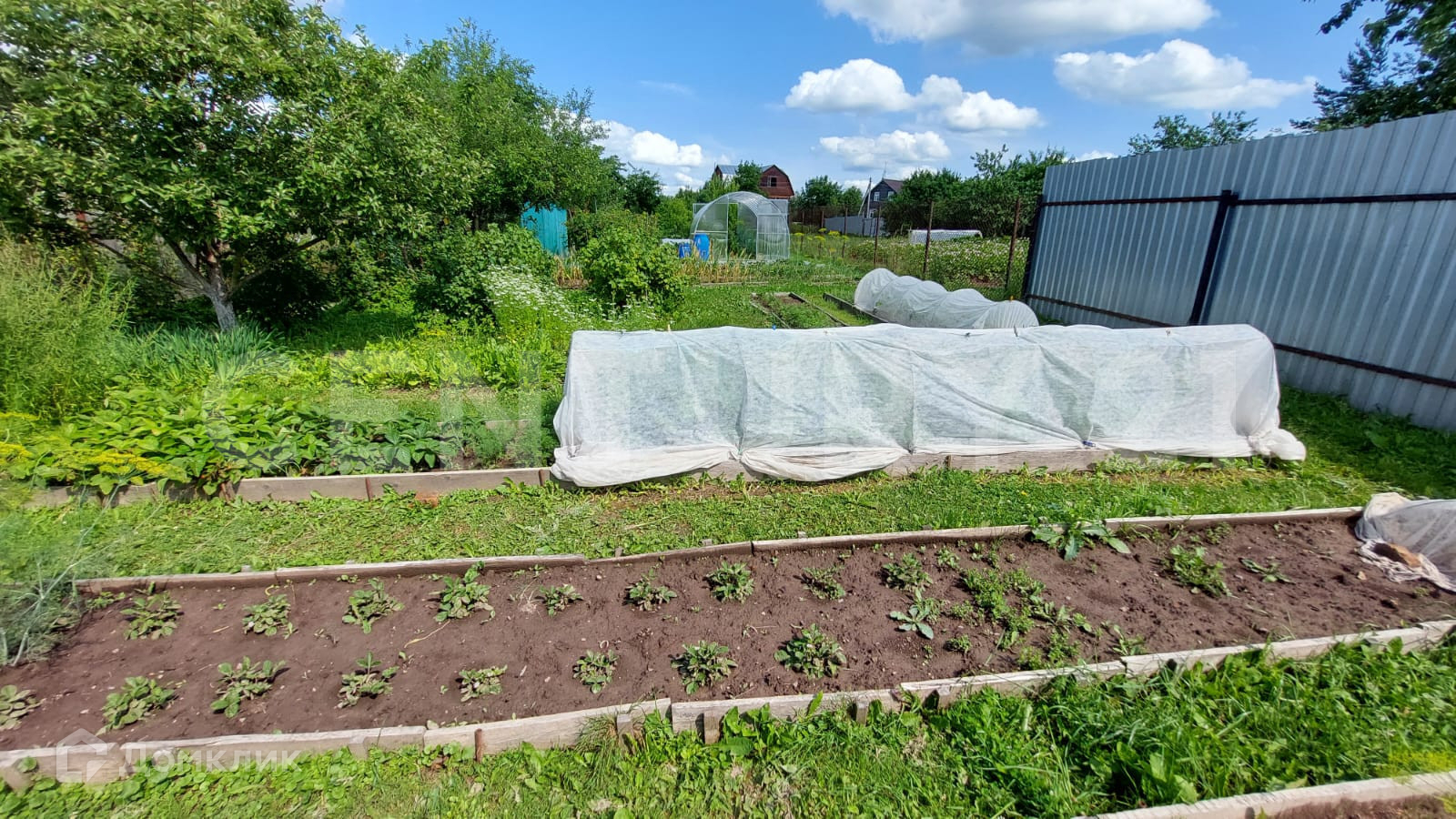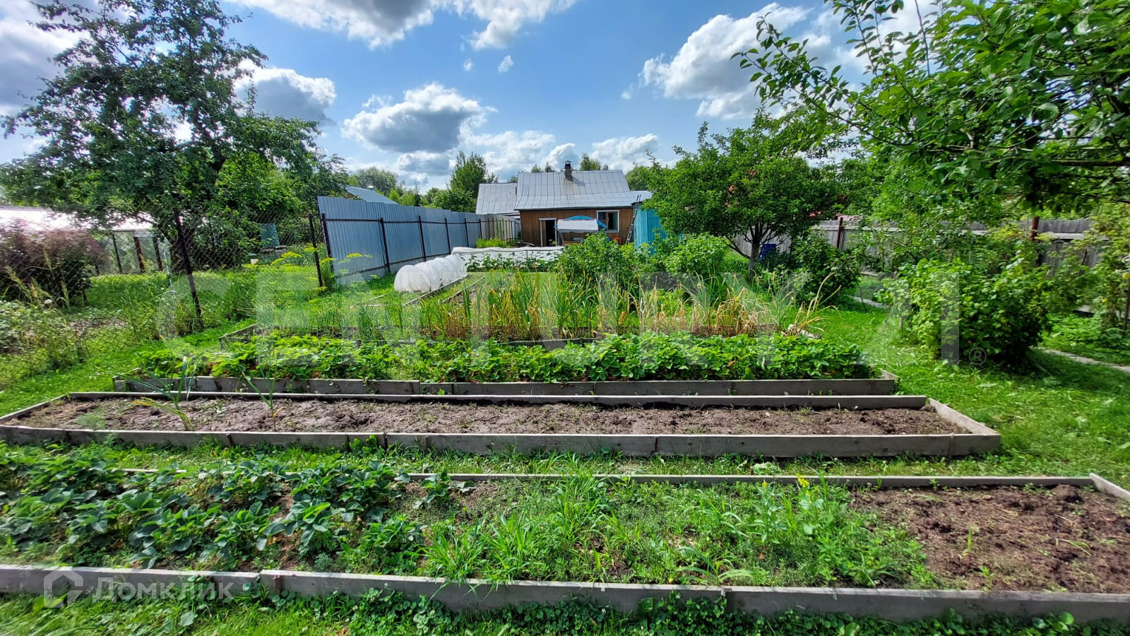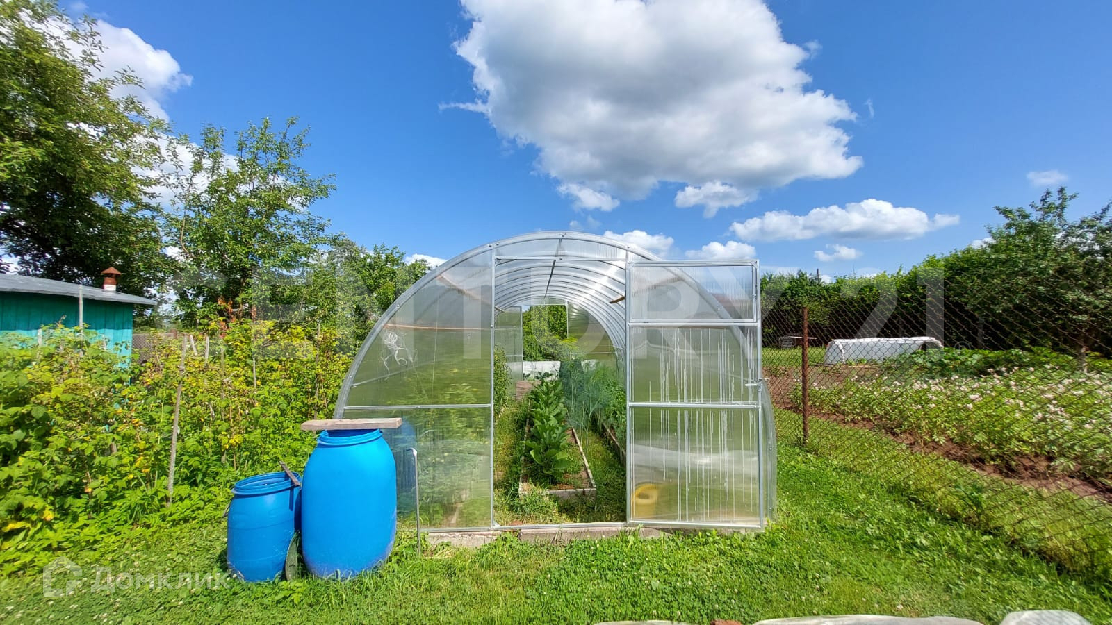 Земельный участок 15 соток имеет продолговатую форму, на нём расположен дом площадью 61,8 м2, новая теплица из поликарбоната, колодец, летний душ, туалет.