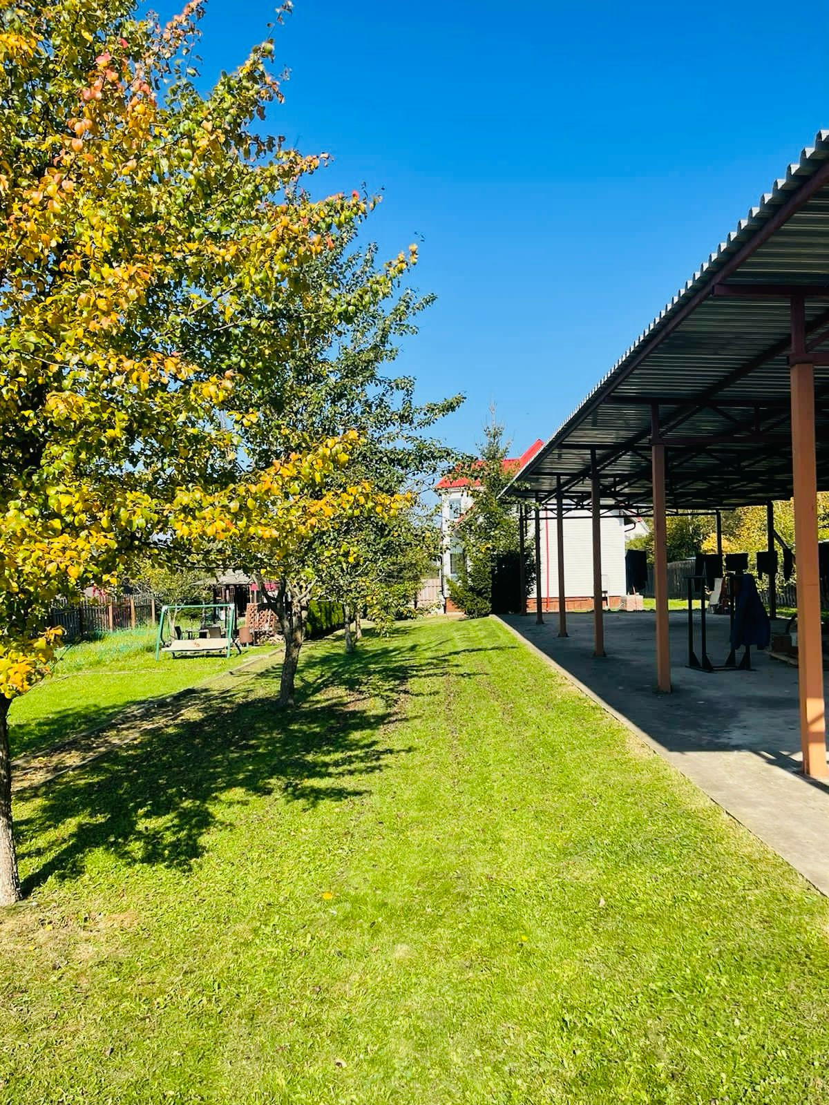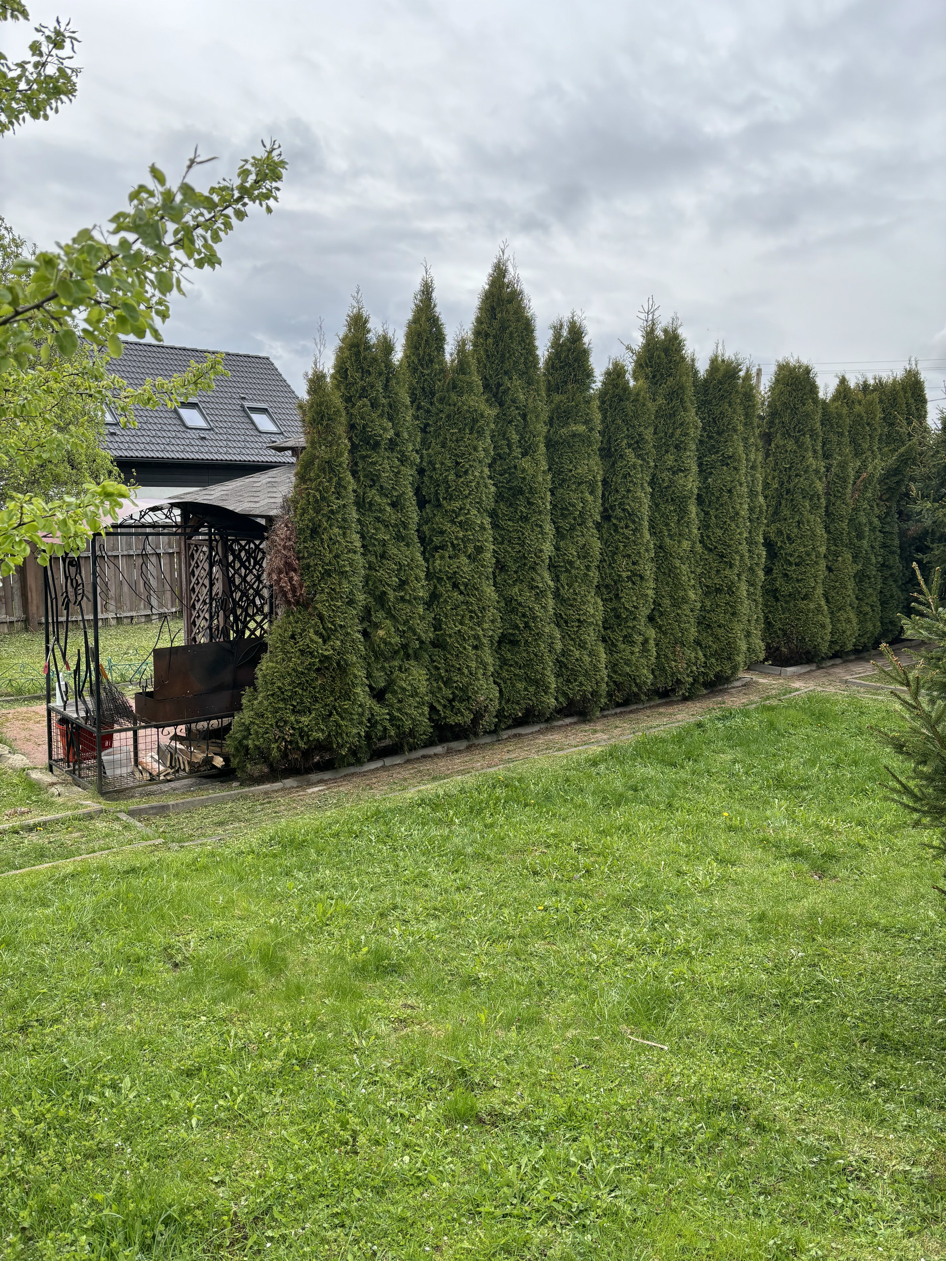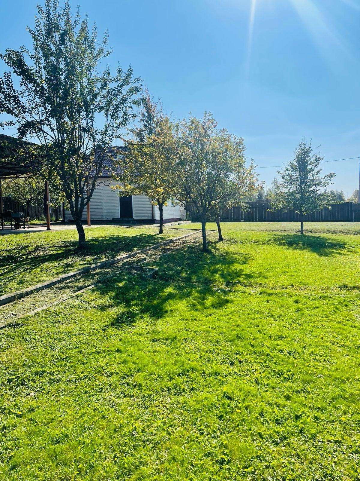Участок зонирован: огород, сад, отдых, детская площадка. Туи, яблони, вишни, цветы.