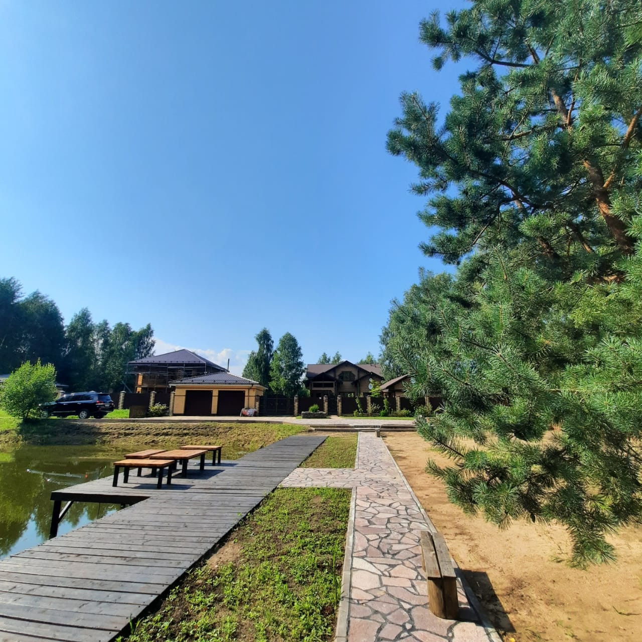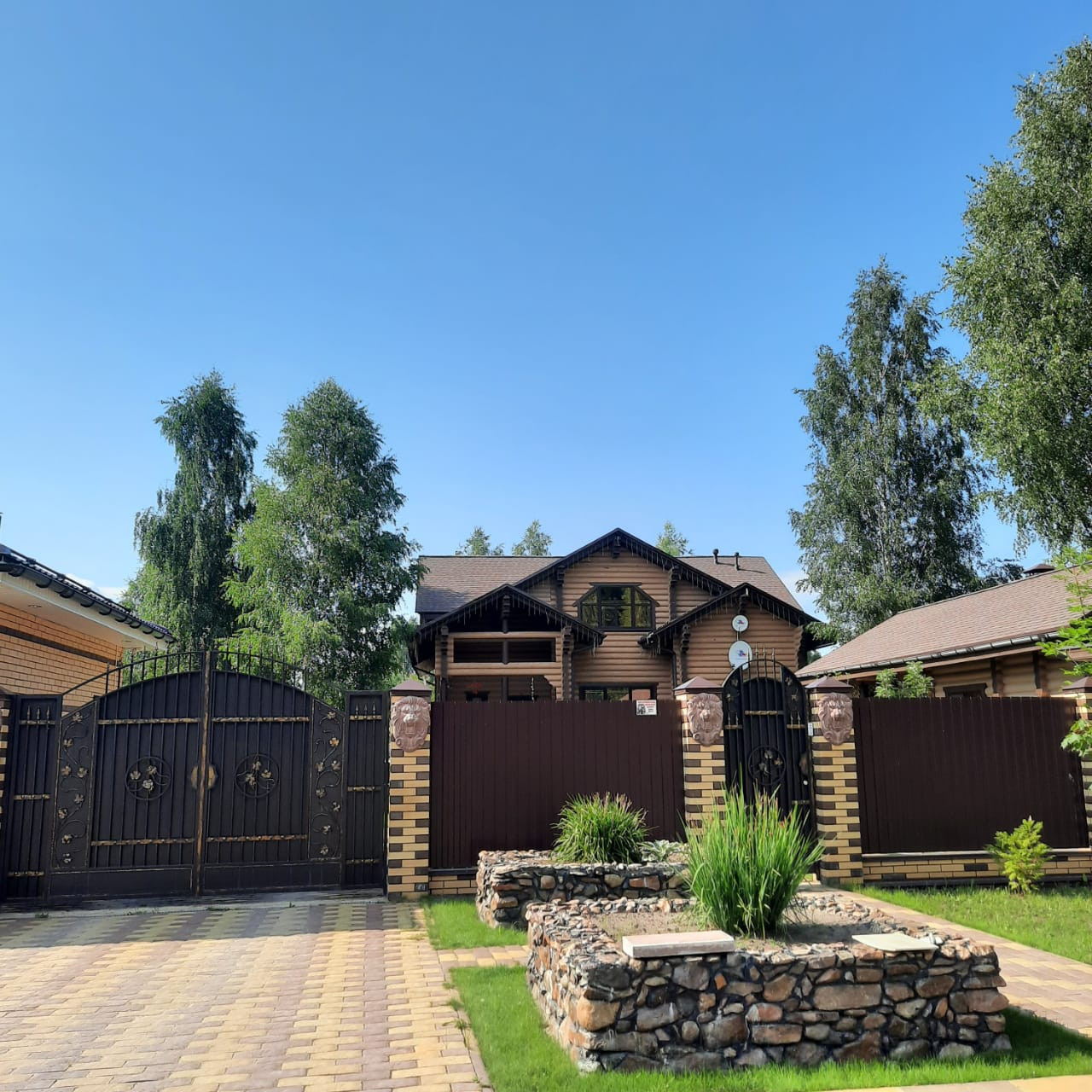 Участок полностью огорожен, автоматические ворота, растут цветы, хвойные и плодовые деревья, теплица и несколько грядок для души, тропинки вымощенные прир.камнем,вечернее освещение участка