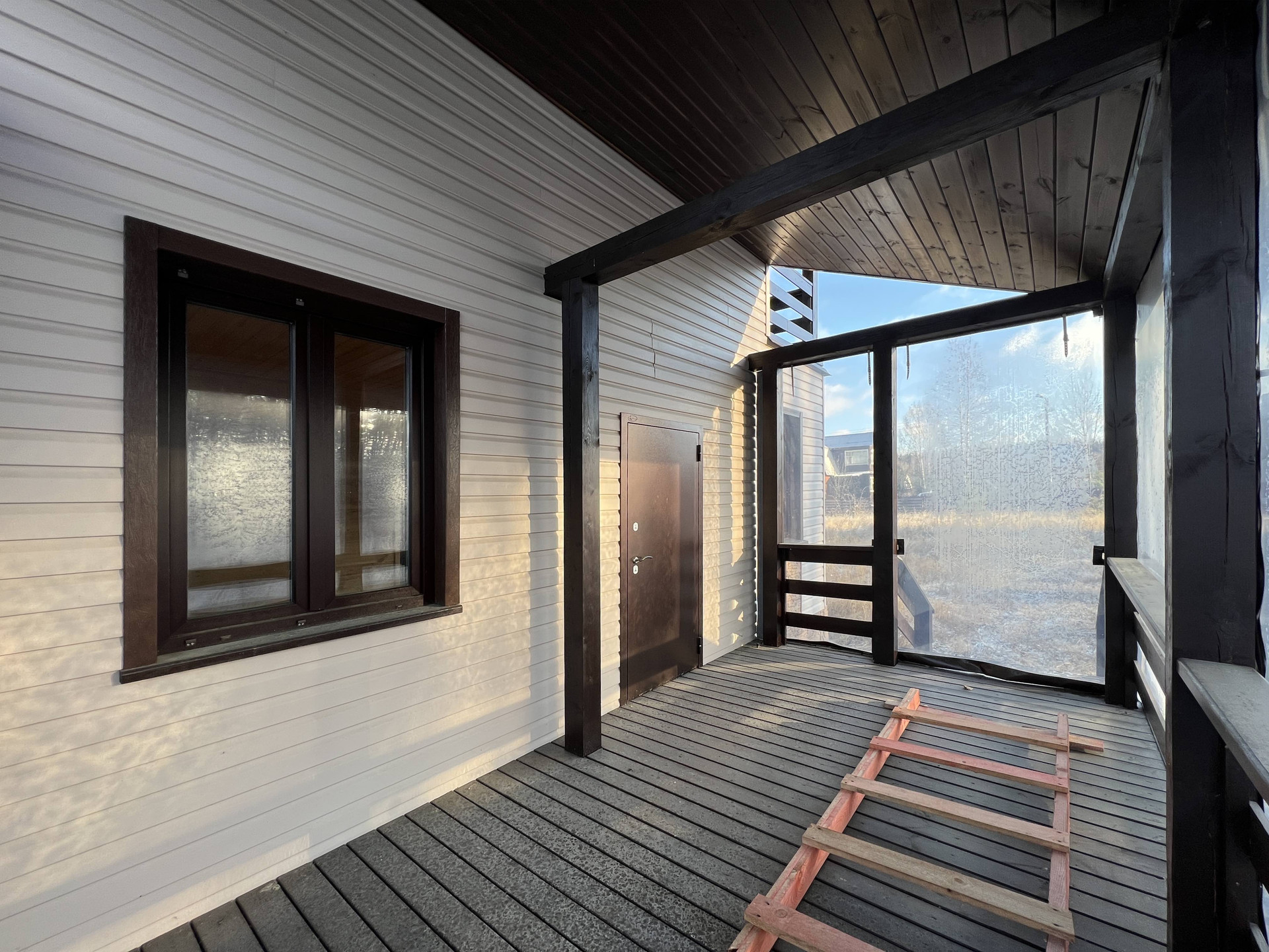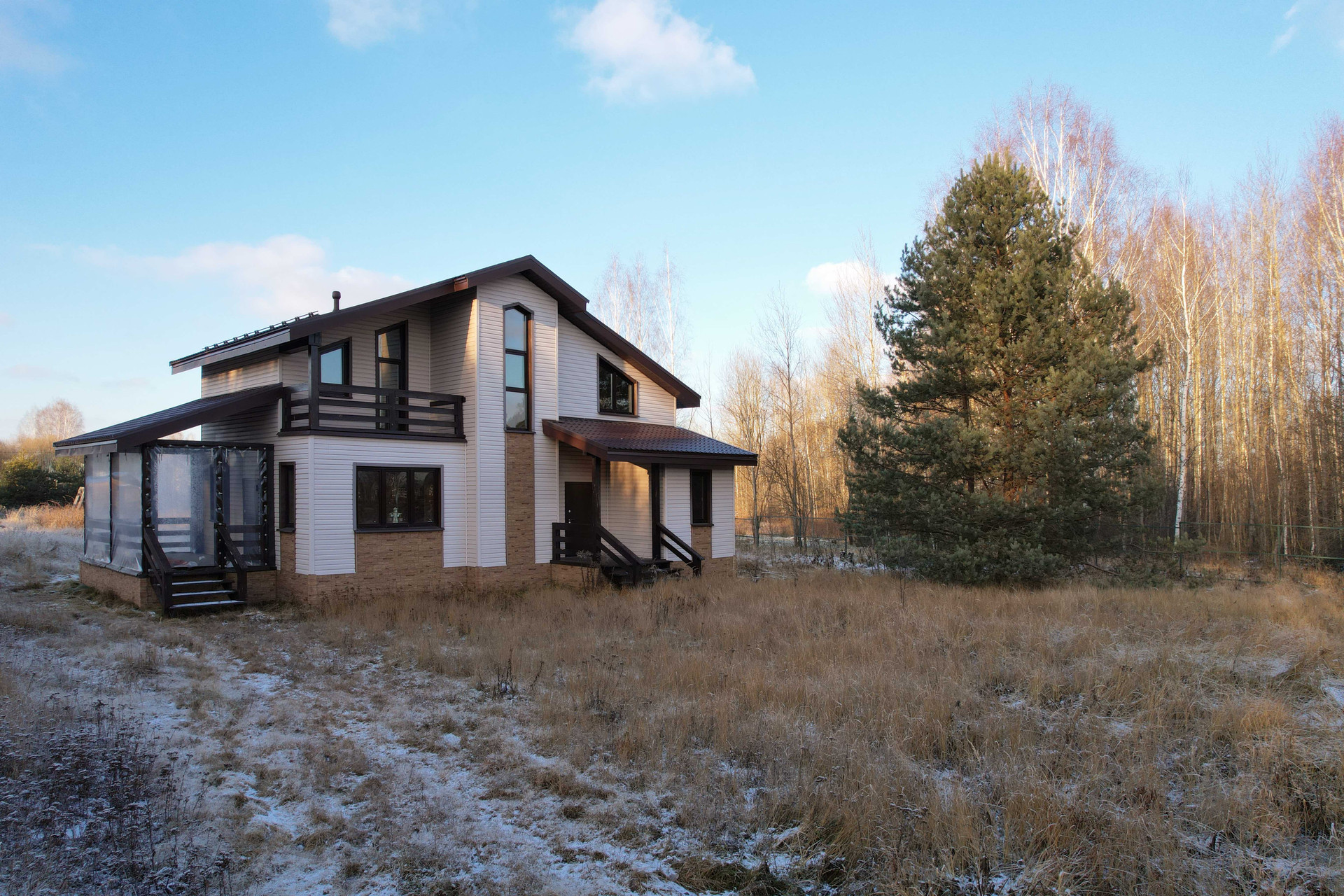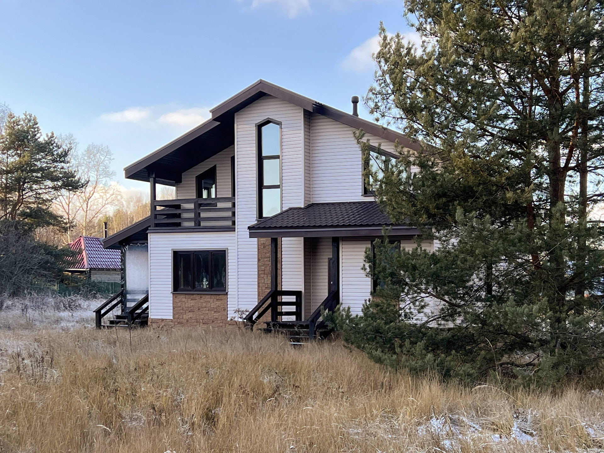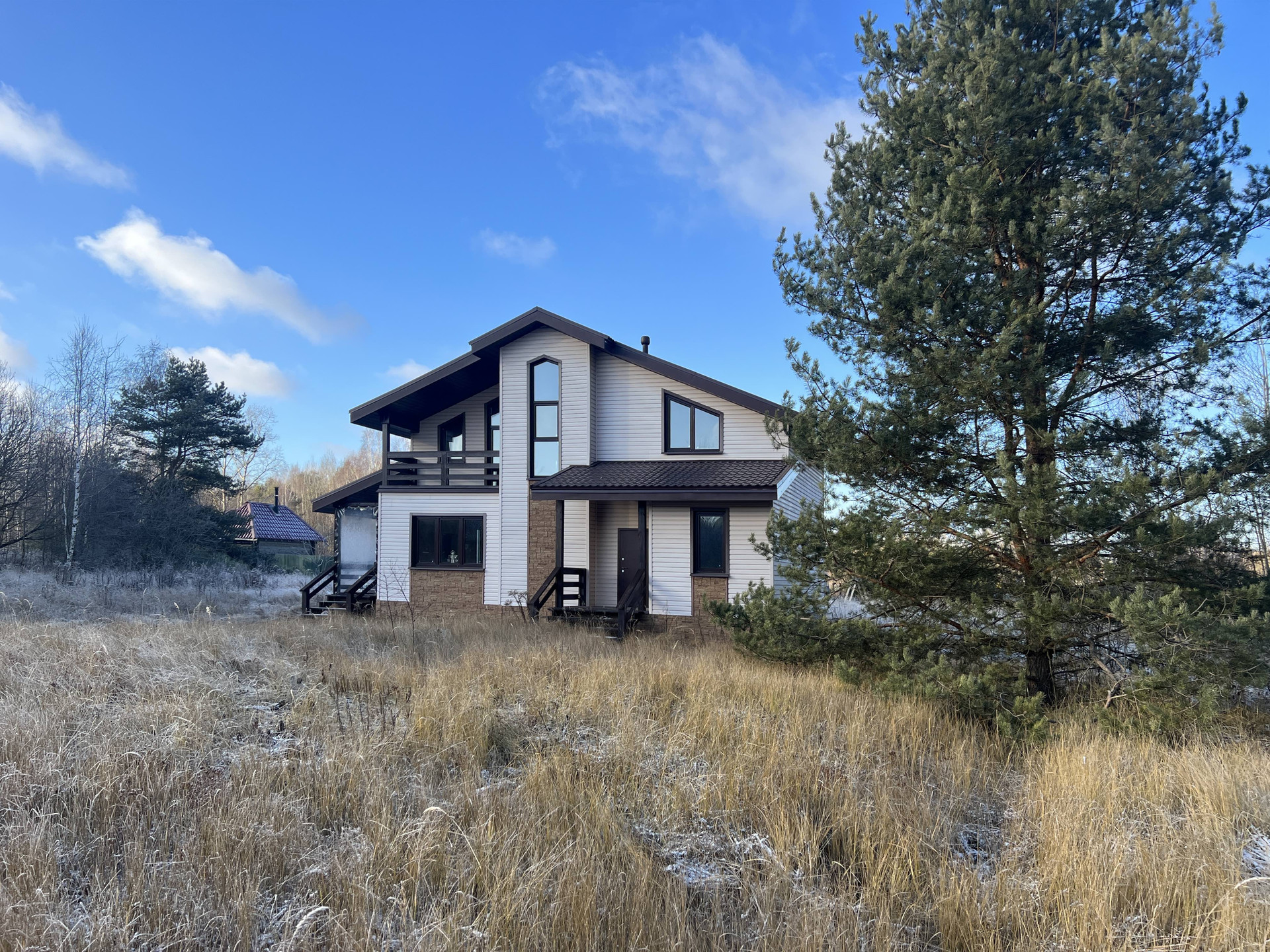 Новый каркасный дом с усиленными лагами и каркасом 200 мм стоит на свайно-винтовом фундаменте. Фасад облицован долговечным красивым сайдингом. Кровля металлочерепица со снегозадержателями. Внутри дома имитация бруса и хорошая половая доска. В стенах базальтовый утеплитель. Двухкамерные стеклопакеты с ламинацией под дерево. Лестница на металлическом каркасе.