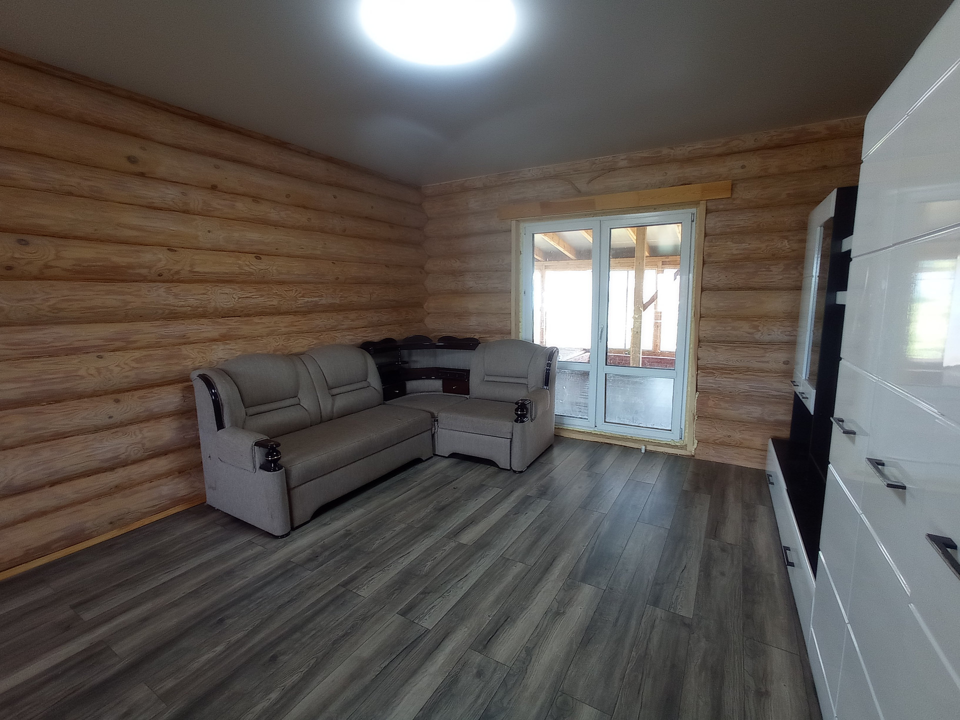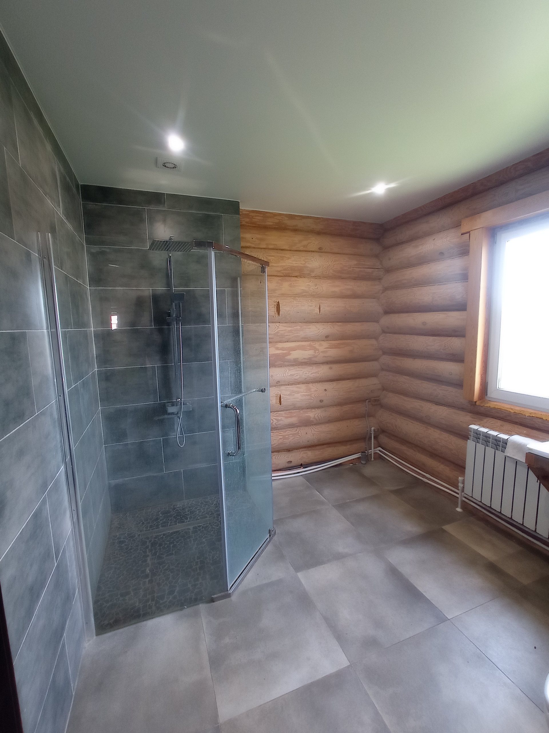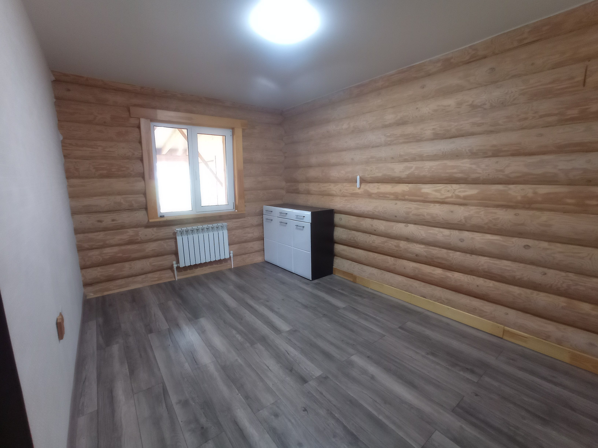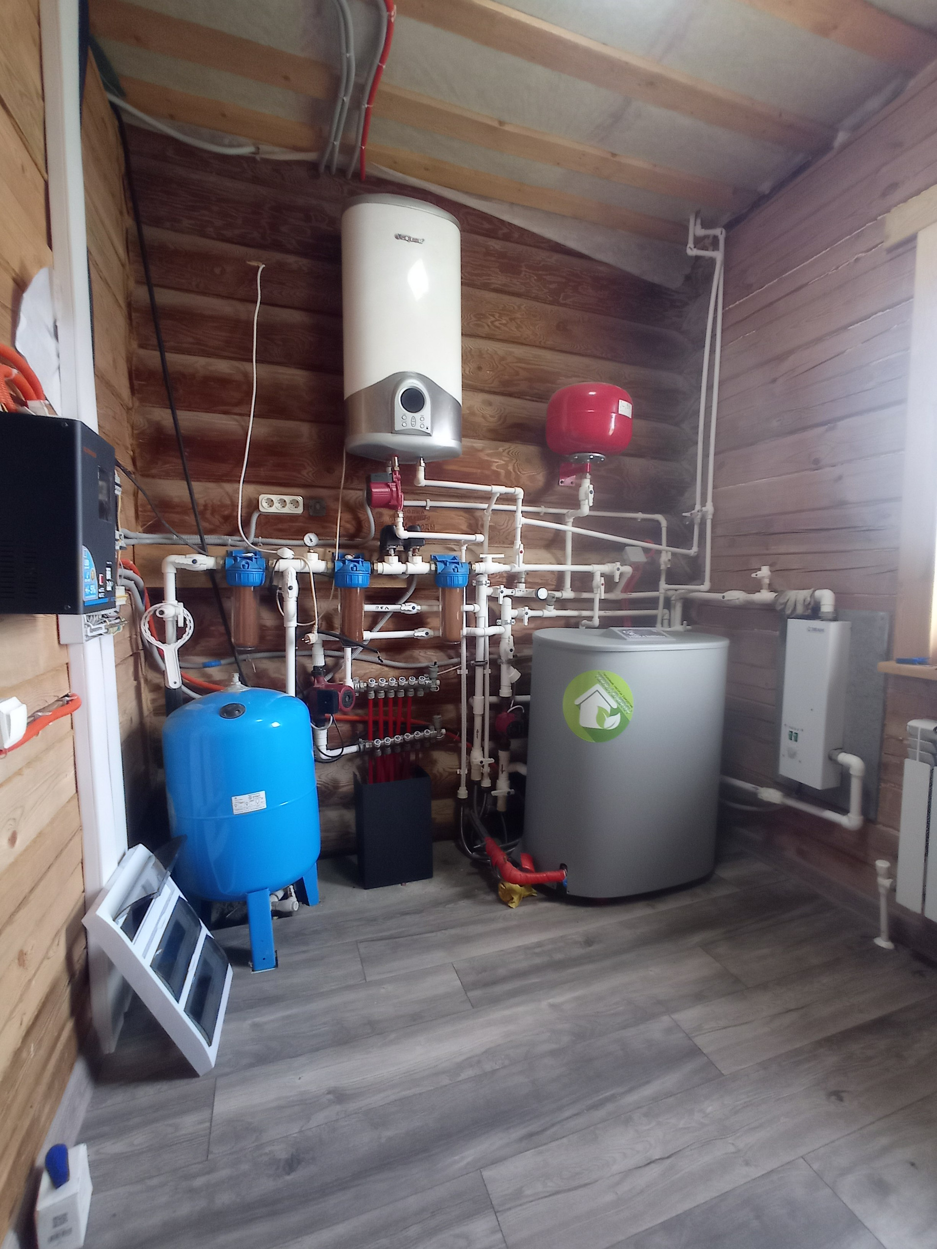 Дом построен из зимнего леса и не дает усадки. Отапливается дом с помощью жидкостного теплого пола, который нагревается тепловым насосом, а также в системе для подстраховки есть электрический котел.