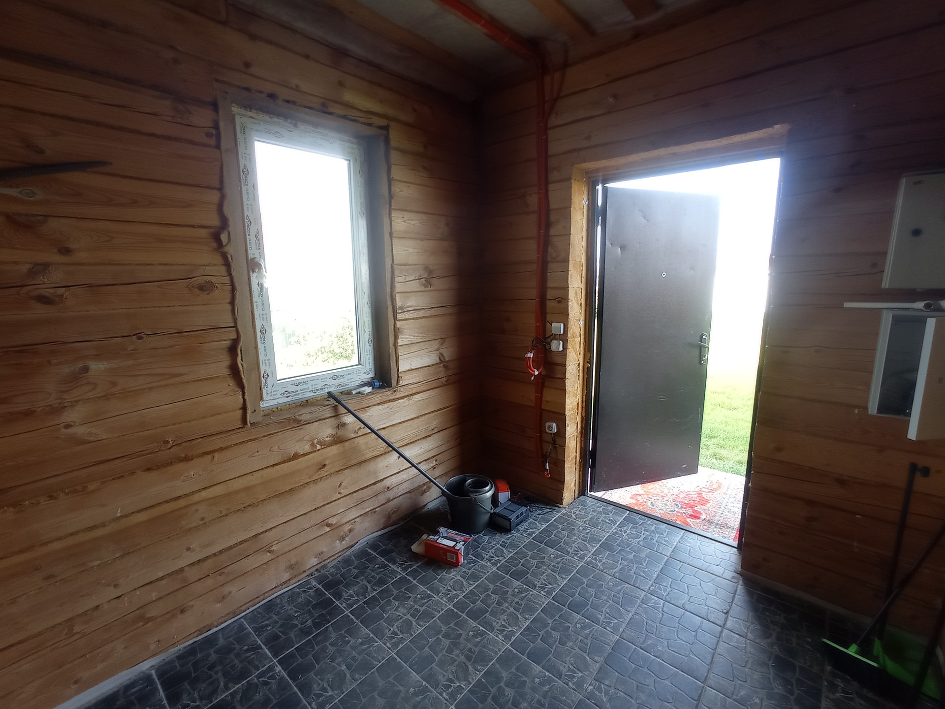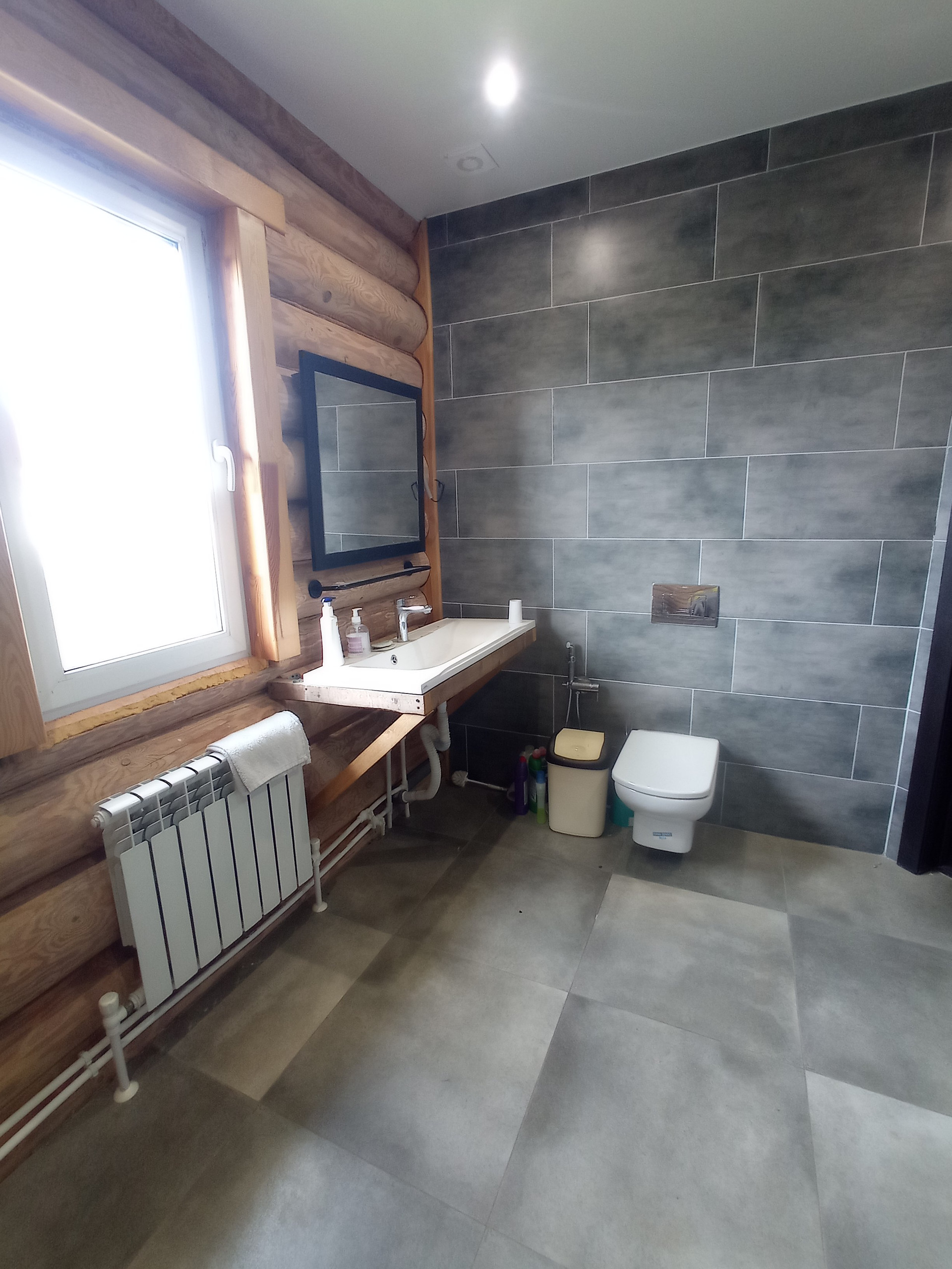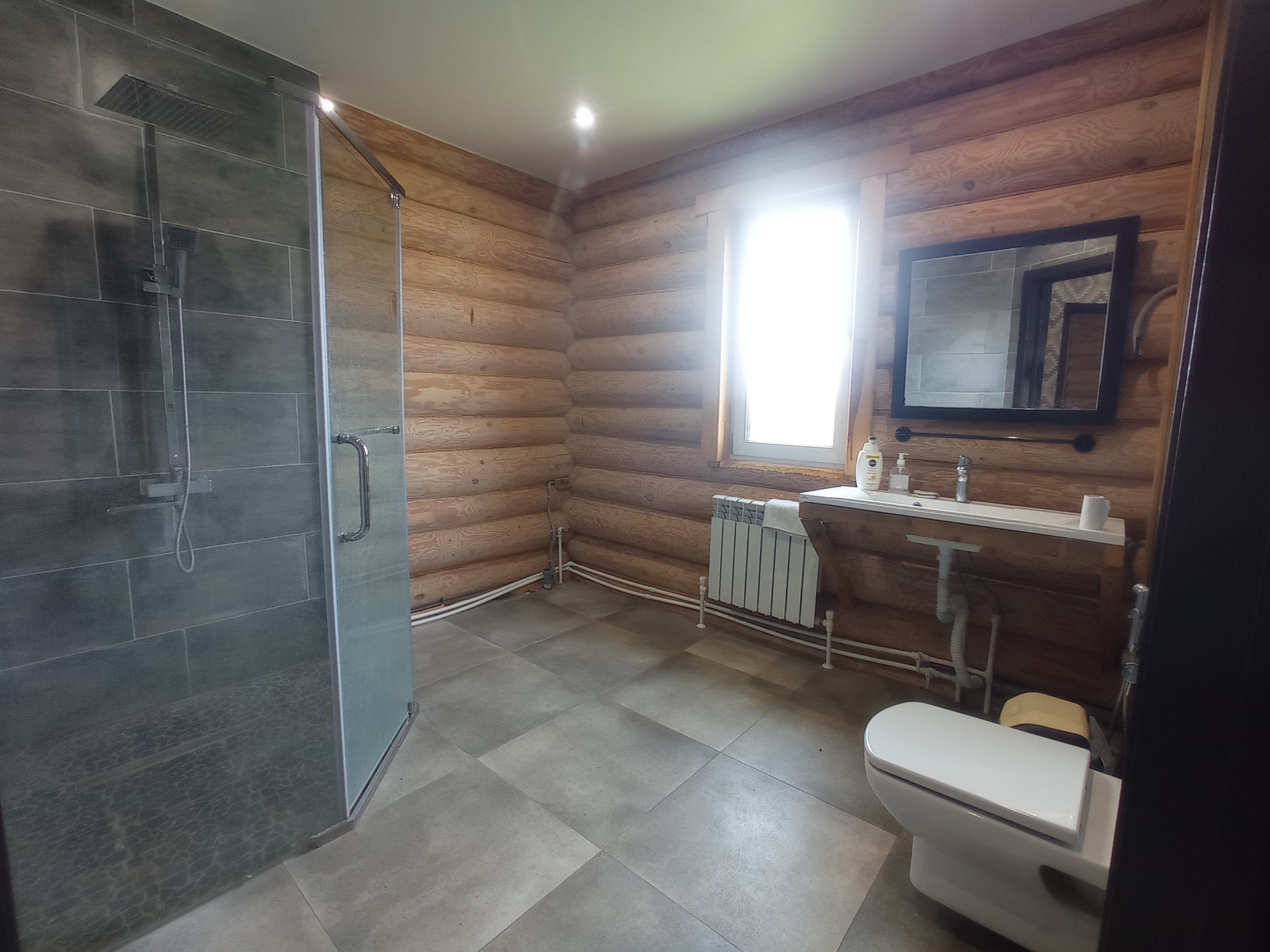 Дом построен из зимнего леса и не дает усадки. Отапливается дом с помощью жидкостного теплого пола, который нагревается тепловым насосом, а также в системе для подстраховки есть электрический котел.