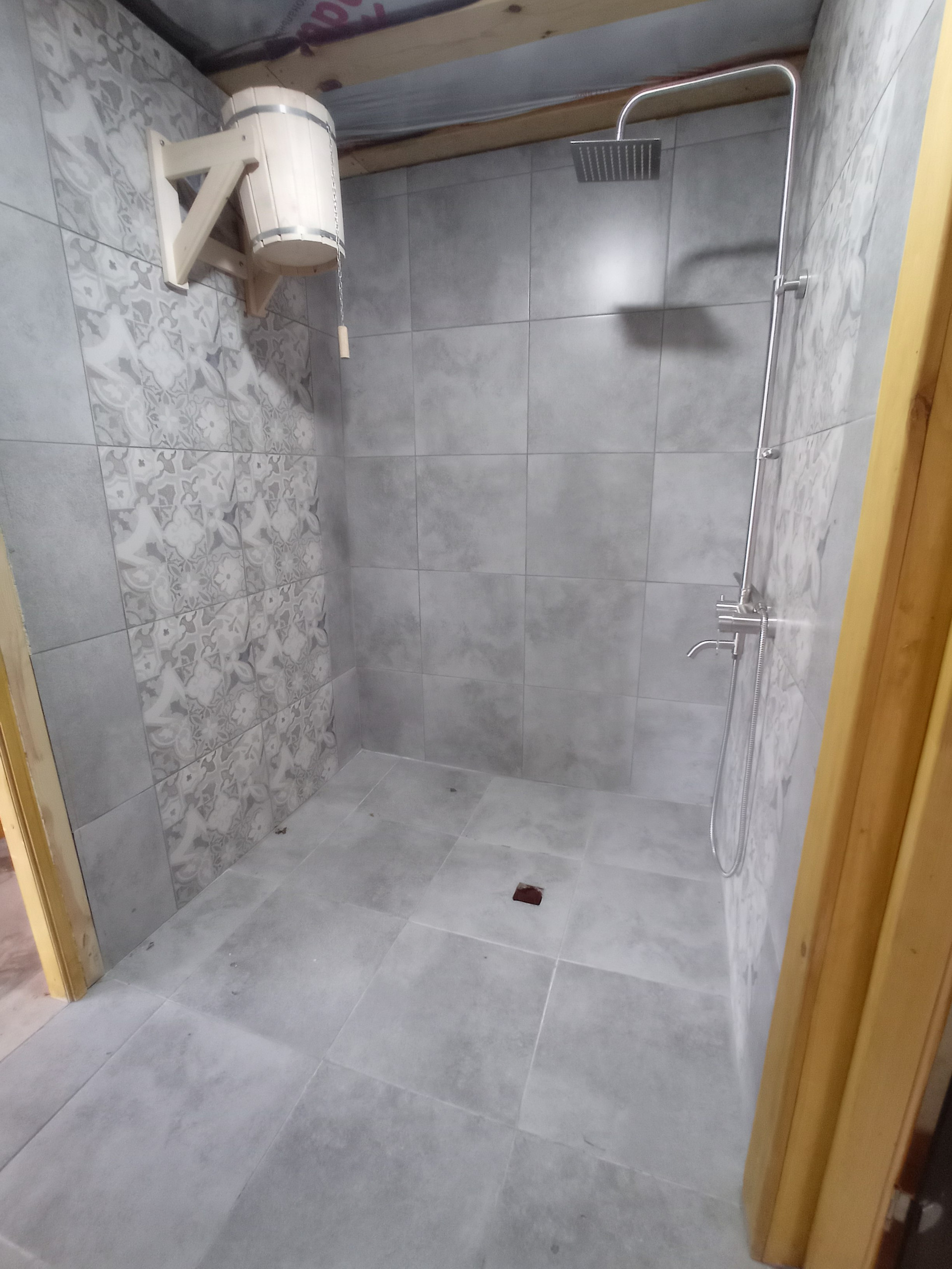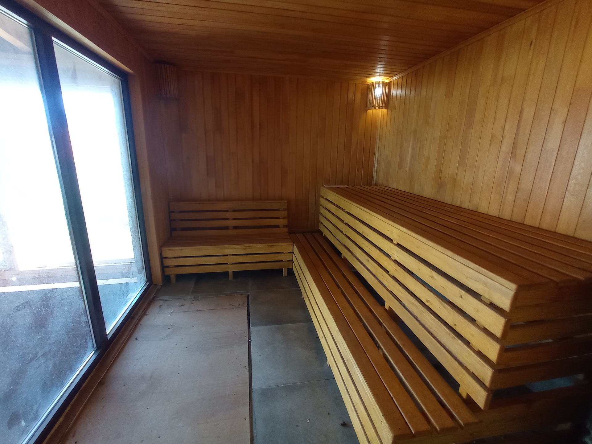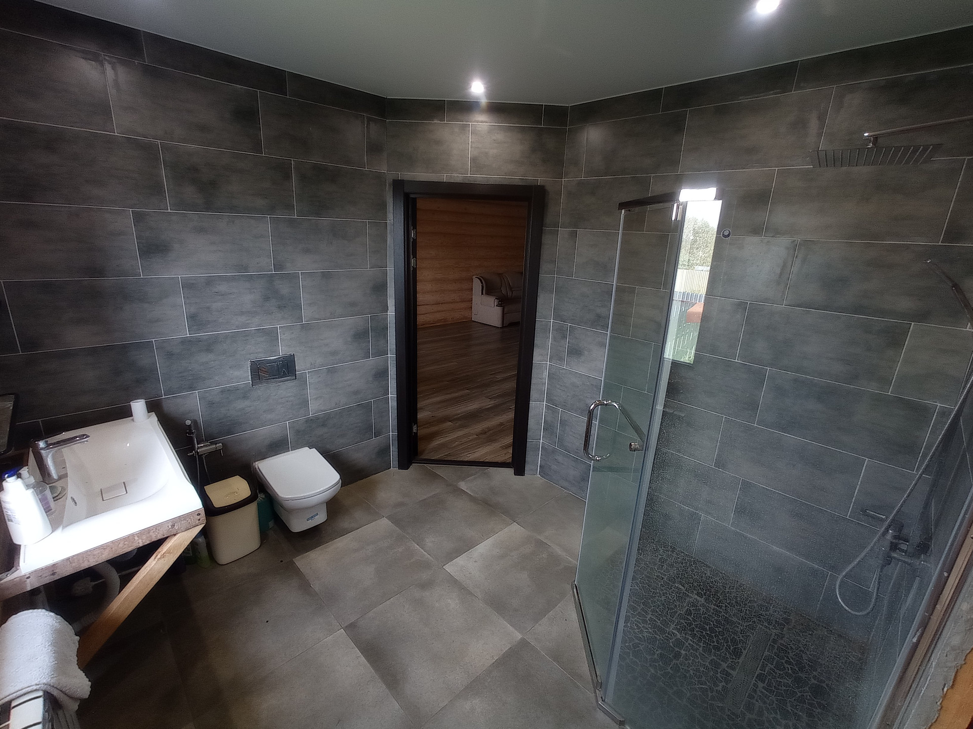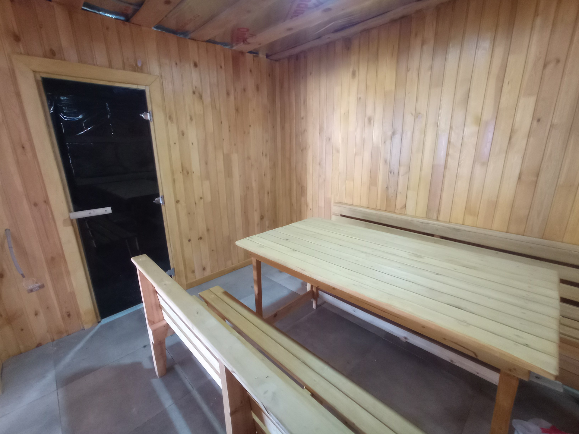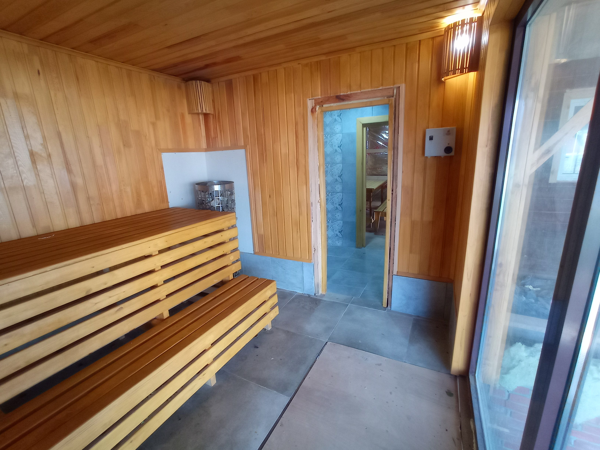 Баня с электрической каменкой, в бане есть туалет, комната отдыха, моечное отделение, парная с панорамным окном из закаленного стекла.