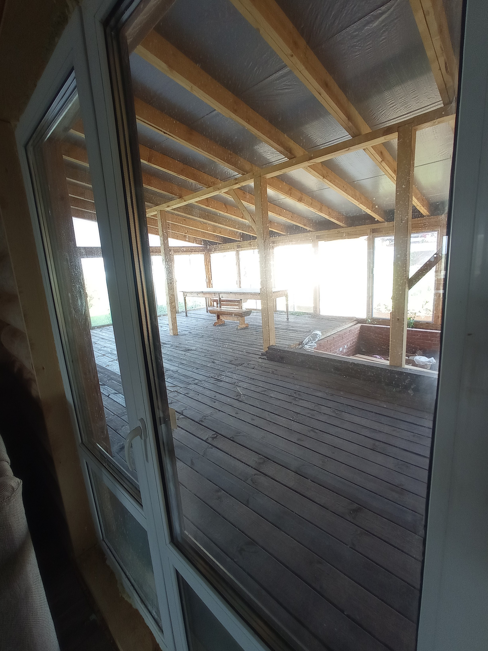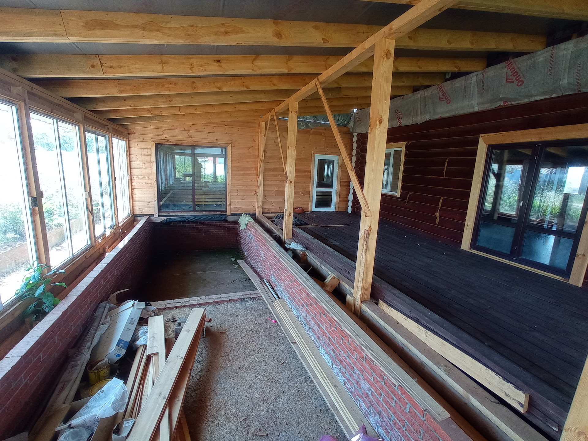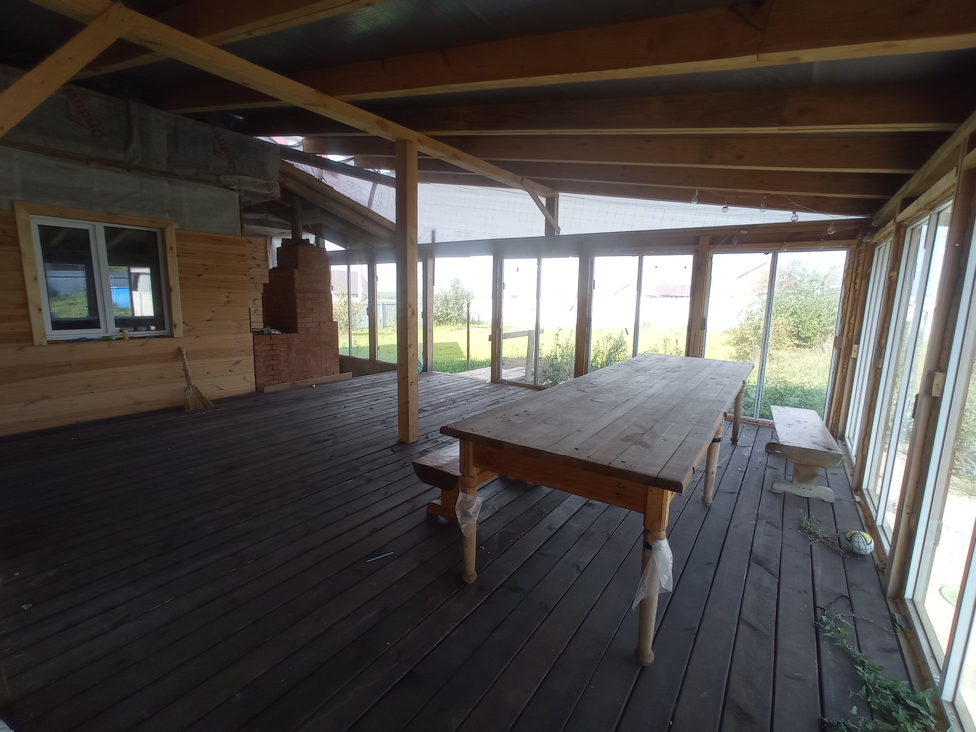 Из гостиной через распашную дверь вы попадаете на застекленную террасу площадью более 100 кв.м., с бассейном размером 8*3 метра.