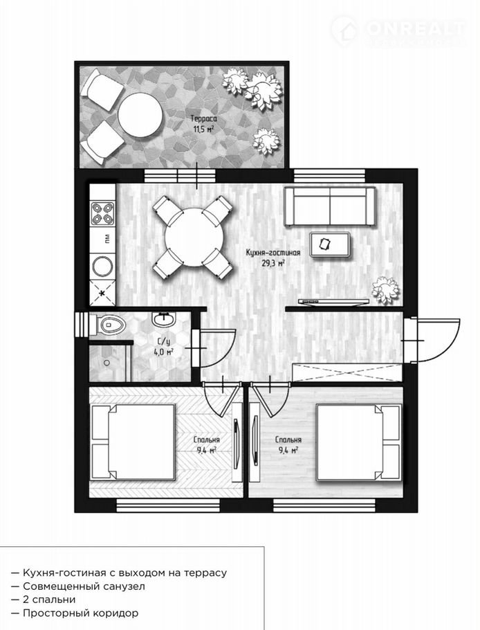 - Планировка: 2 спальни (по 9,4 м²), кухня-гостиная (29,3 м²), совмещенный санузел.