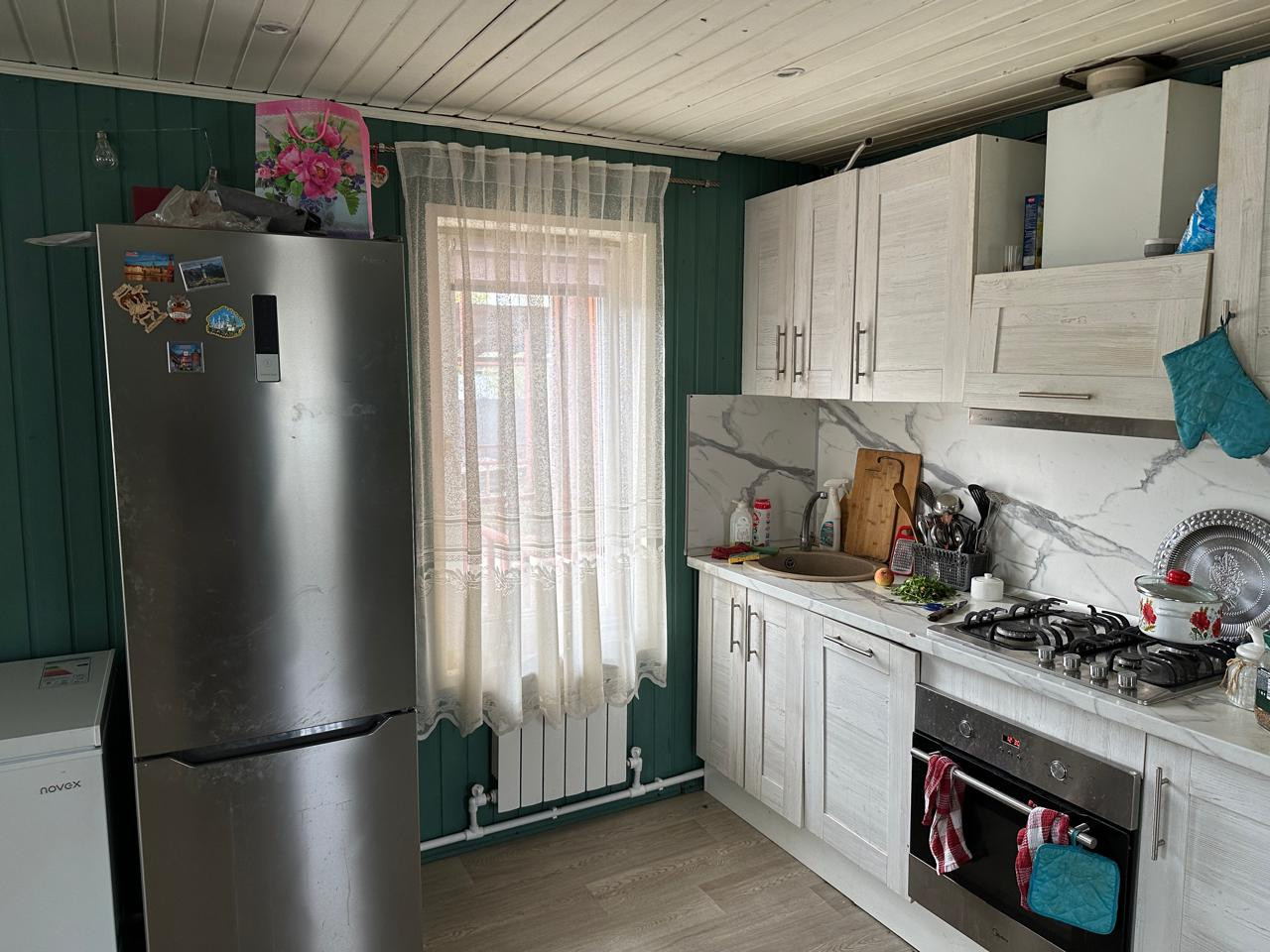 Продается 1 этажный дом. Дом из цельного бревна, санузел в доме,  совмещен, большая кухня- гостиная , спальня, бойлерная, кладовая. Газ, электричество центральные, вода - колодец, канализация - септик. На участке растут плодовые деревья и кусты, стоит гараж 5*6 кирпичный, отштукатурен  с двух сторон, летняя кухня с водопроводом, газом и электричеством. Огорожен профлистом на фундаменте, откатные ворота. 1 взрослый собственник, подходит под ипотеку.
