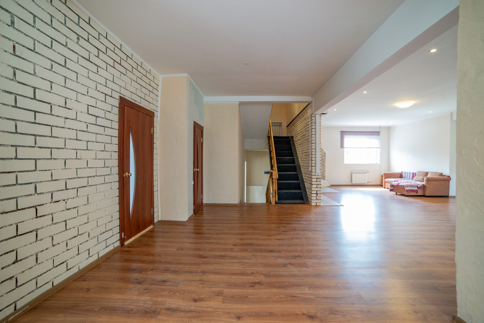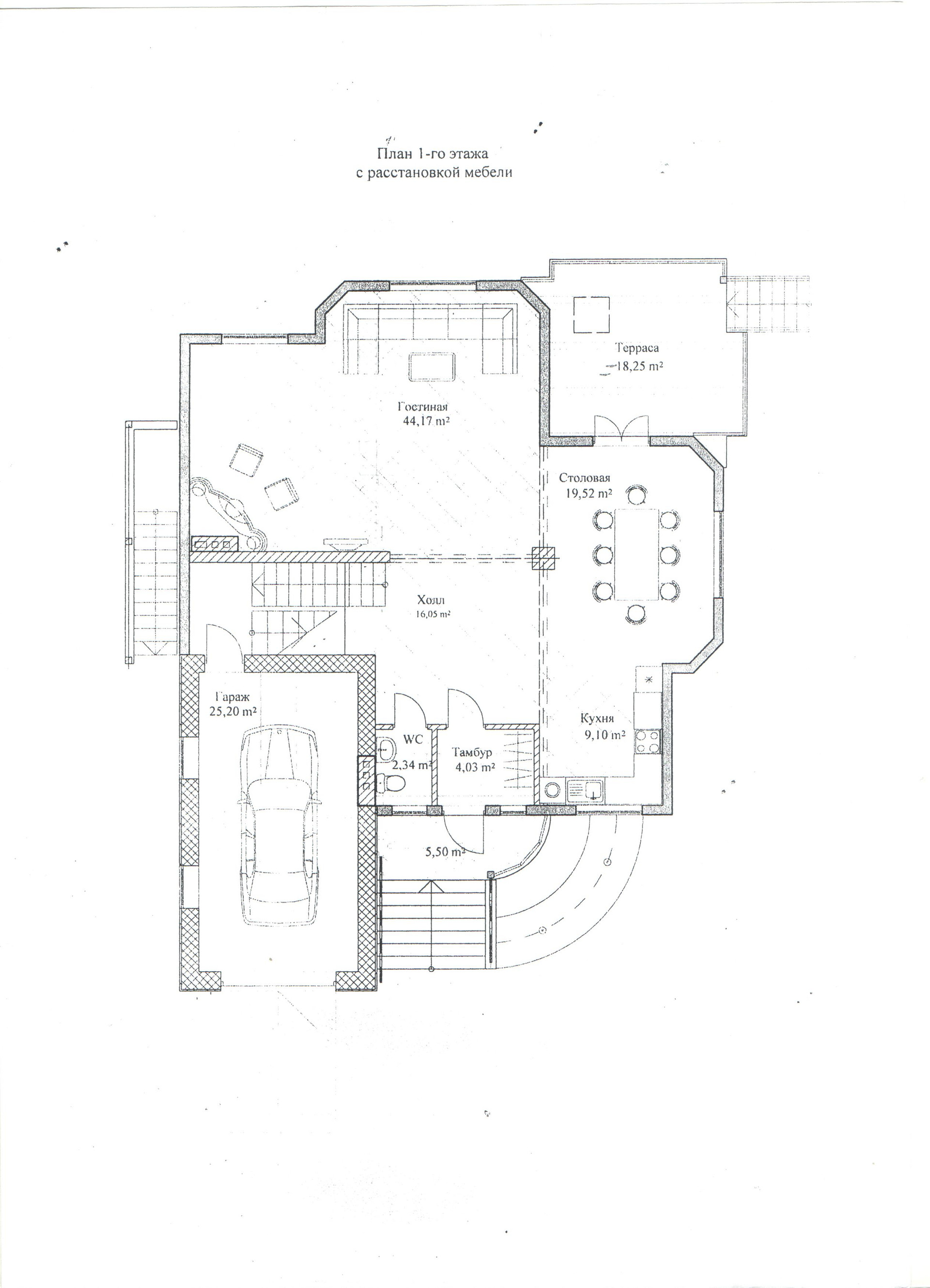 Просторный первый этаж в котором  находится   холл, кухня, прихожая, столовая, санузел.