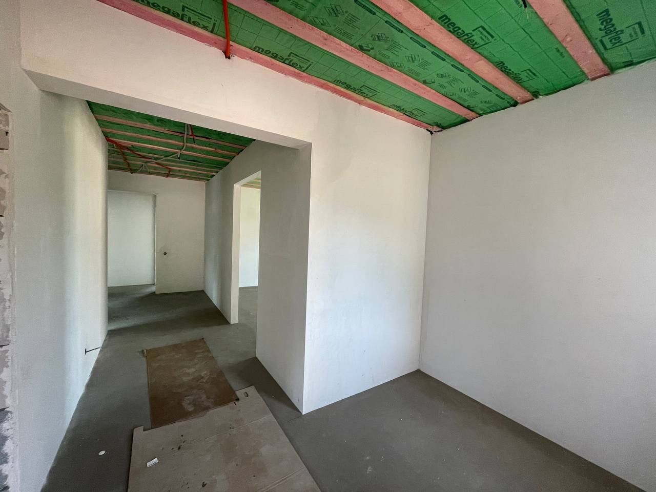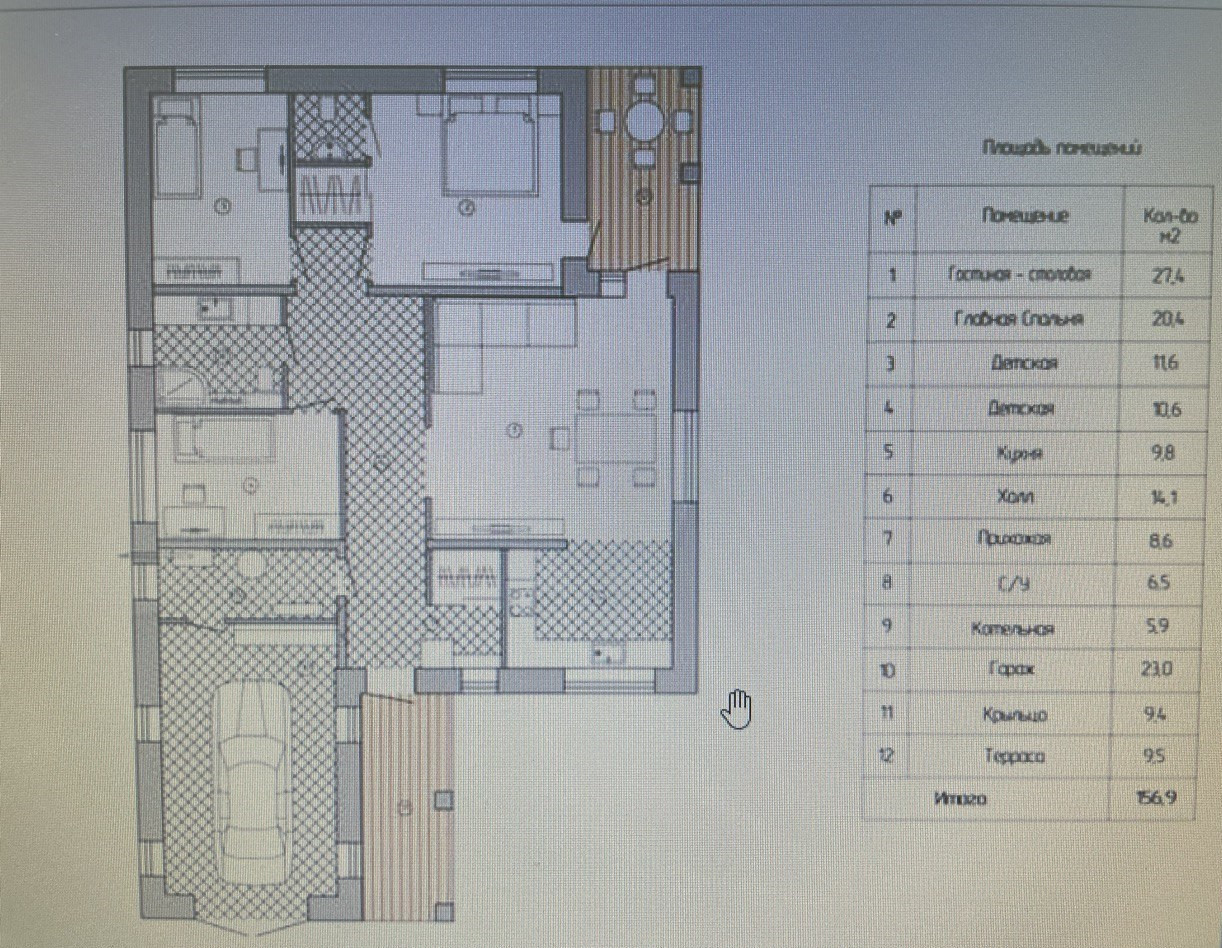 В доме 3 спальни, просторная кухня- гостиная 27,4кв.м , ГАРАЖ - 4,5*5, котельная, с/у совмещенный , терасса на фундаменте - 9,5 кв.м.