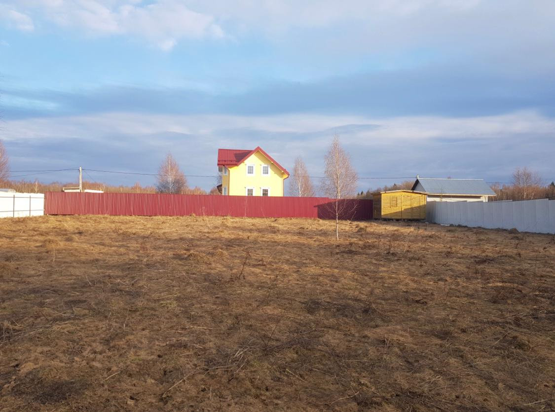 Участок ровный, пустой, квадратной формы, размежеван, границы установлены, огорожен забором с трех сторон. На участке бытовка, подключен свет (220в).