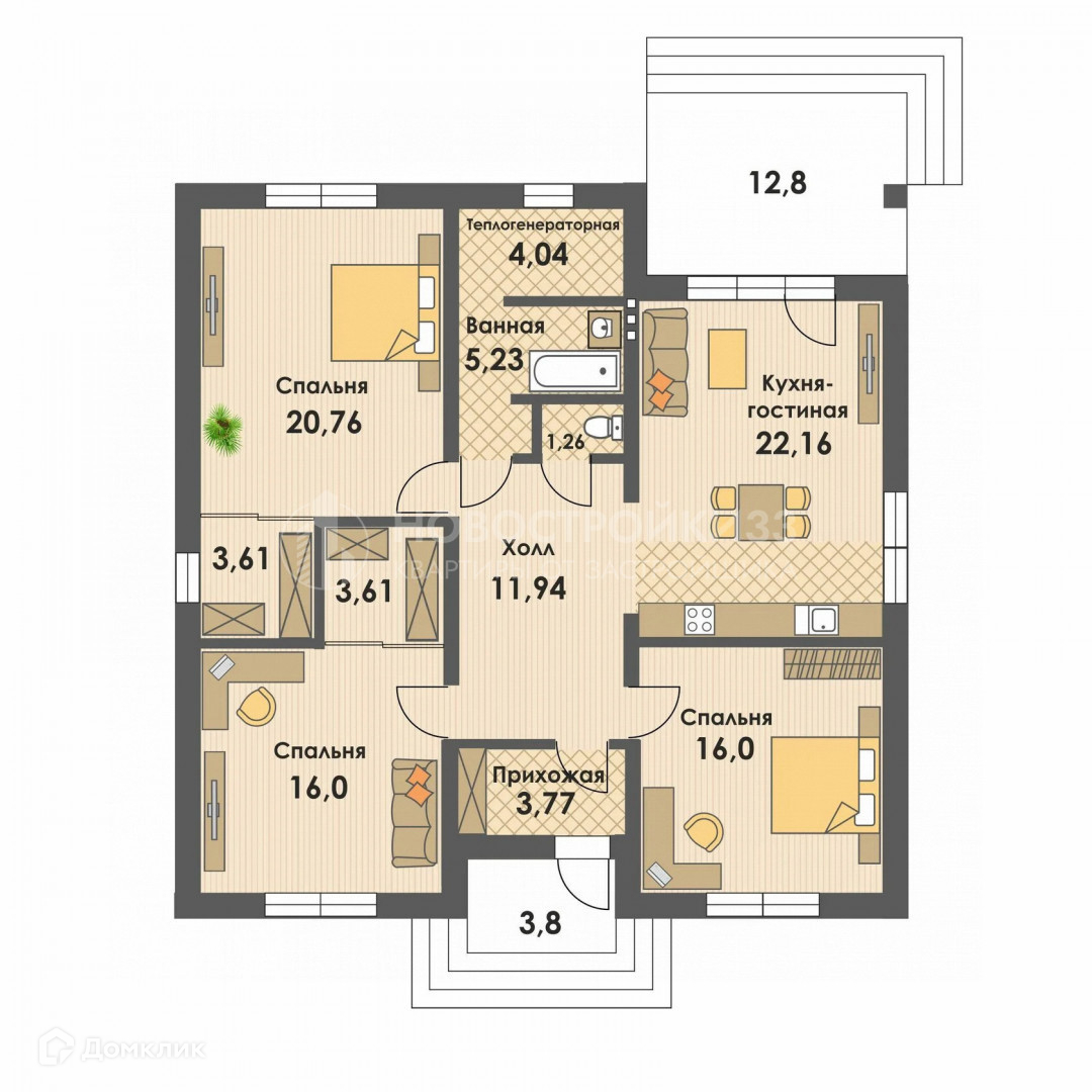 1-этажный дом с 3 спальнями, кухней-столовой, раздельным санузлом и бойлерной  Земельный участок 8, 5 соток.