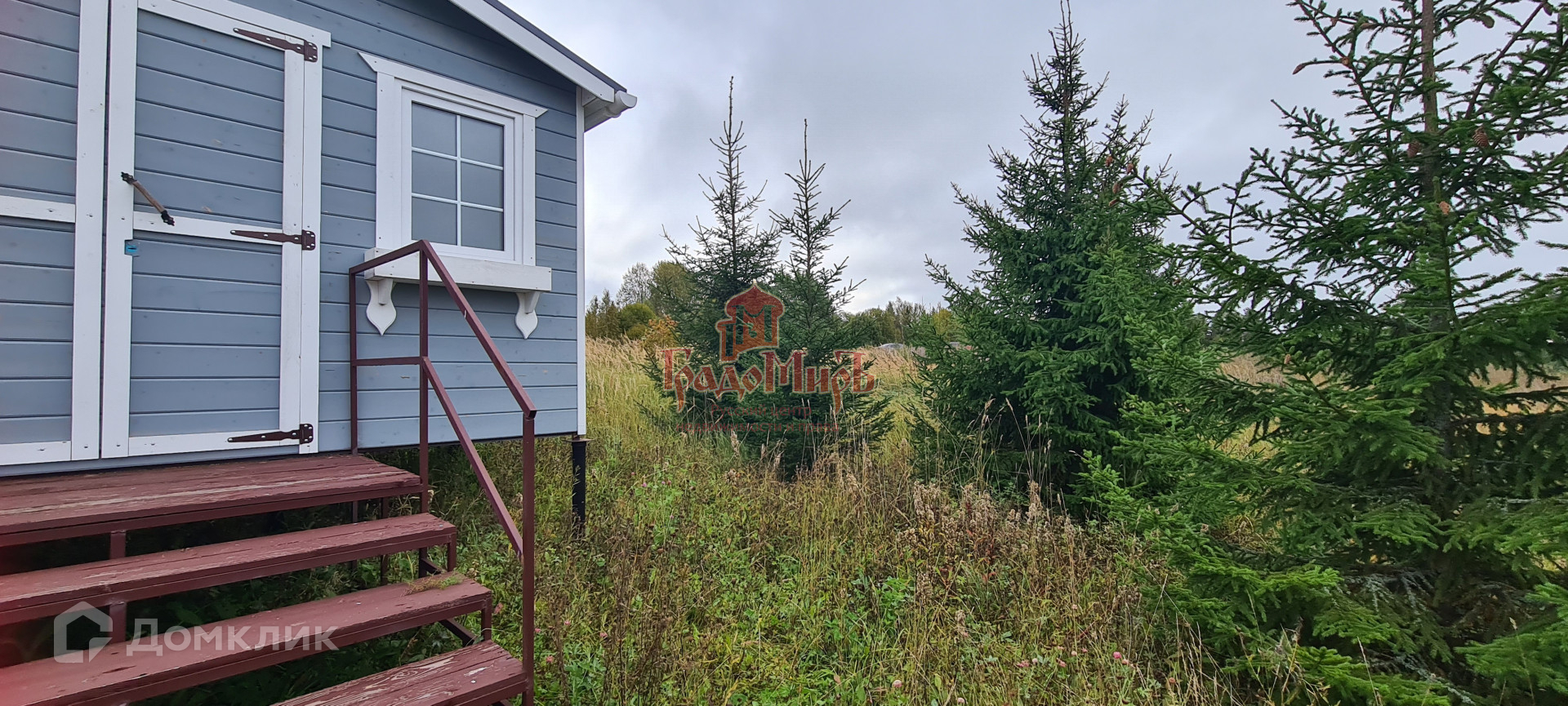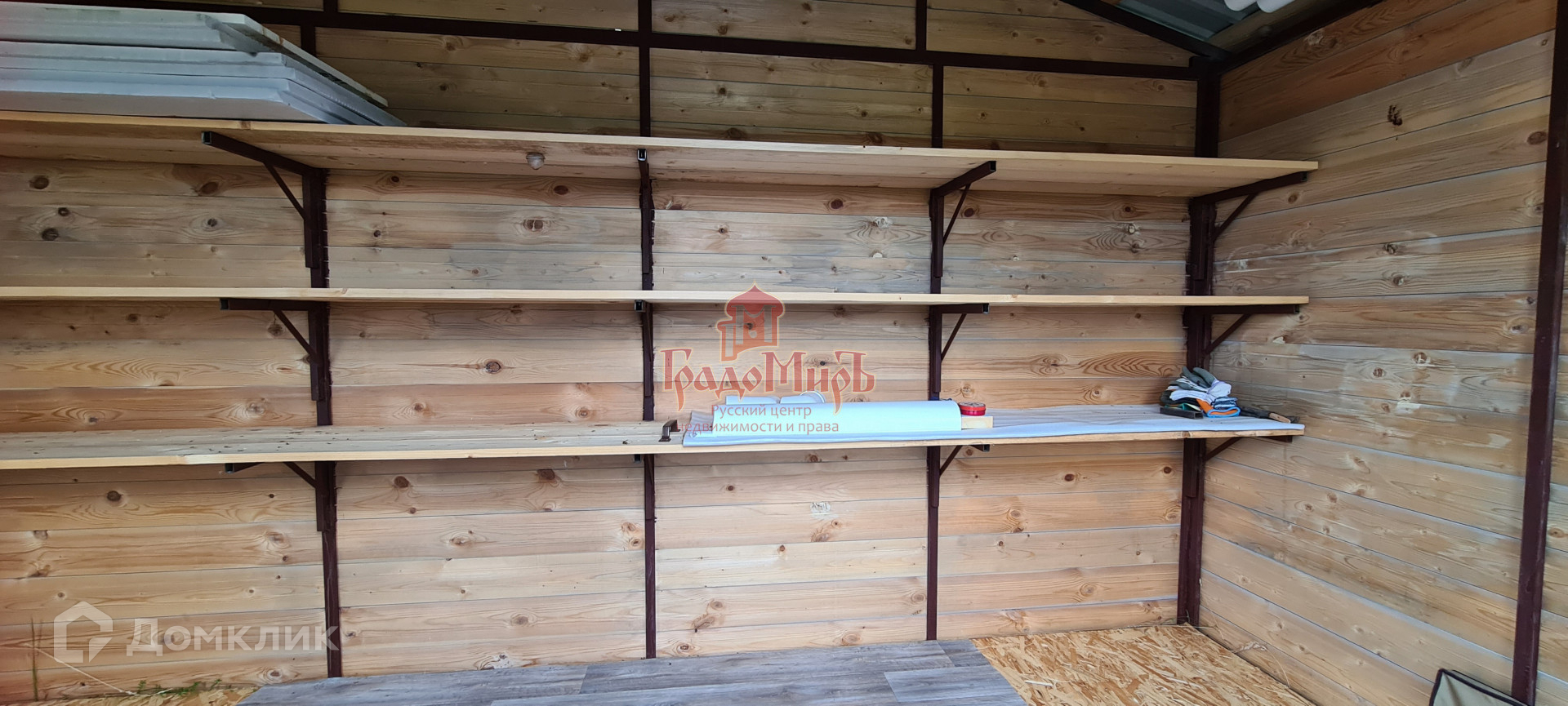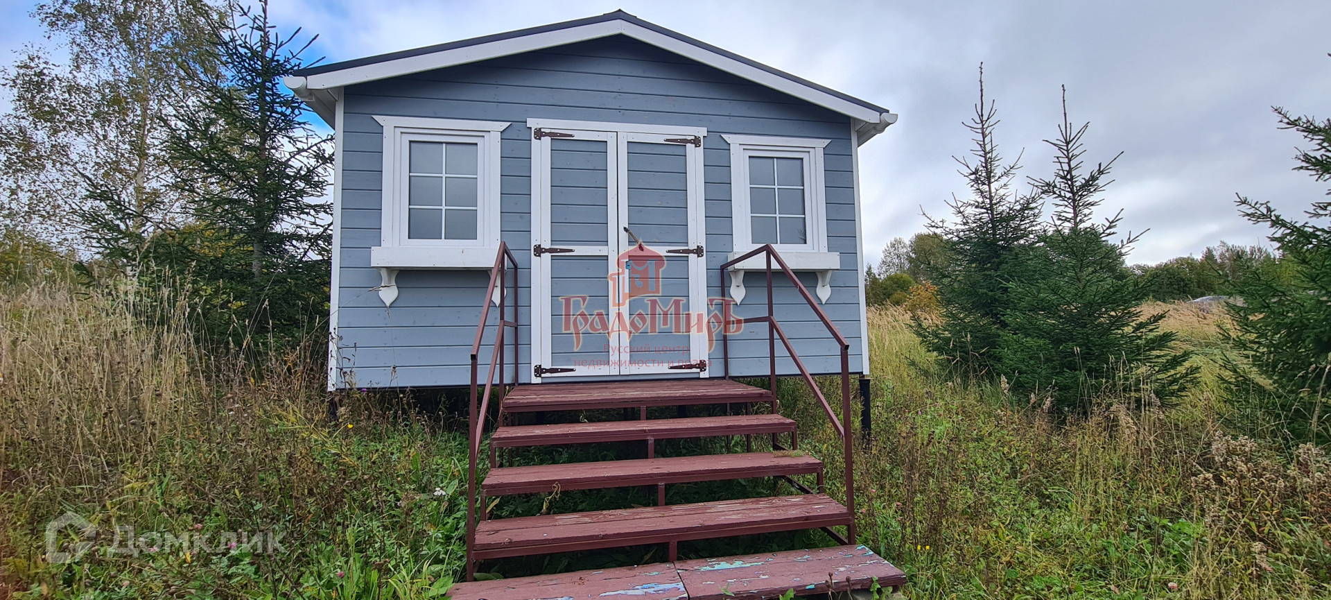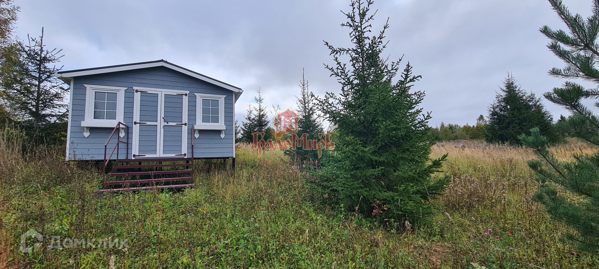На участке уже расположен небольшой домик на свайном фундаменте для хоз. принадлежностей на сборно-разборном металлокаркасе (можно разобрать и перенести в любое место) с пластиковыми окнами.