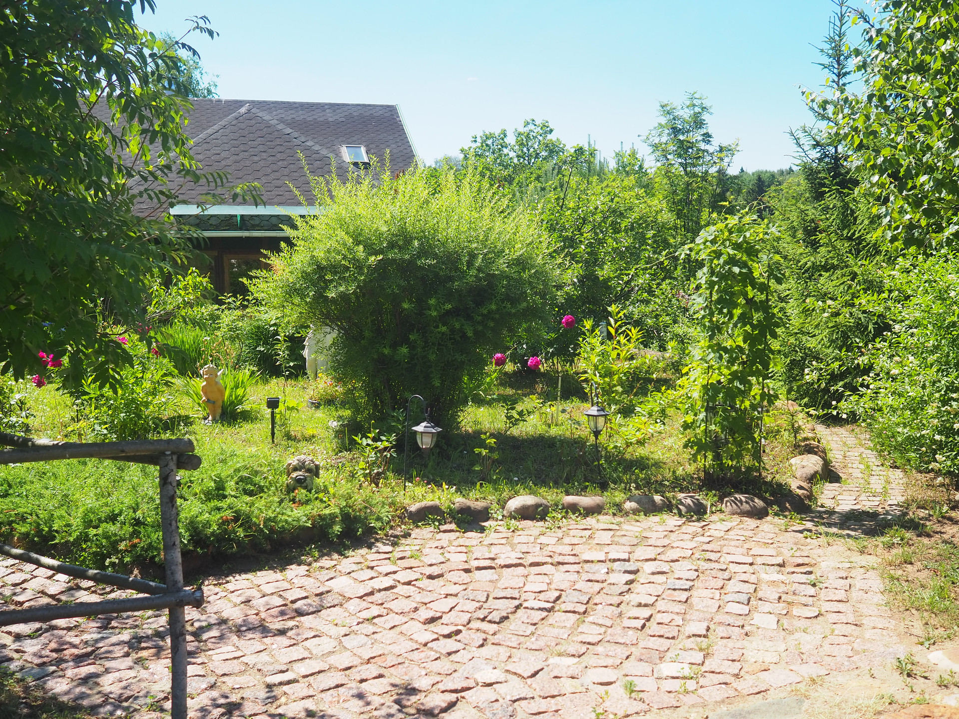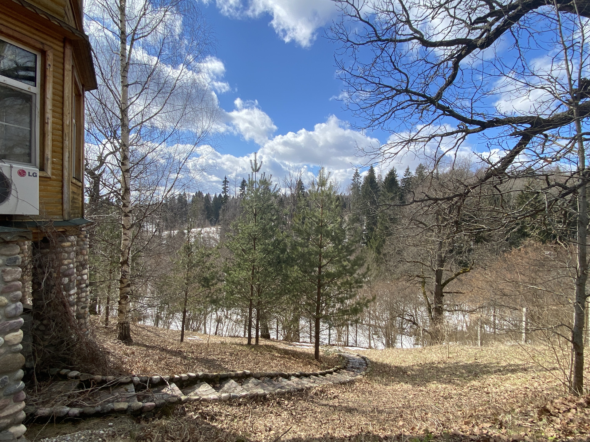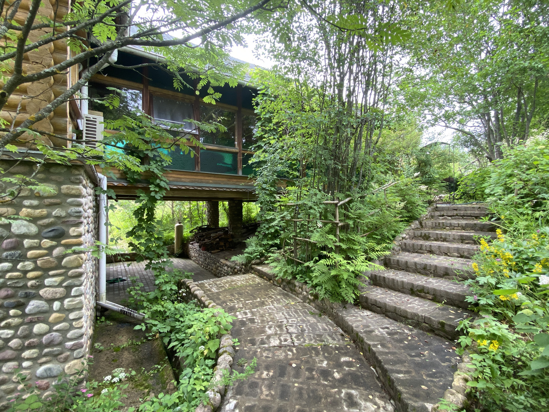 У подножия холма протекает ручей, к которому можно спуститься по лестнице, выложенной из природного камня.