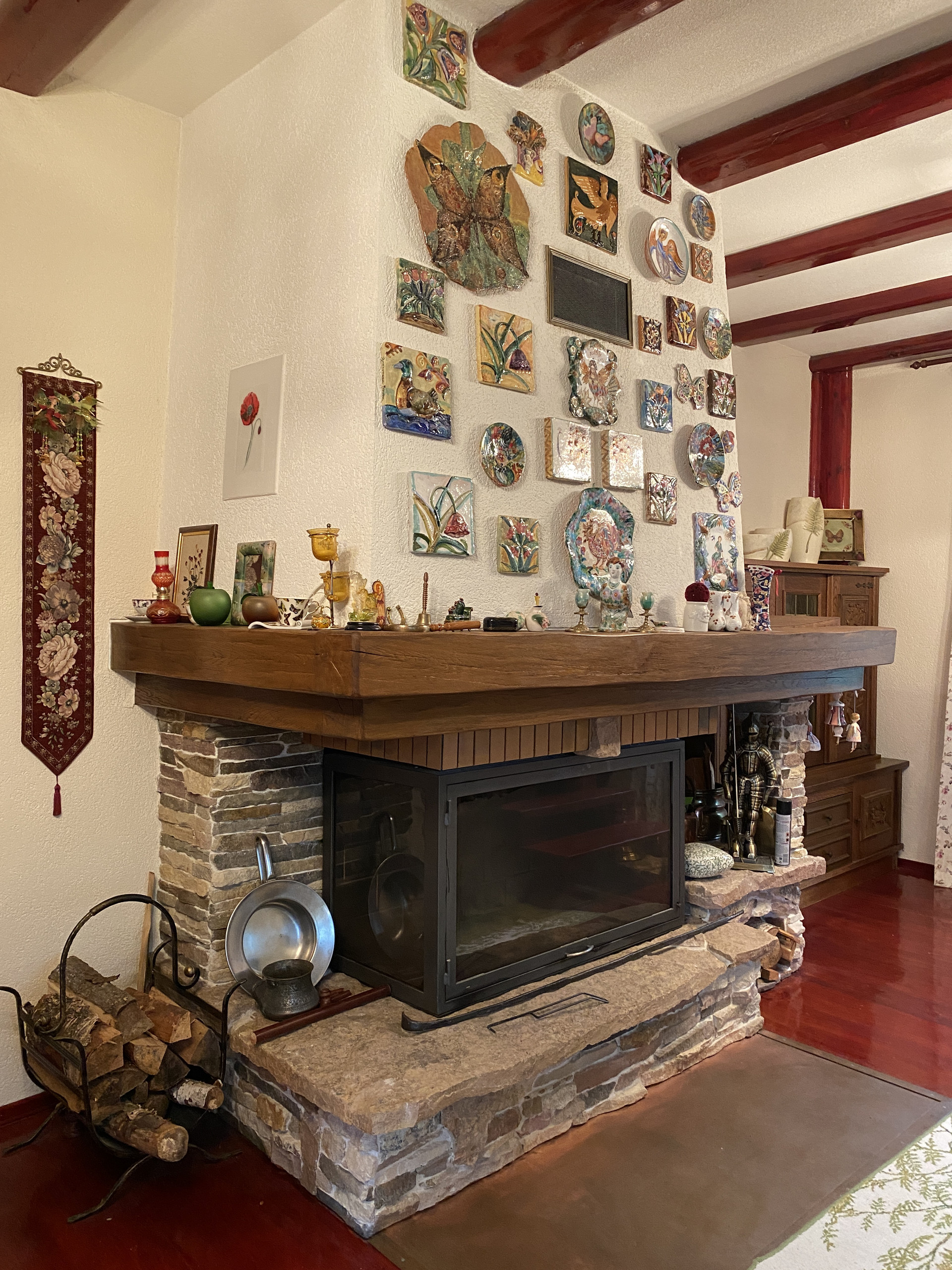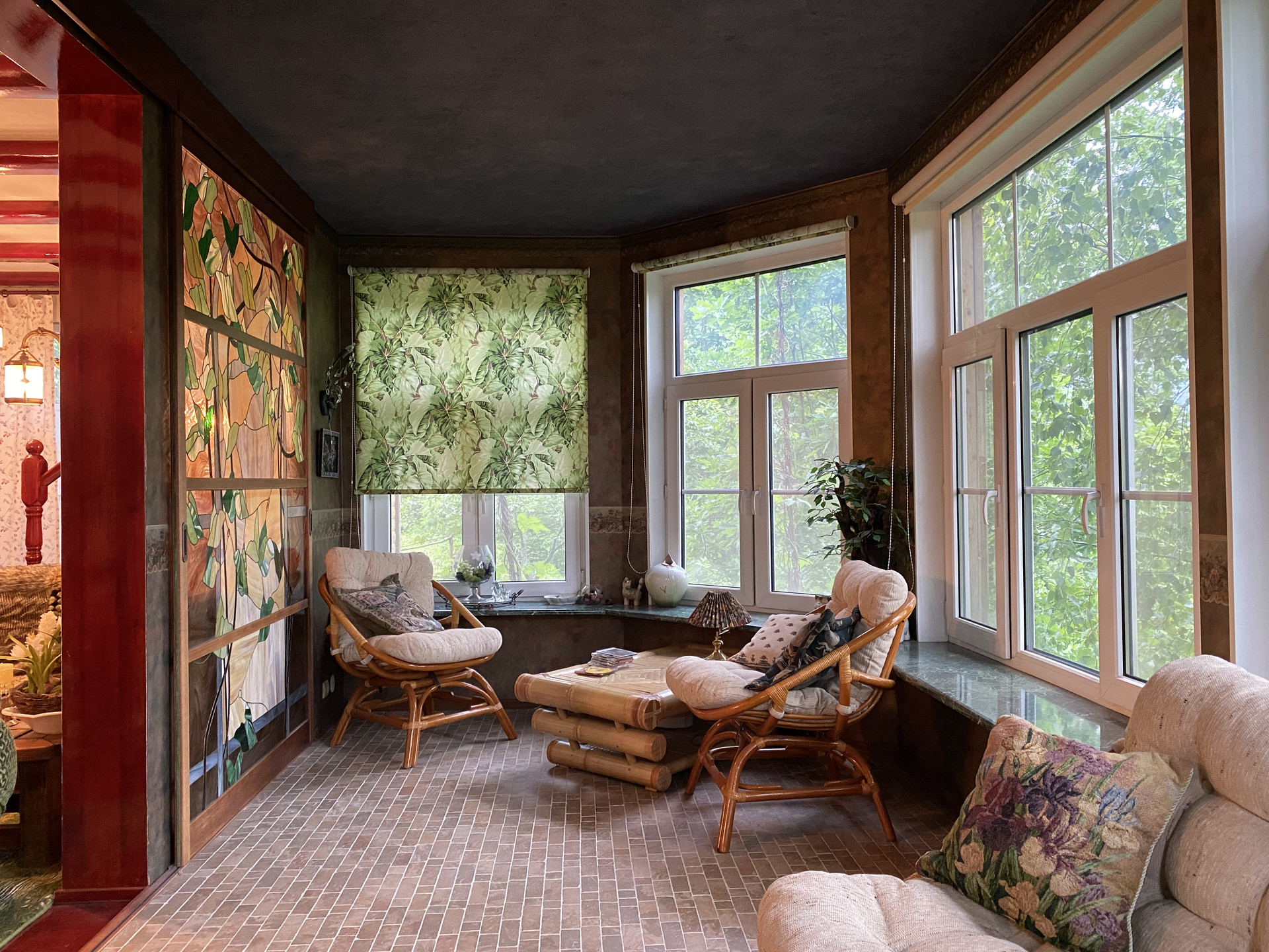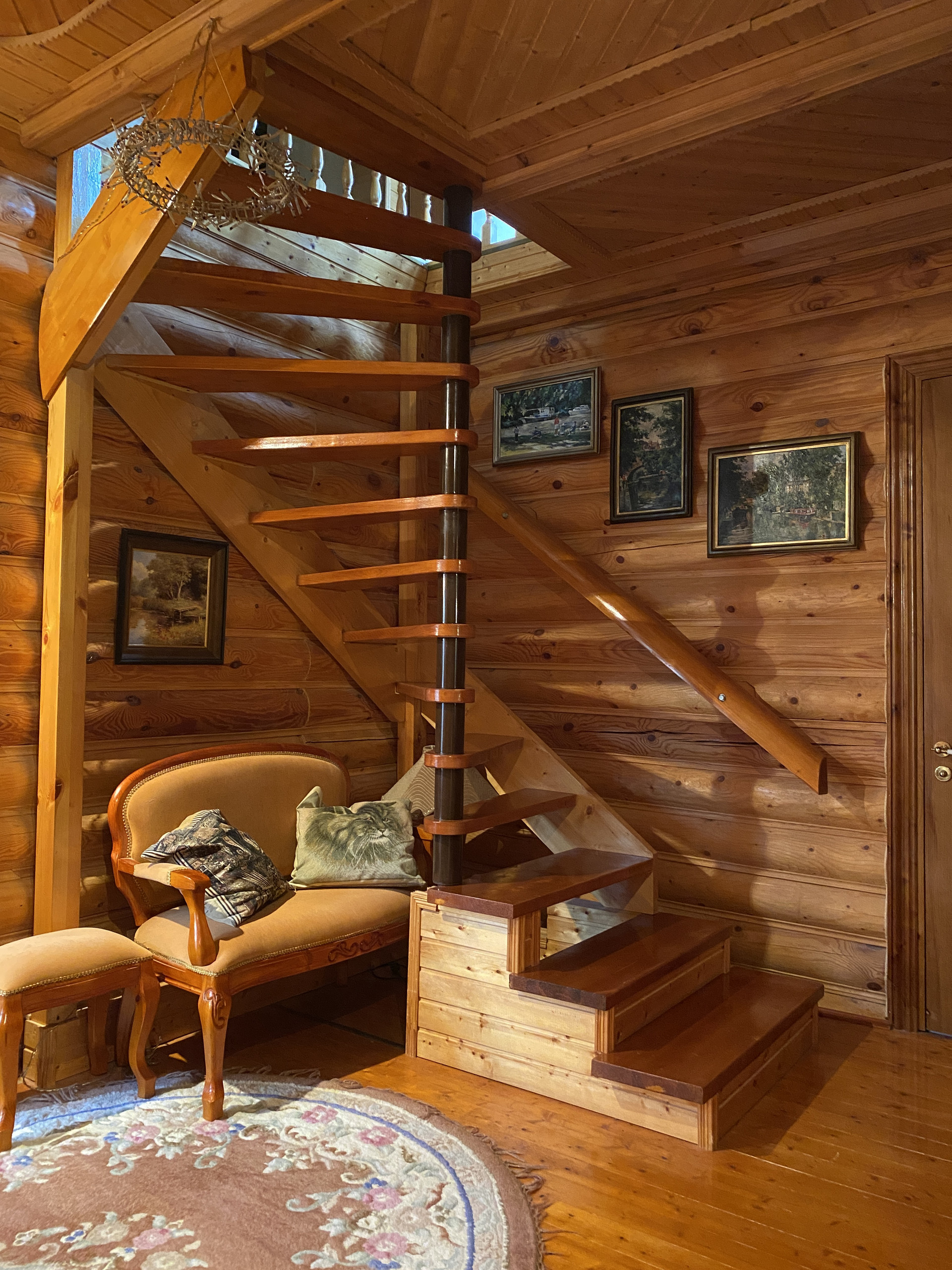 У подножия холма протекает ручей, к которому можно спуститься по лестнице, выложенной из природного камня.