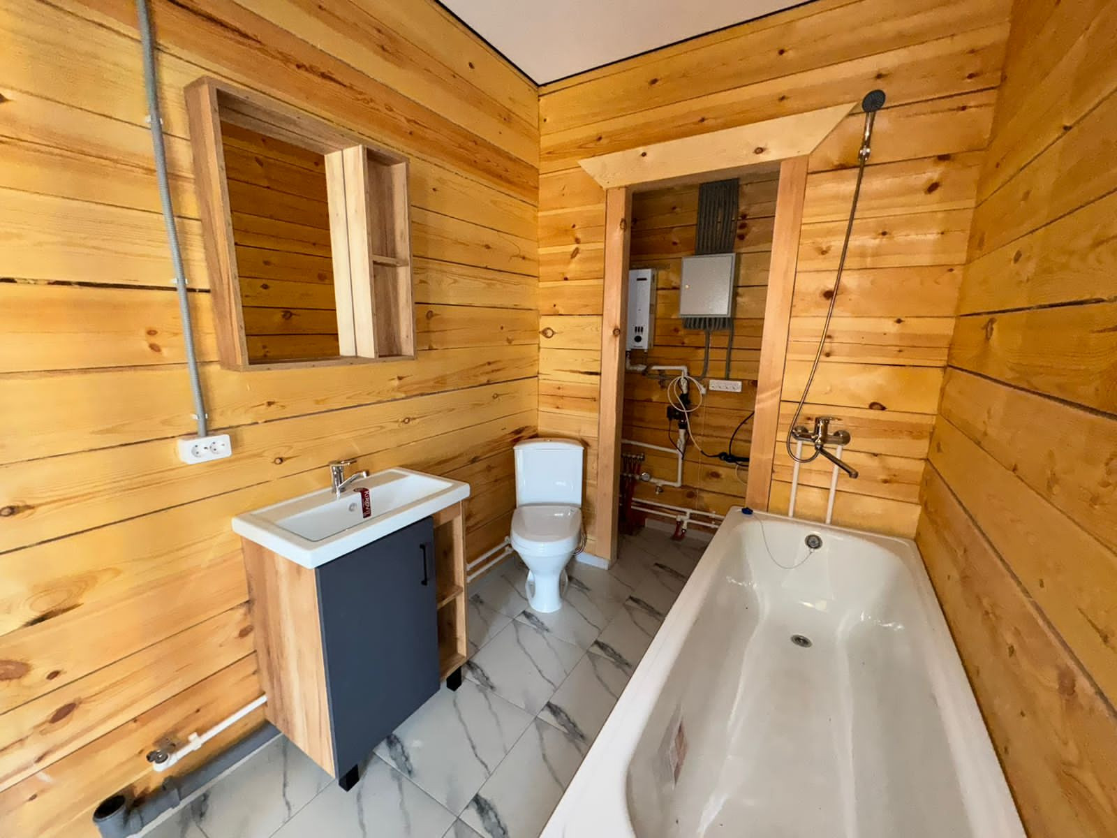 Натяжные глянцевые потолки, точечные светильники. Яркое освещение, даже в пасмурные дни в доме светло и уютно! Установлена сантехника: унитаз, ванна, раковина. Установлен водонагреватель, скважина автоматика. В доме проведены все инженерные коммуникации: разводка электрики и центральный электрощит, разводка водопровода, разводка канализации, отопление теплый пол.