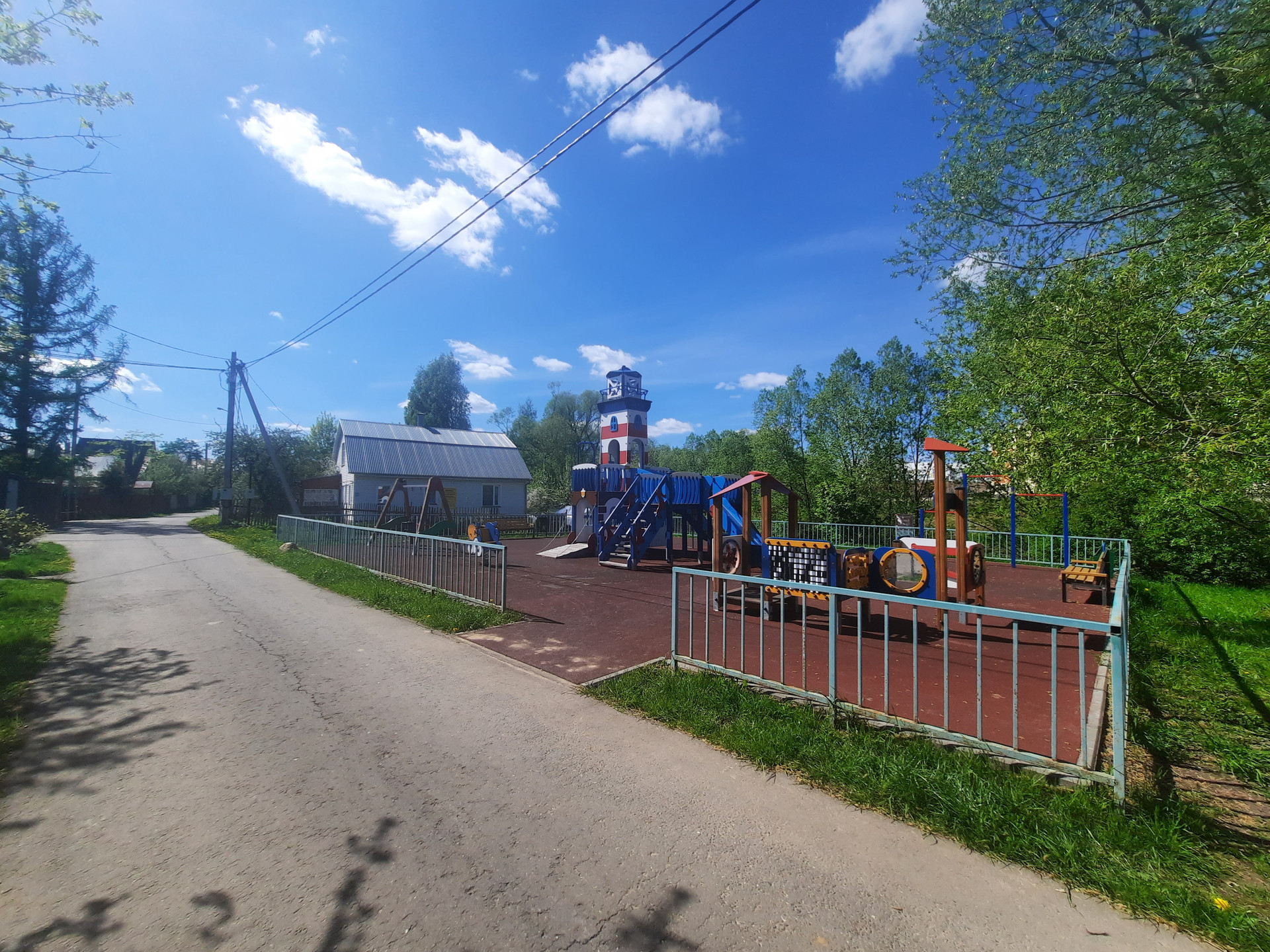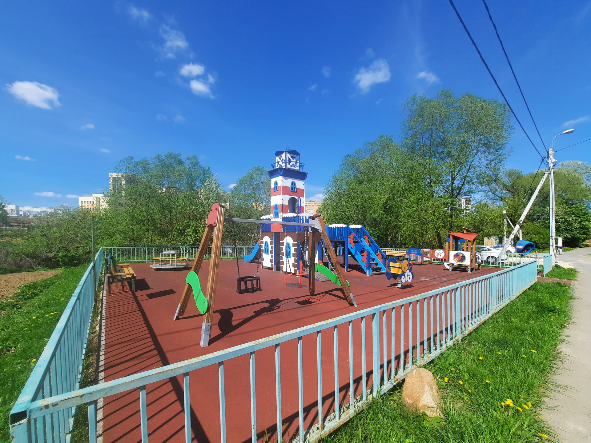 Городская инфраструктура за забором: муниципальная школа  338 имени Героя Советского Союза А. Ф. Авдеева, детский сад, супермаркеты, поликлиника, почта, кофейни, банки и т.д.