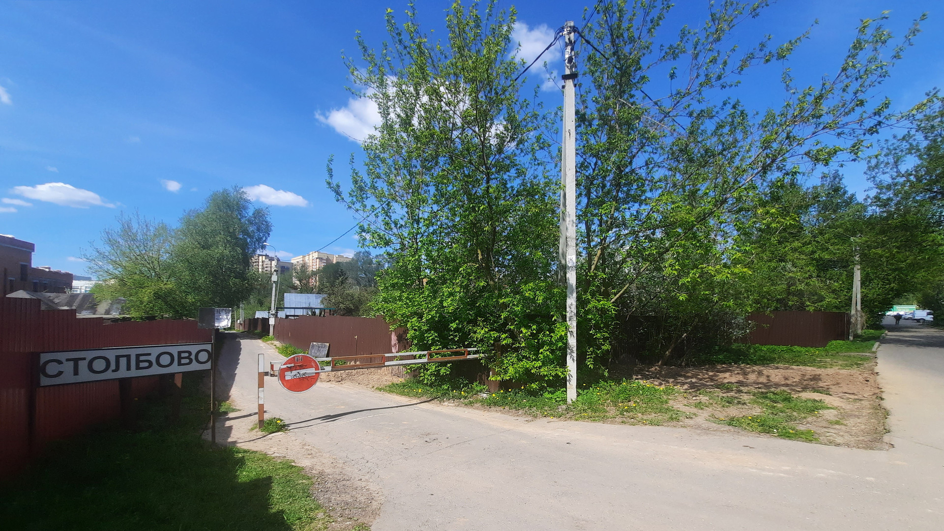 Въезд в деревню закрыт шлагбаумом.