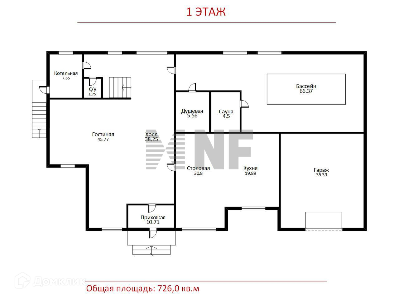 1 этаж: просторный каминный зал, столовая - кухня, гостевой с/у, СПА-зона: бассейн, сауна, с/у, комната отдыха, котельная;