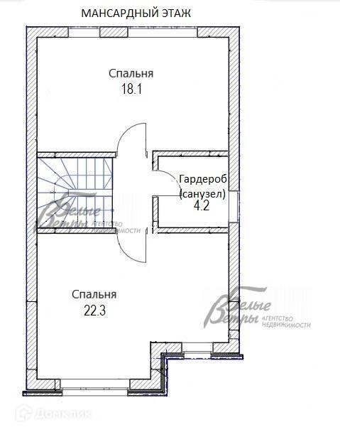 3-ий этаж: холл 2,4 кв.м, спальня 18,1 кв.м, спальня 22,3 кв.м, гардеробная (возможно переделать в санузел, трубы подведены) 4,2 кв.м..