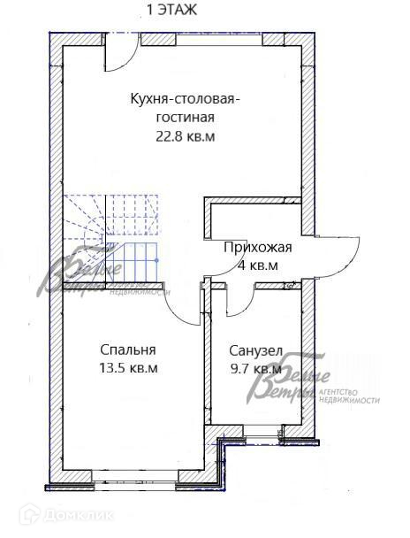 1-ый этаж: прихожая 4 кв м, санузел 9,7 кв.м, кухня-столовая-гостиная 22,8 кв м с выходом на задний двор, спальня 13.5 кв.м..
