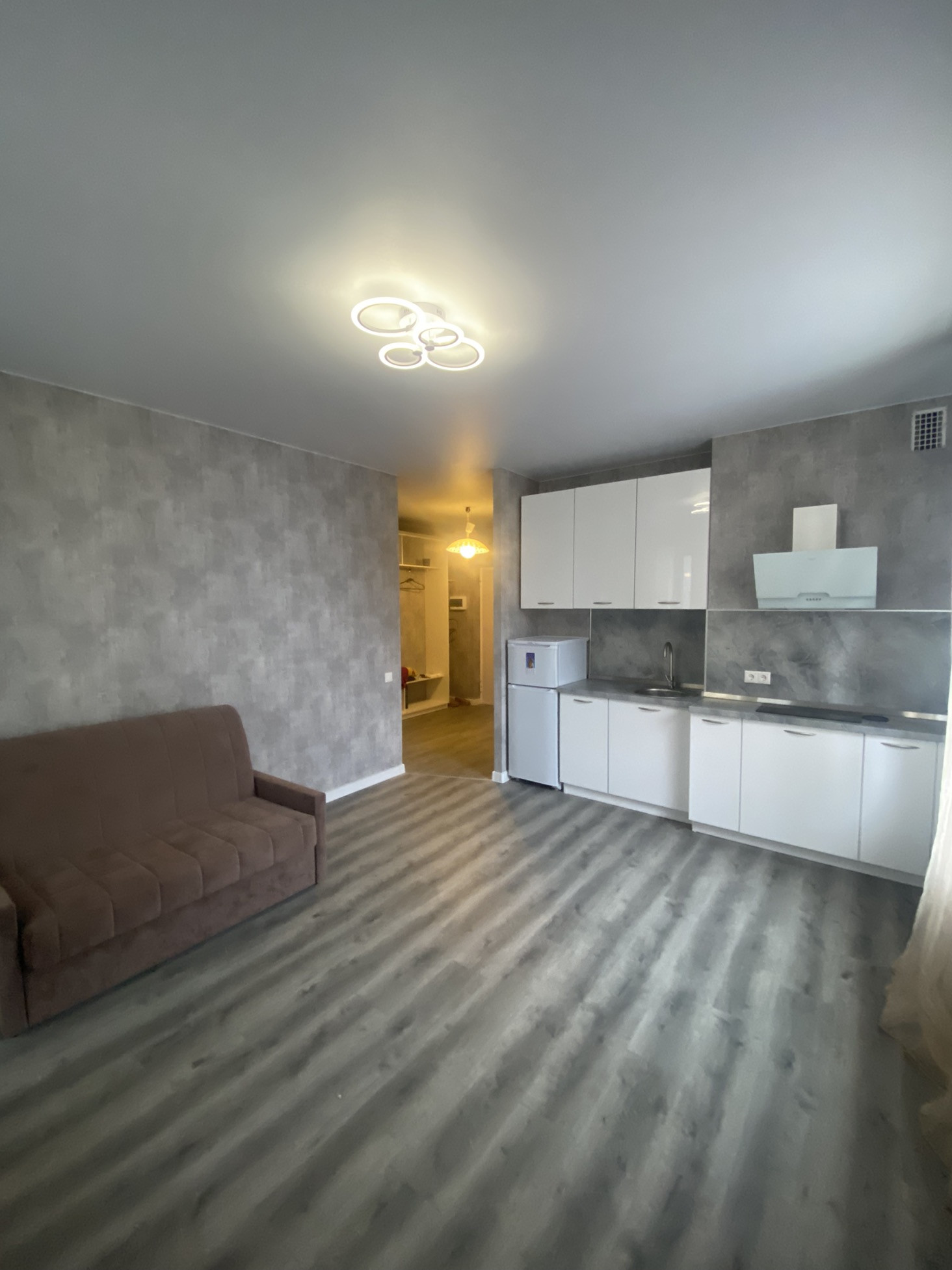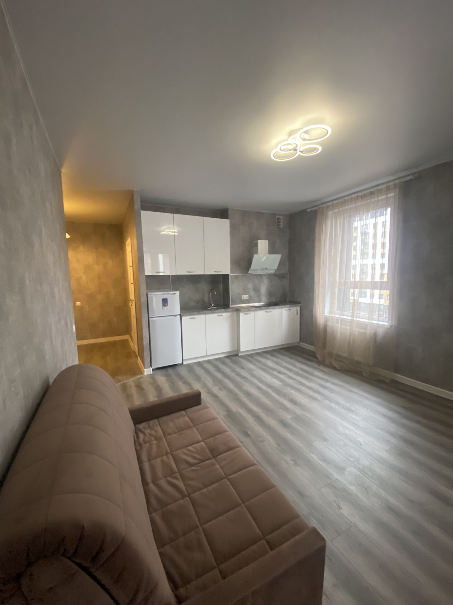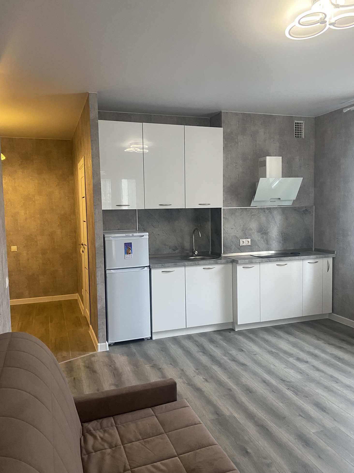 В квартире остается кухонный гарнитур, техника, диван.