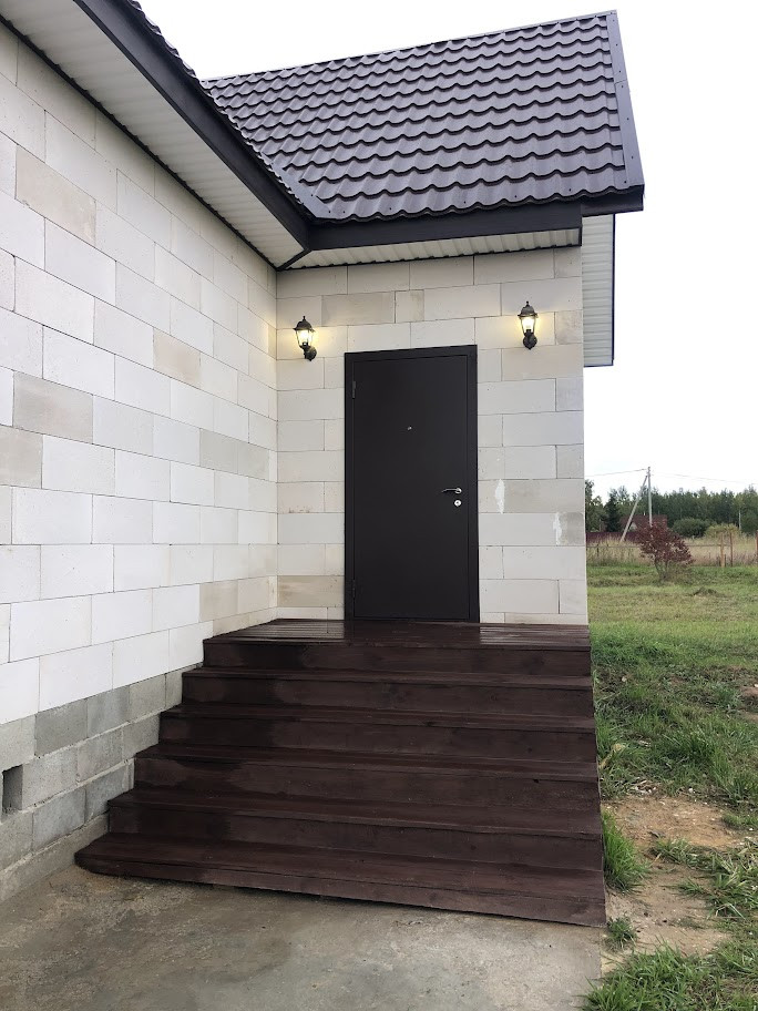 стены - газобетонные блоки; крыша - металлочерепица; стеклопакеты, металлическая входная дверь.