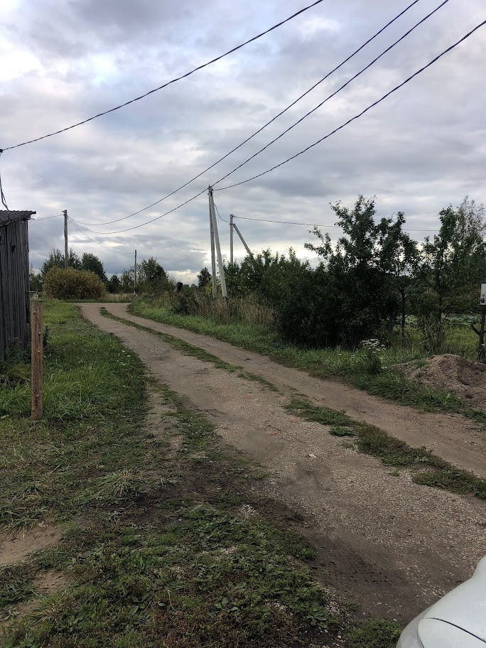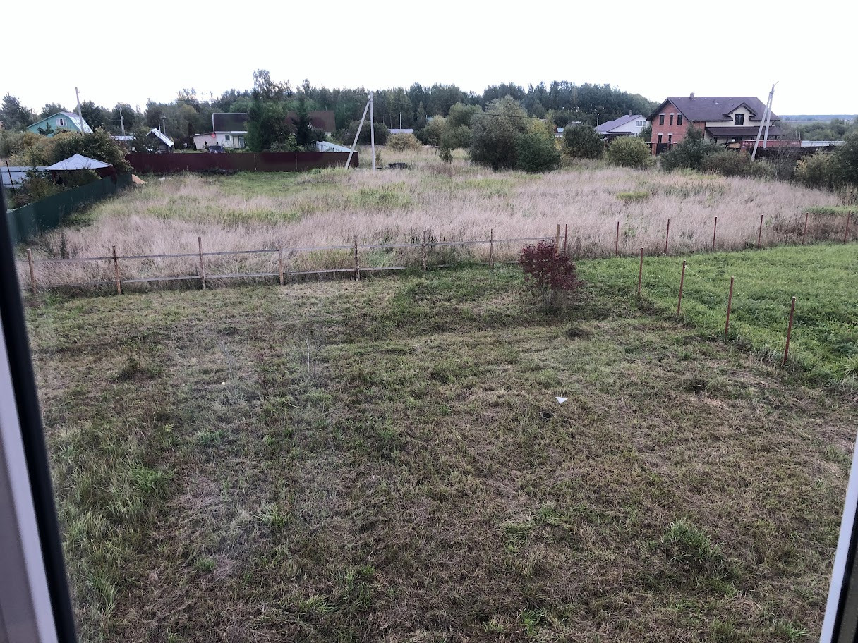 Участок 9,2 соток, ровный, прямоугольной правильной формы, оканавлен, сухой, слева - соседский забор из металлопрофиля, по периметру столбы.