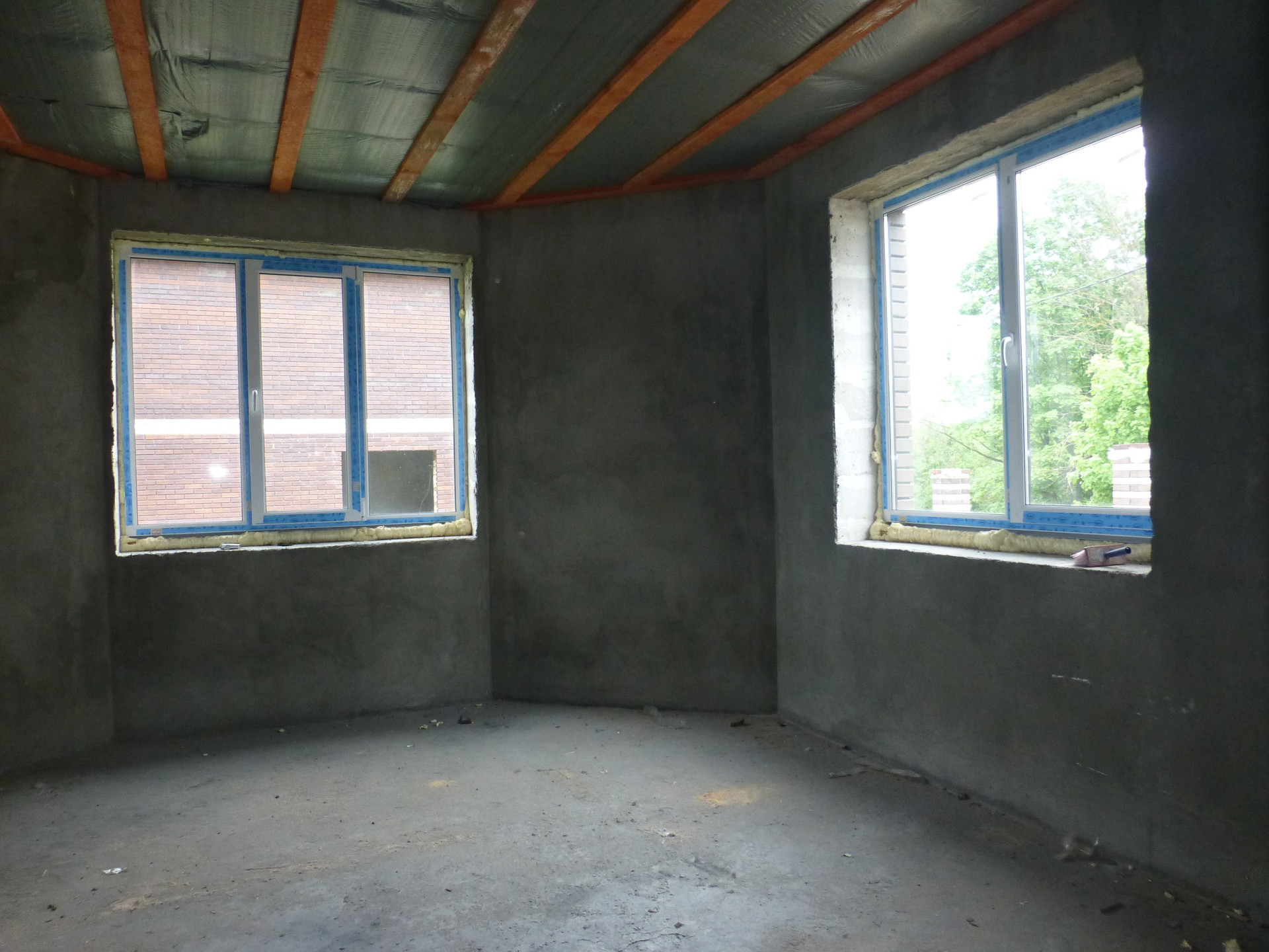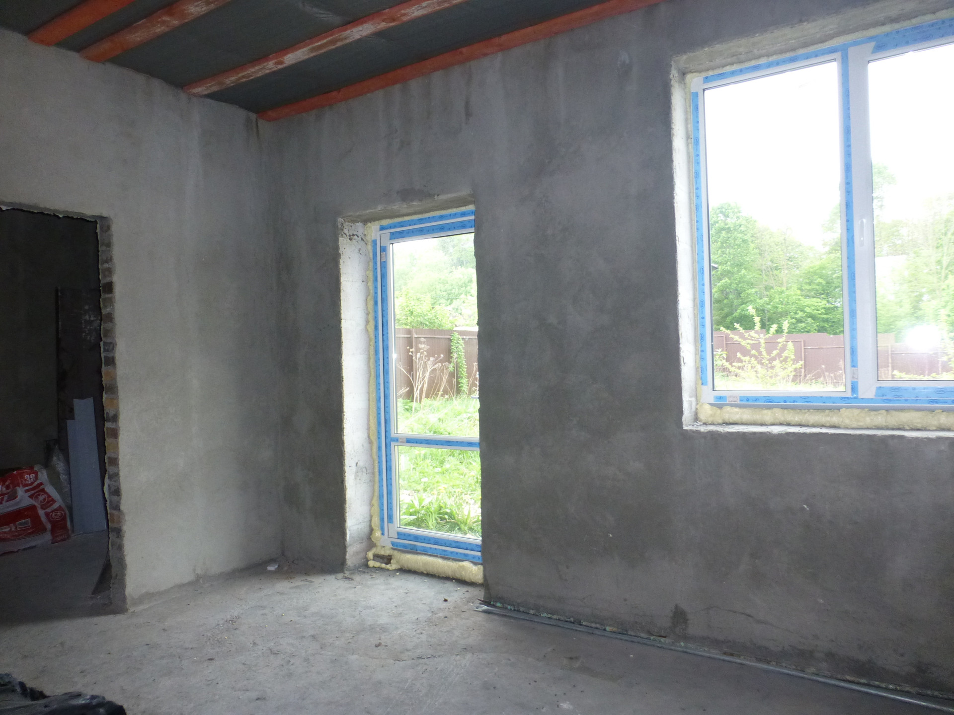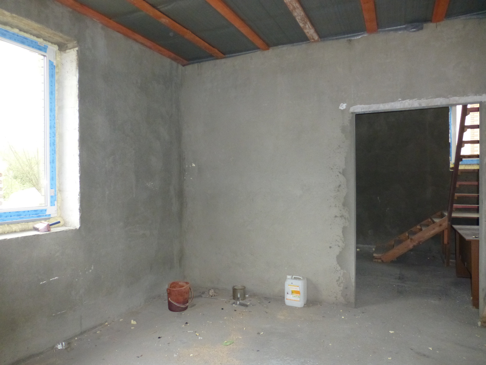 - выполнена отделка : оштукатурены стены, стяжка на полу,