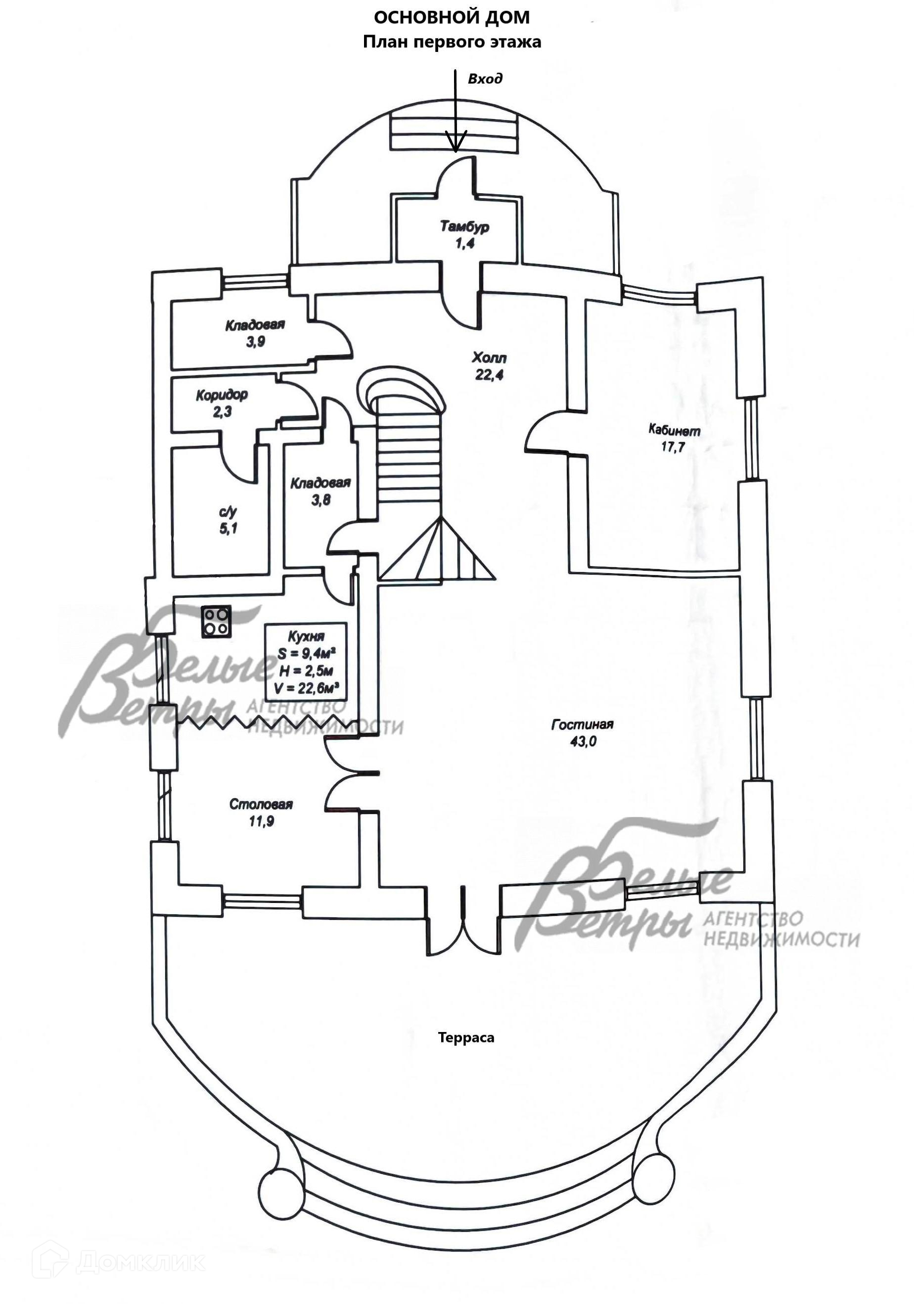 1-ый этаж: тамбур 1.4 кв.м, гардеробная 3.9 кв.м, холл 22.4 кв.м, кабинет 17.7 кв.м, санузел 5.1 кв.м, коридор 2.3 кв.м, кладовая 3.8 кв.м, кухня-столовая 22 кв.м, гостиная 43 кв.м, терраса 32.5 кв.м.