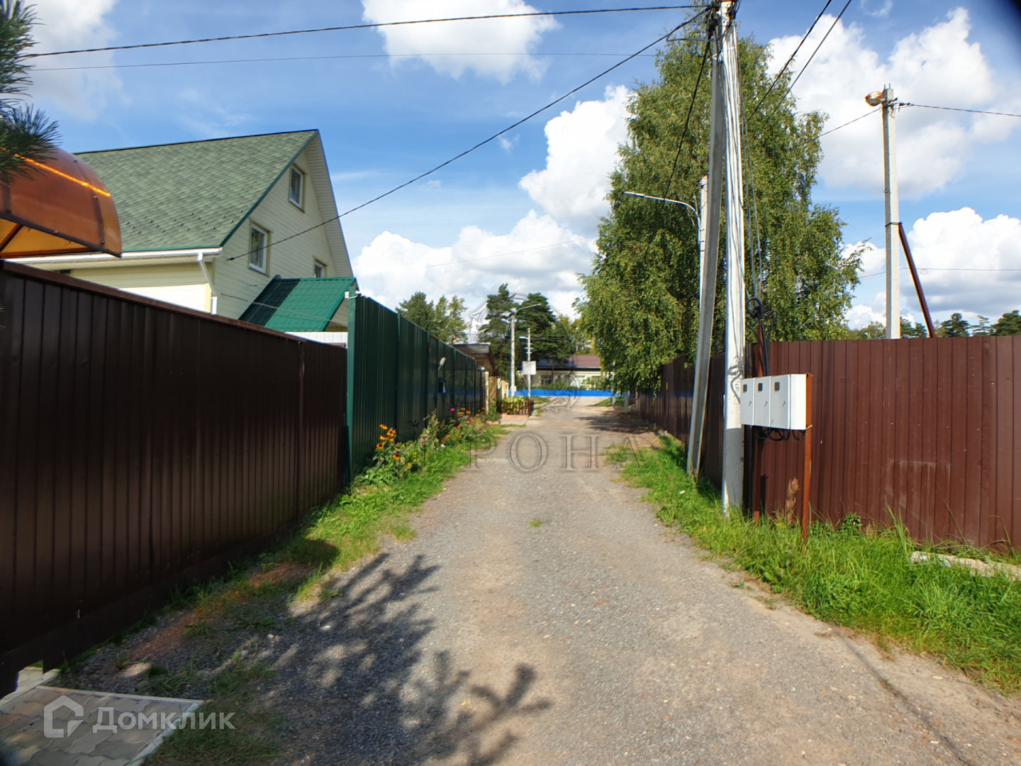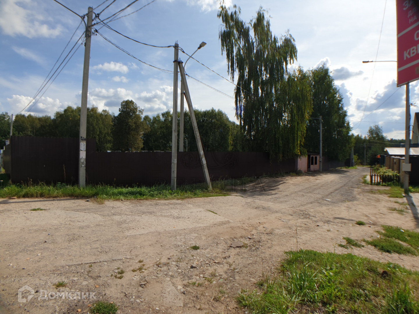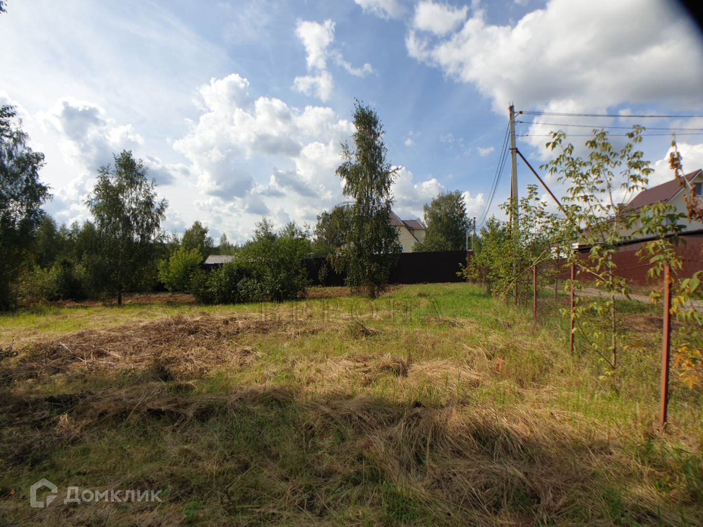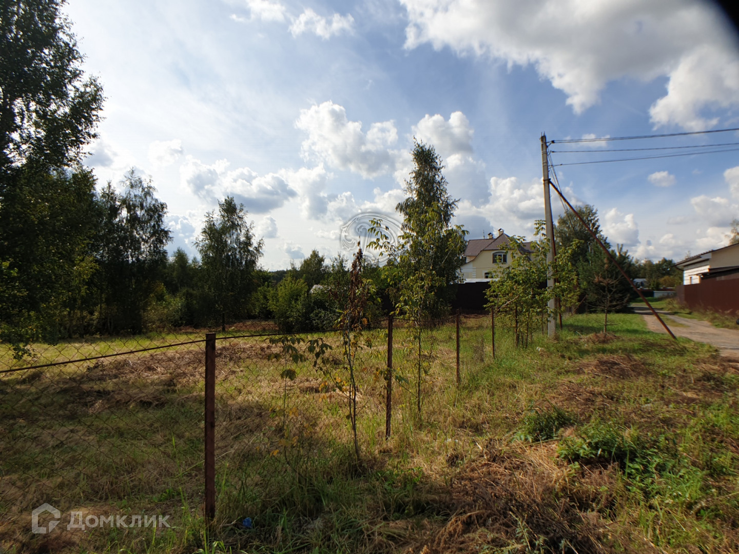 Электрический столб на границе участка. Огорожен сеткой рабицей по периметру.
