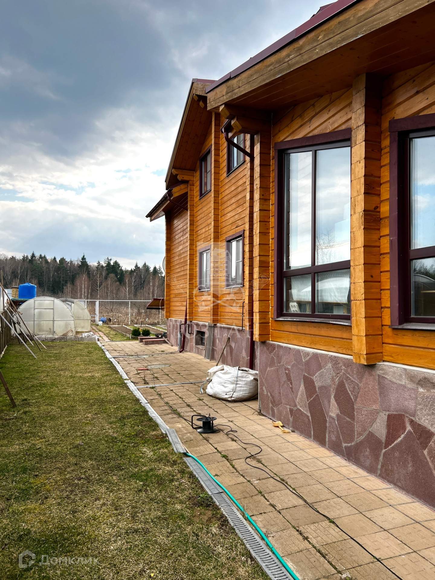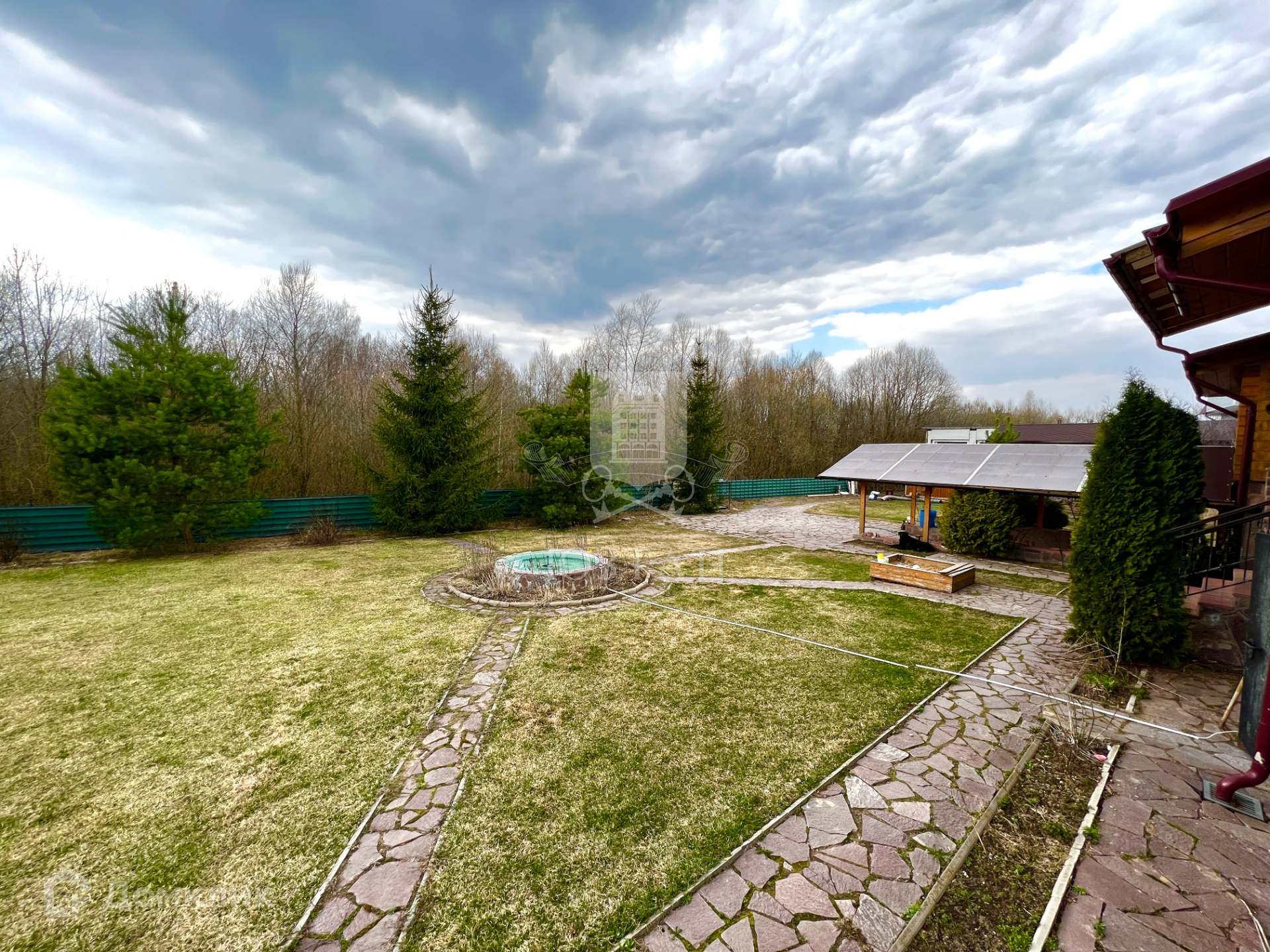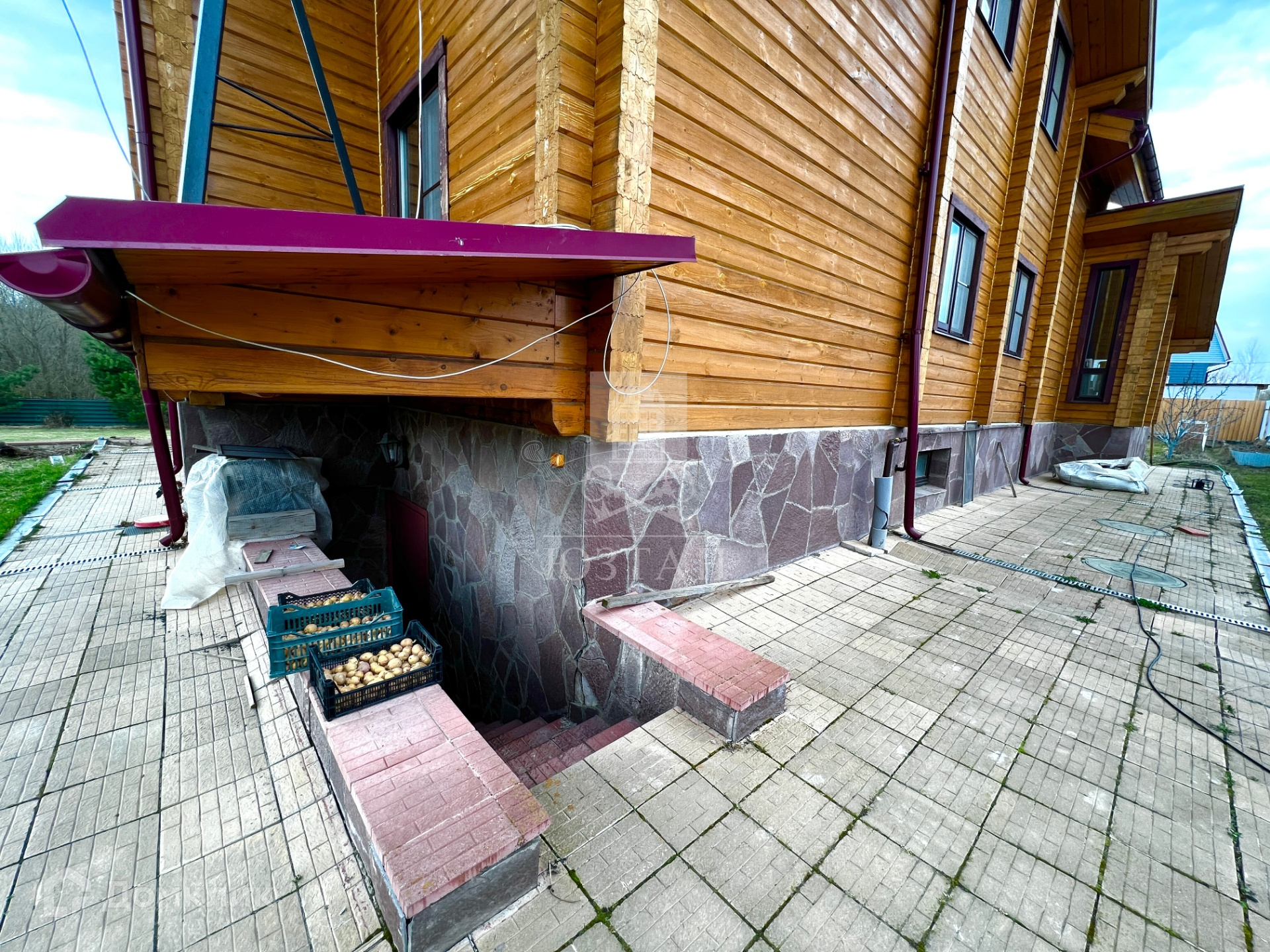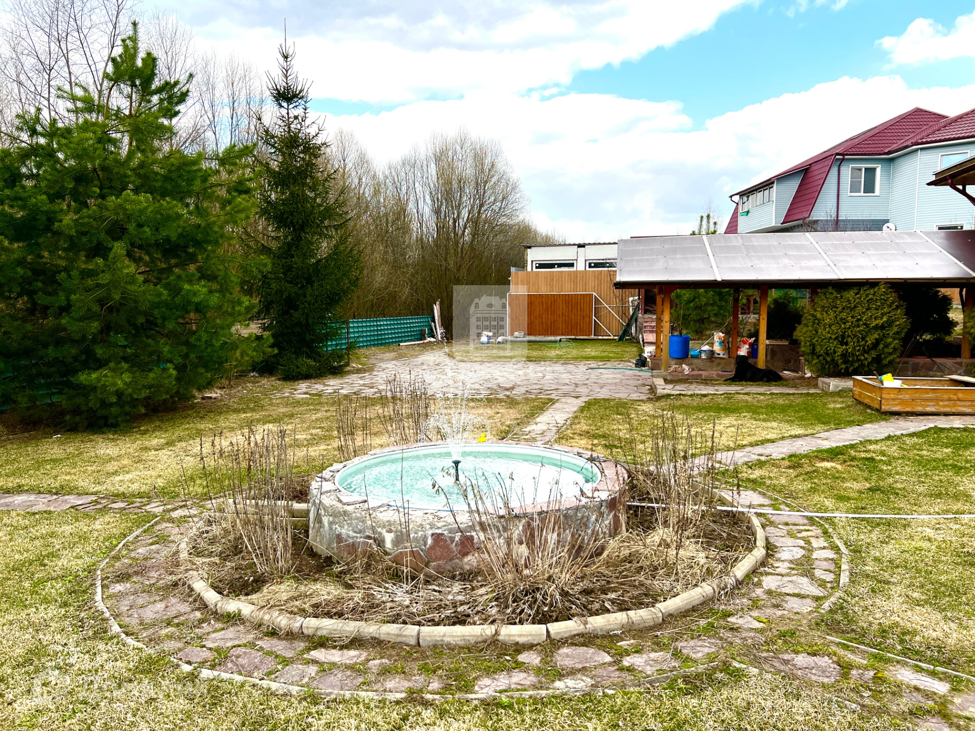 Оборудована бетонная отмостка вокруг дома и стоянка для автомобиля.