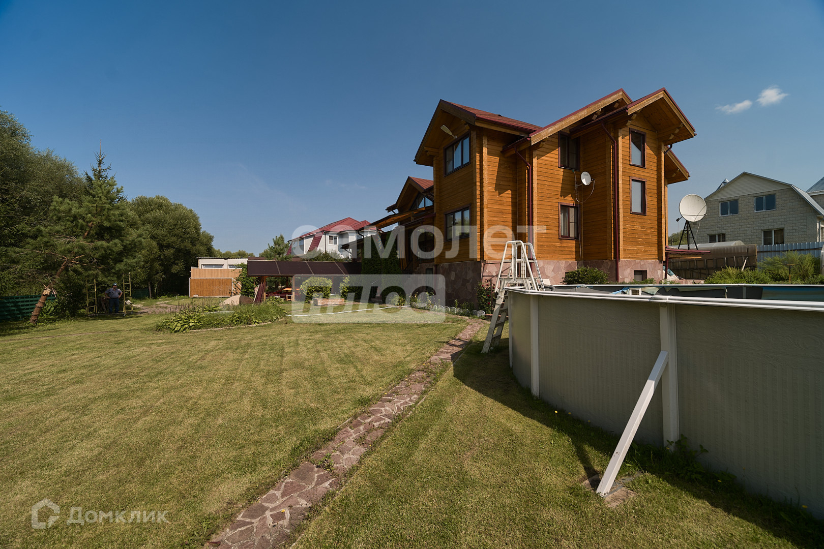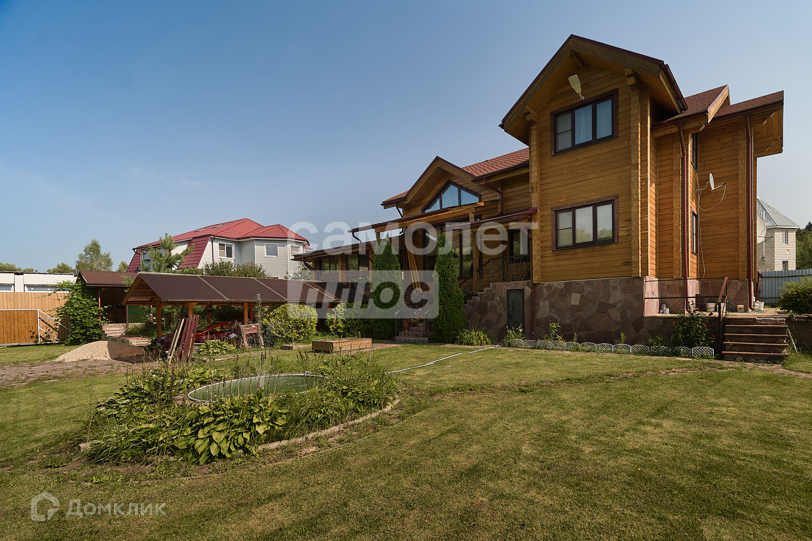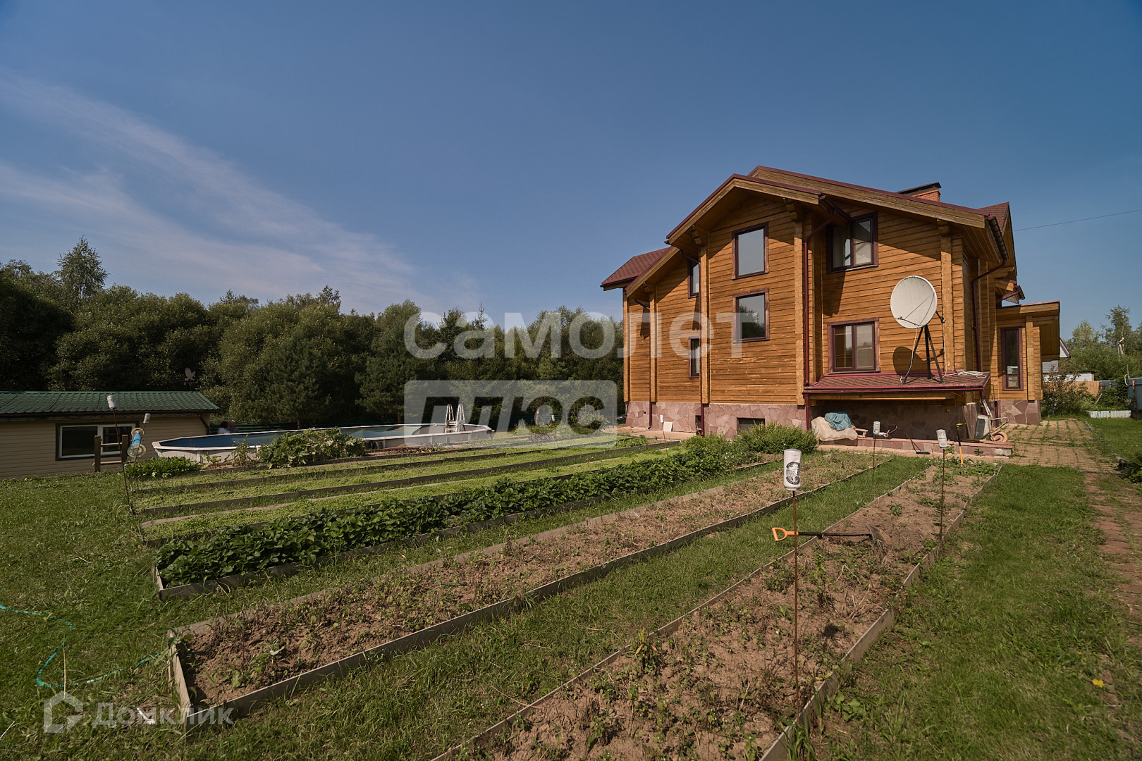 Три этажа для круглогодичного проживания на участке в 19 соток правильной формы, засеян газонной травой, есть огород и 3 теплицы, огорожен забором, автоматические ворота, забетонирована площадка на 2 машины.