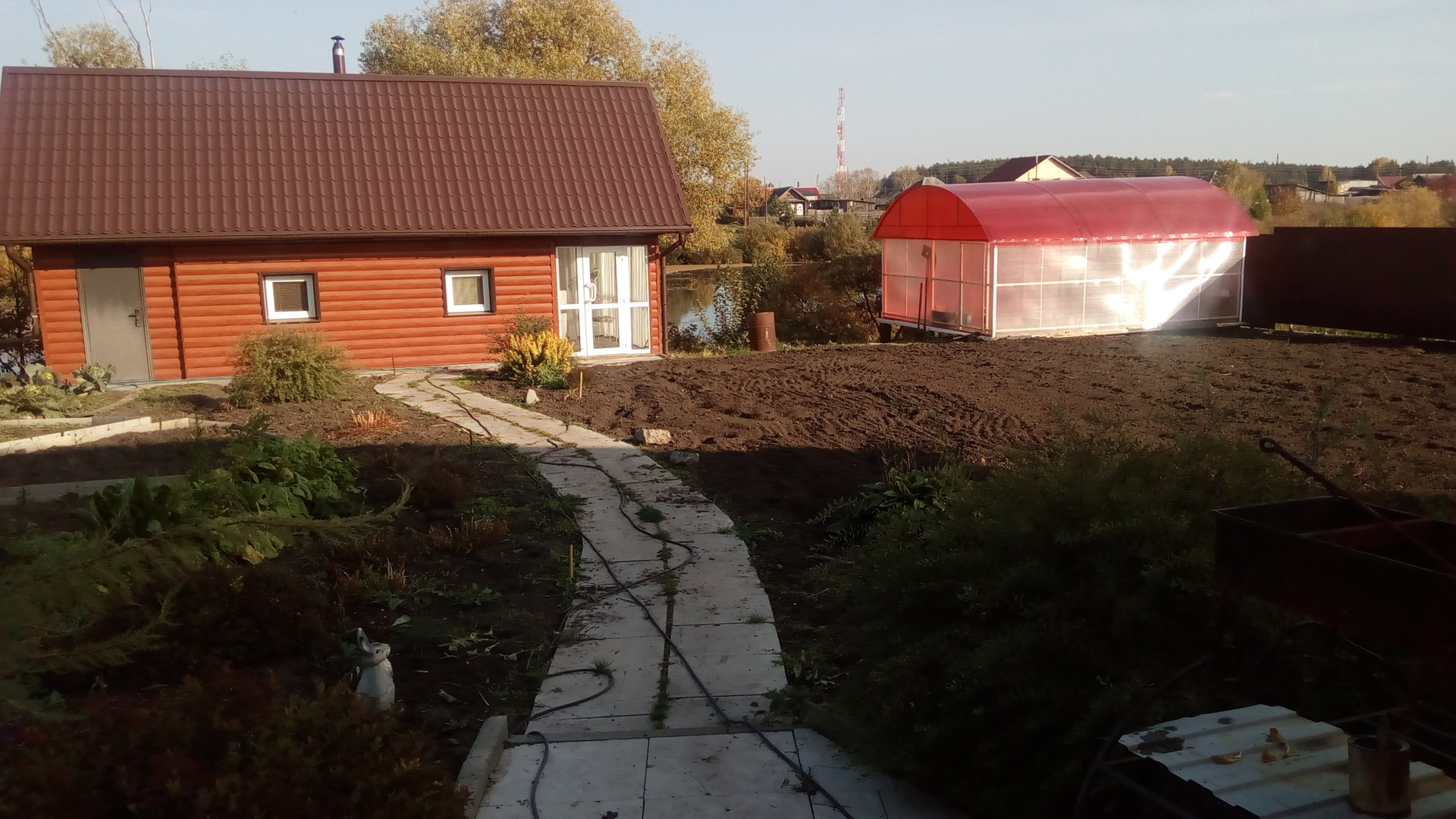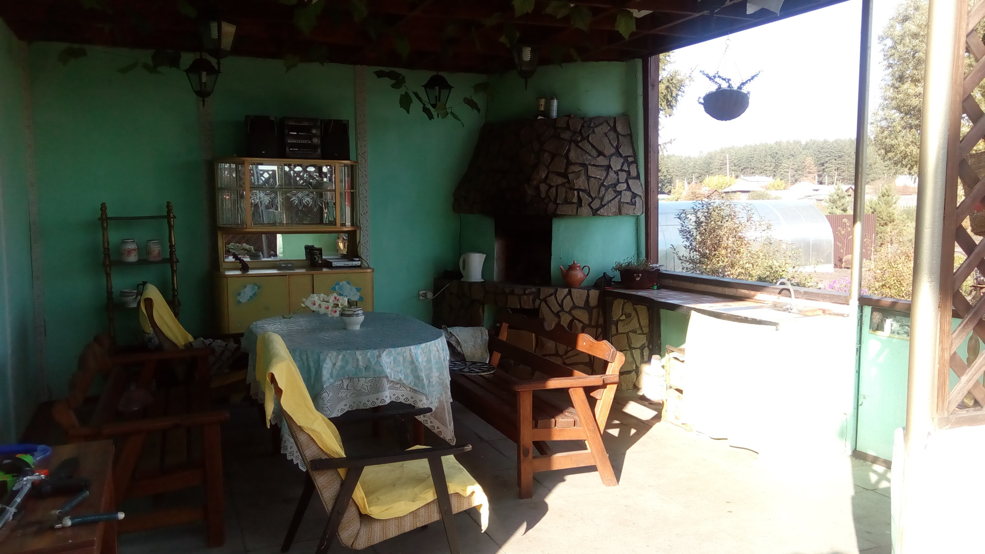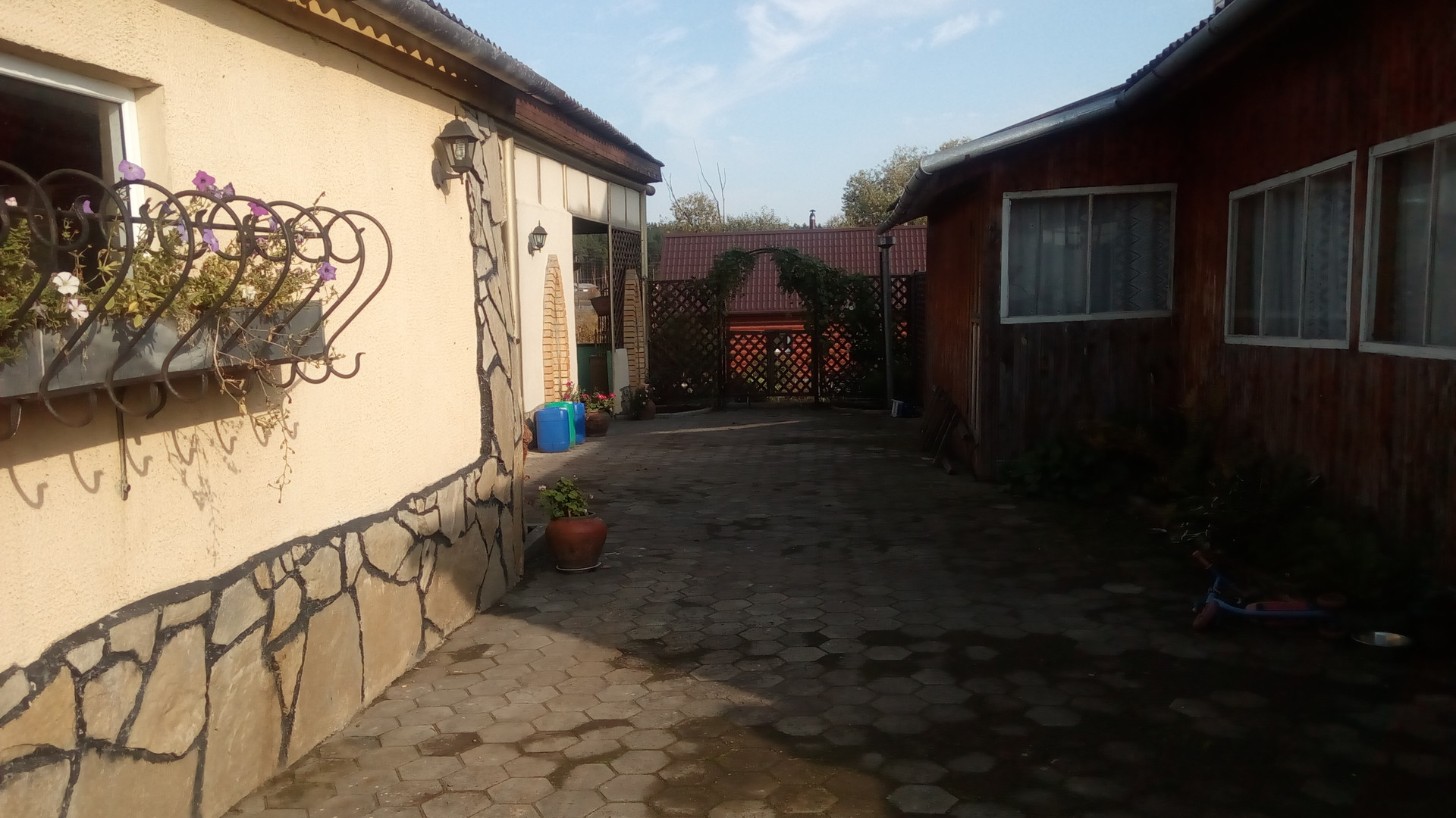 Во дворе дома выстроена новая баня-сауна, бассейн, просторная беседка для летнего отдыха, с угловым камином, гараж, погреб, детская площадка, большая теплица, очень много различных насаждений и деревьев (яблони, груши, вишня, слива), гараж со смотровой ямой.