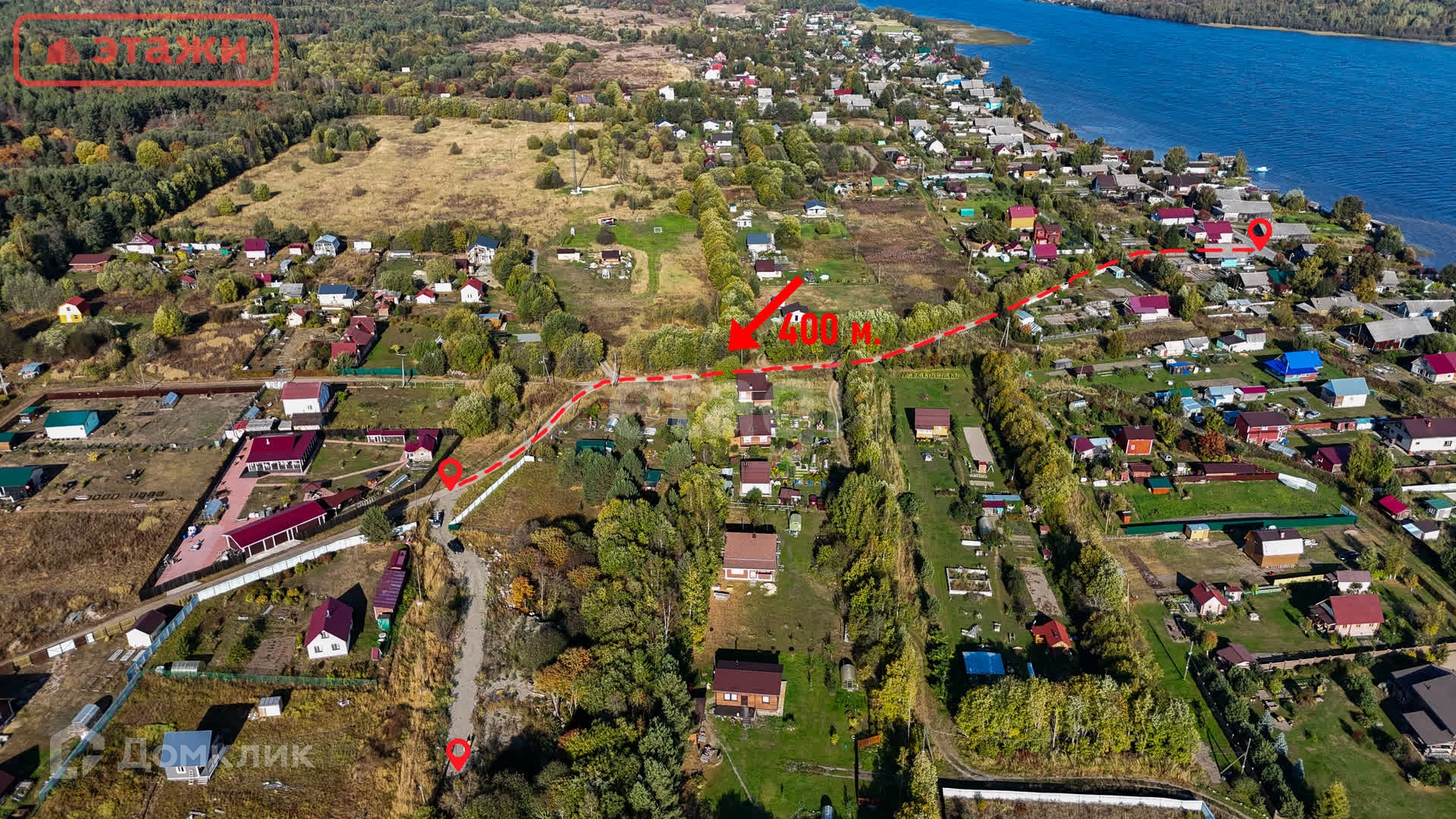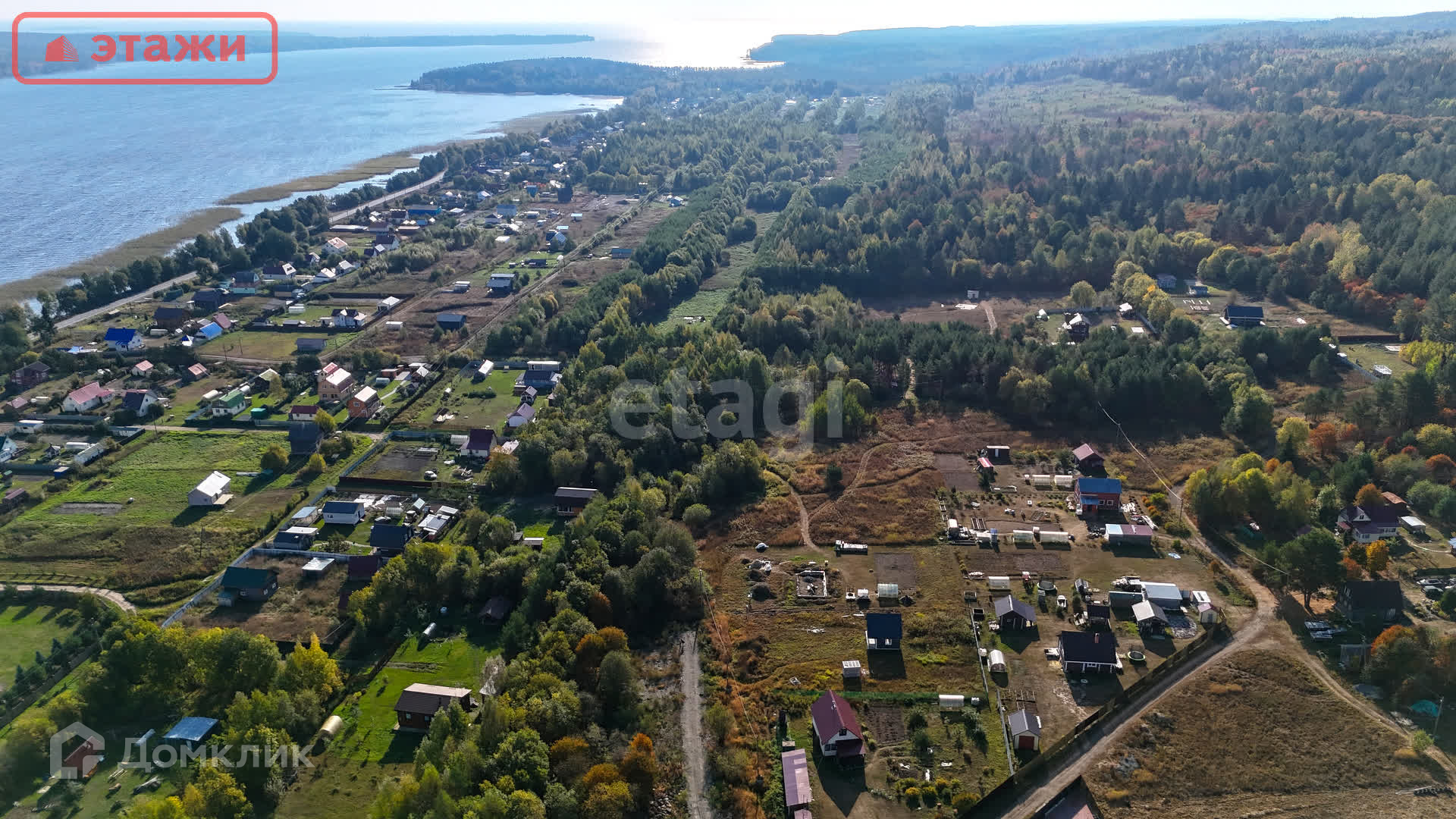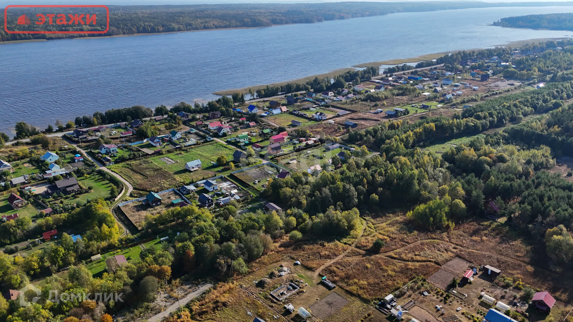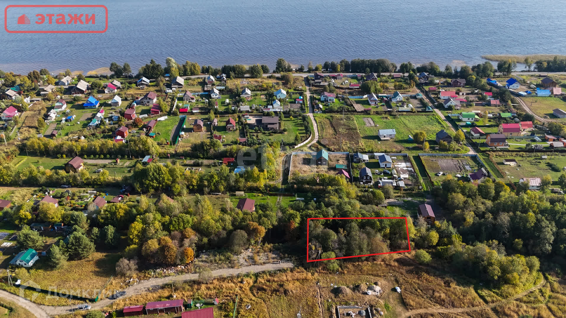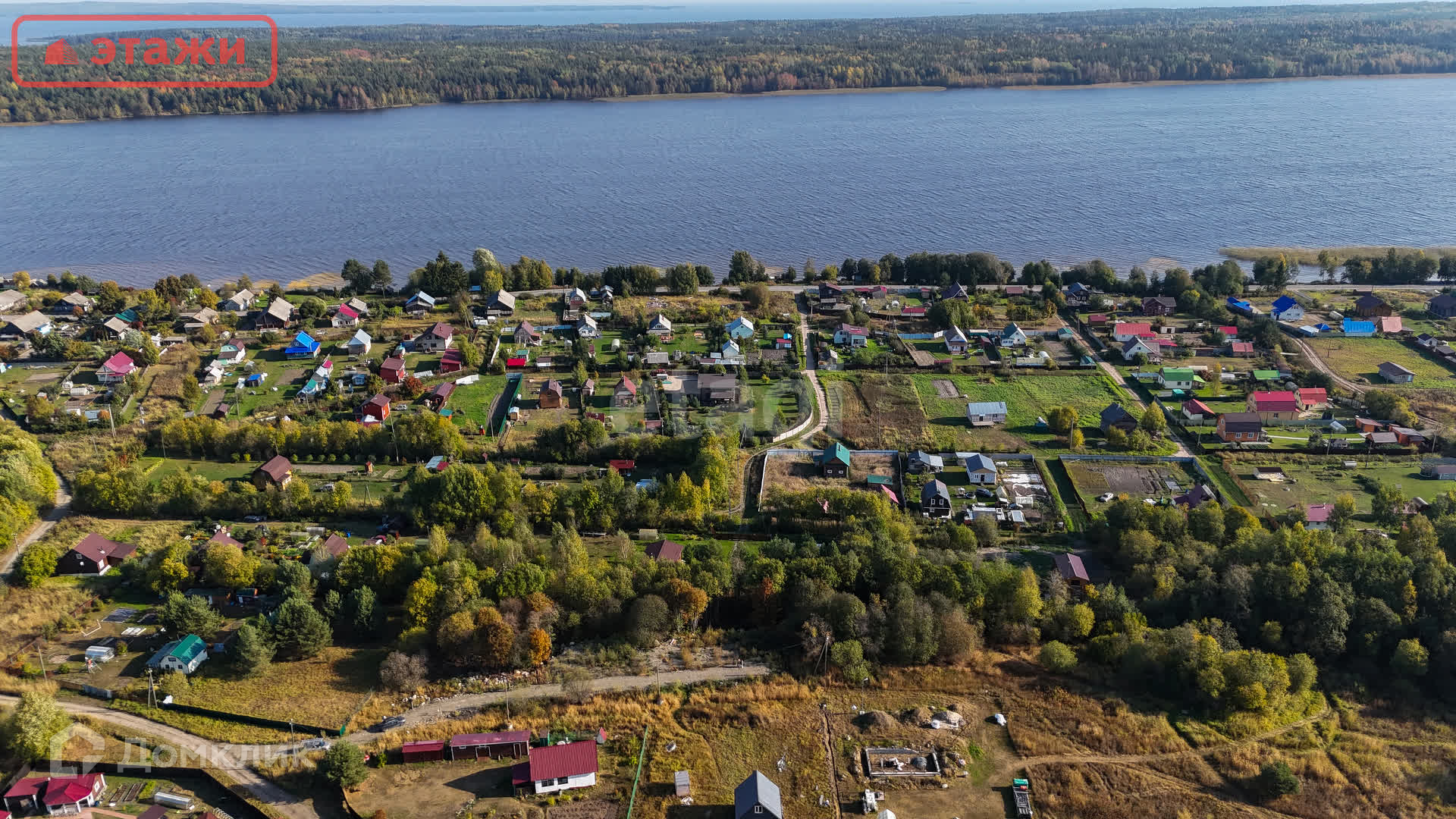 От участка до береговой линии – 500 м. На берегу оборудован небольшой пляж, заход в воду очень мелкий и пологий – идеально для купания, особенно для детей. Есть возможность спуска на воду лодки. Деревня закрыта от большой воды островом (см. карту). Никогда не бывает штормов и сильной волны.