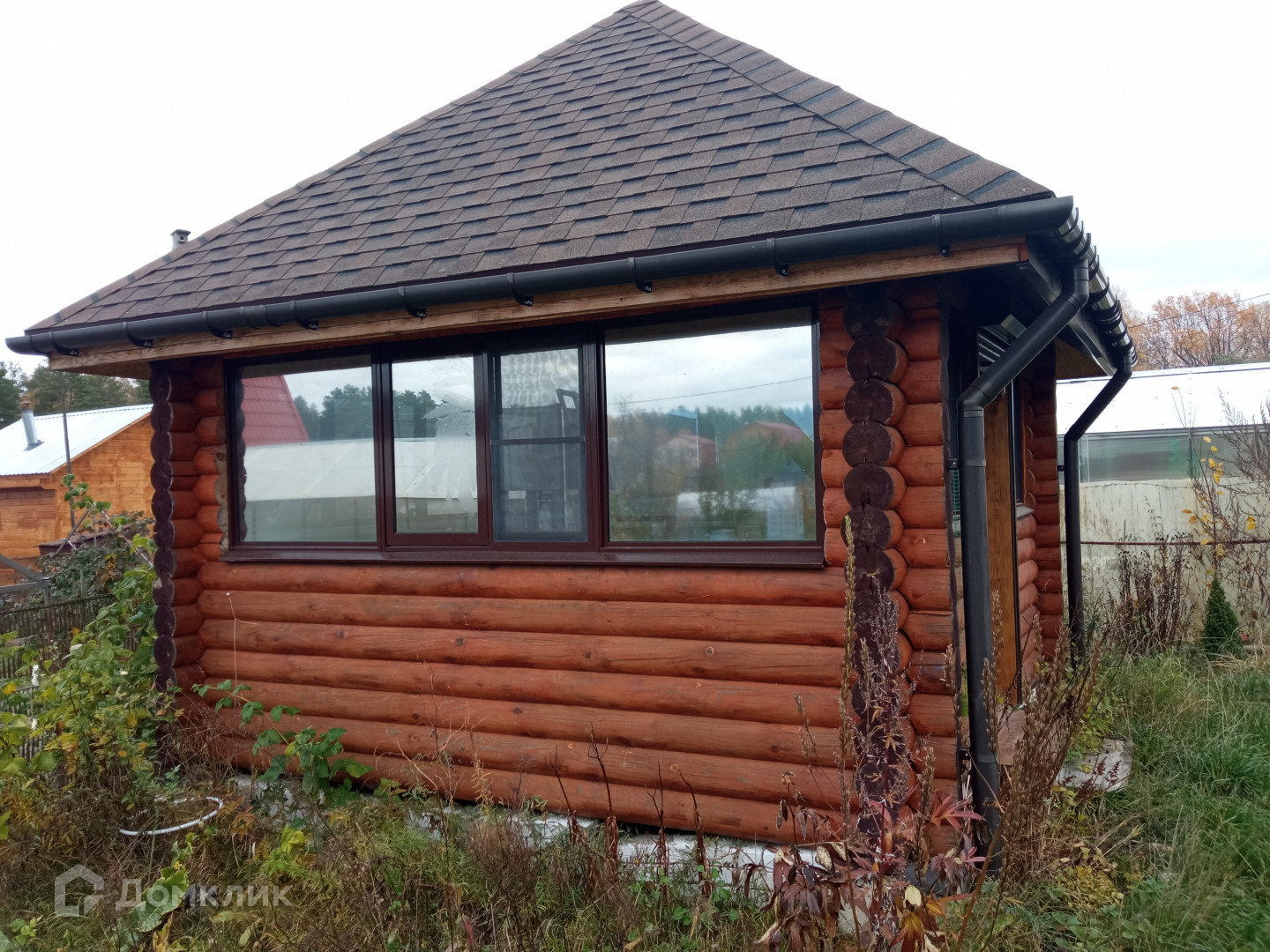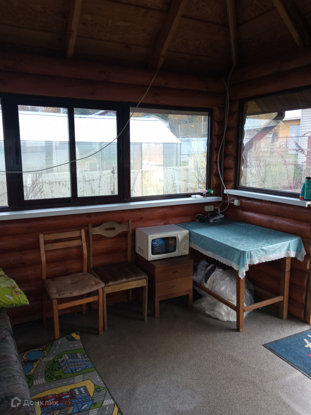 На участке расположен летний домик из оцилиндрованного бревна (с пропиткой).