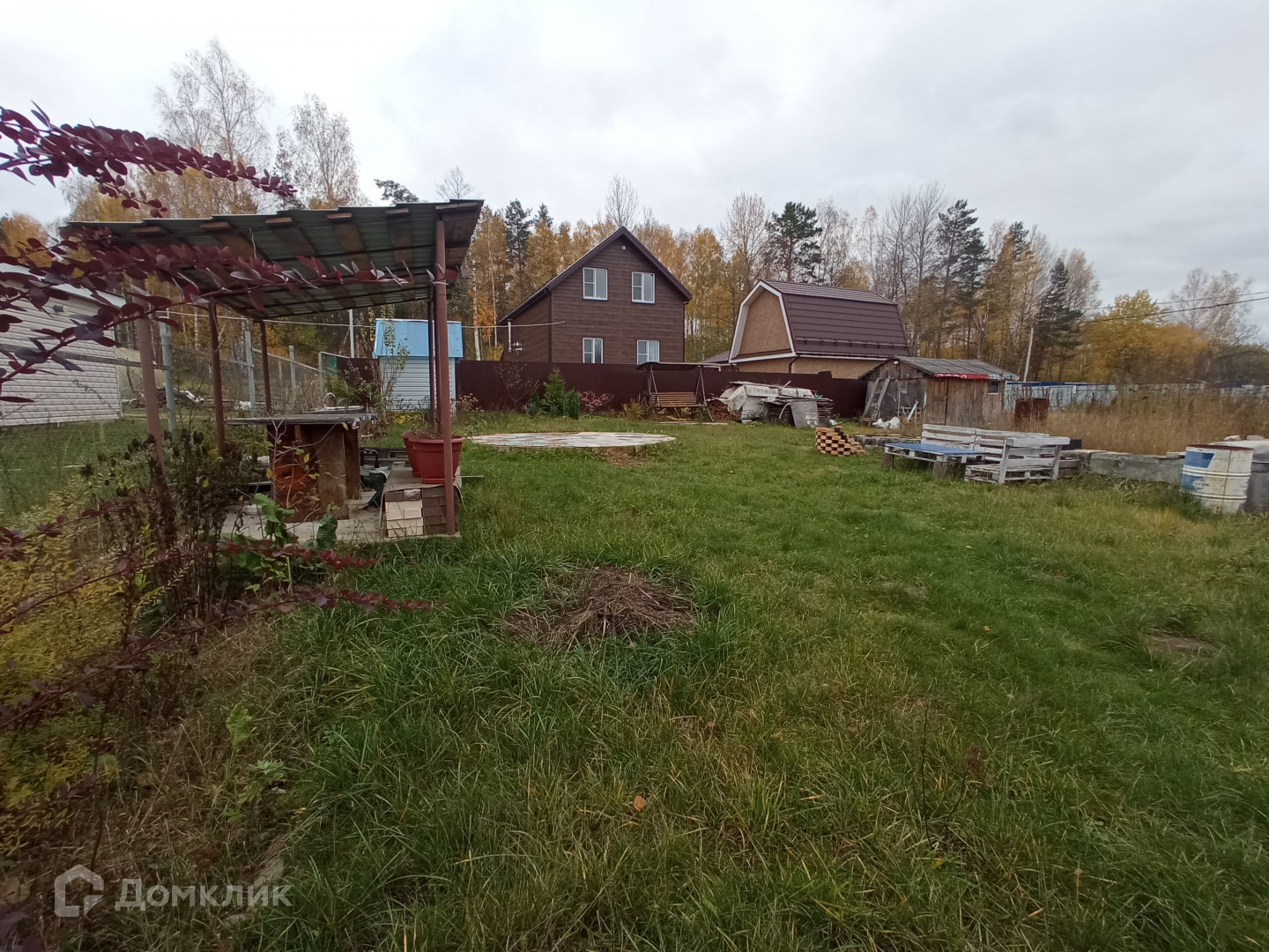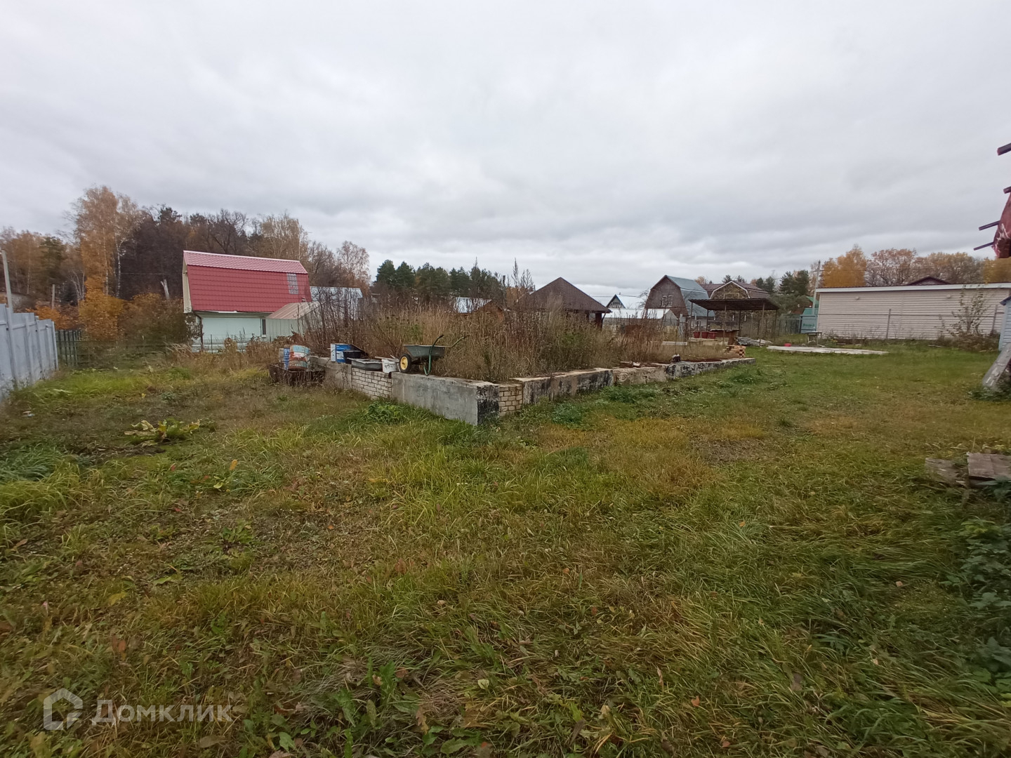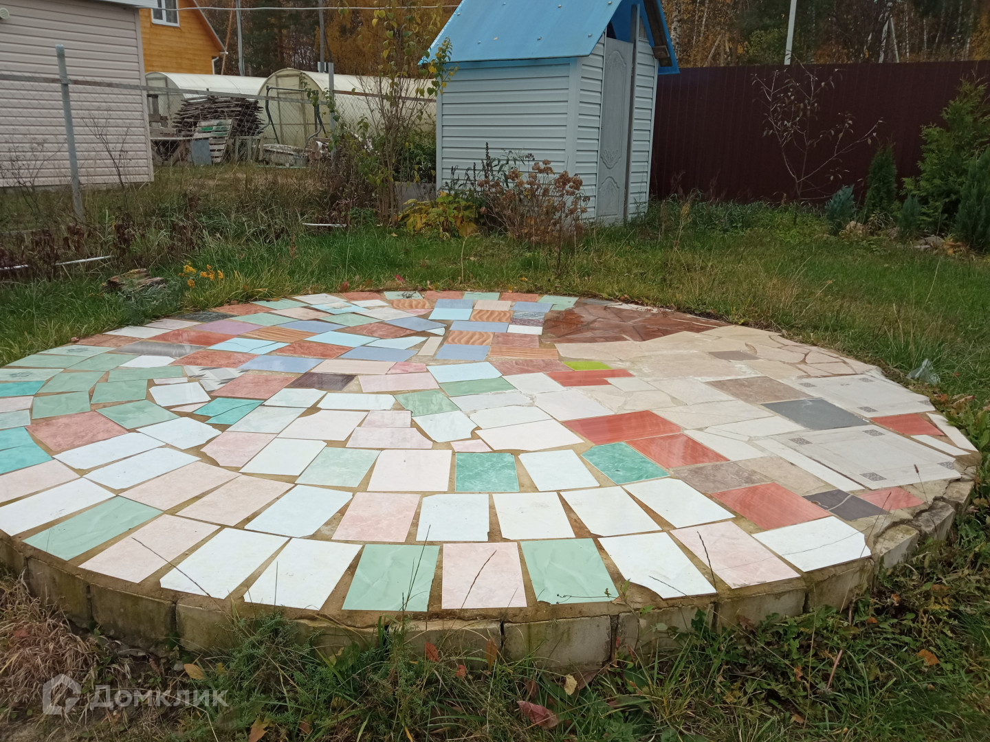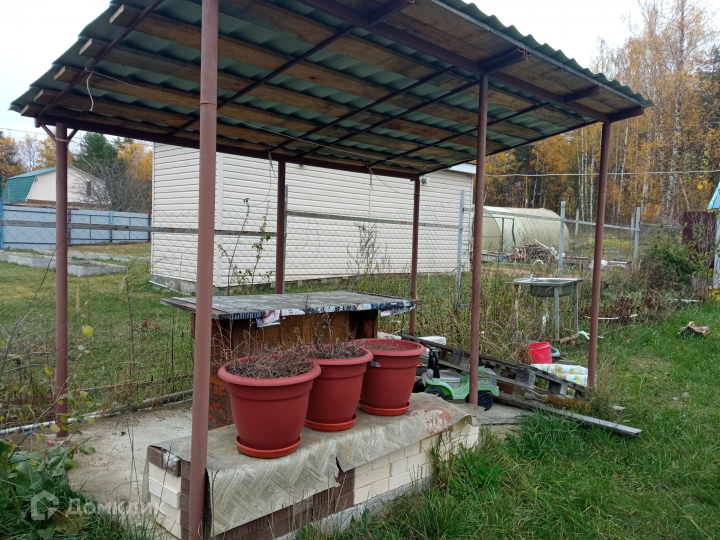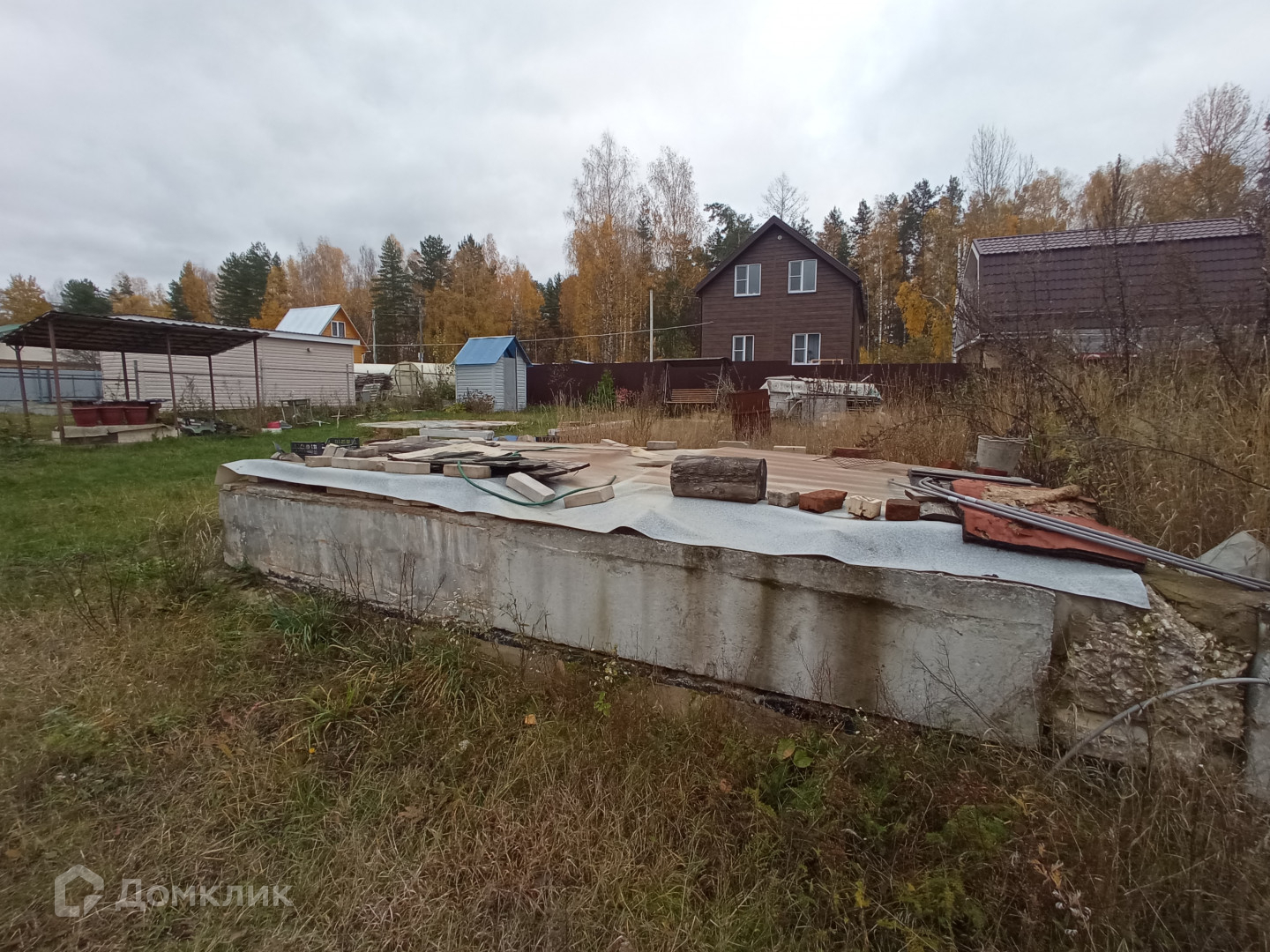 Забетонированная площадка под бассейн и летнюю кухню с крышей, качели садовые.