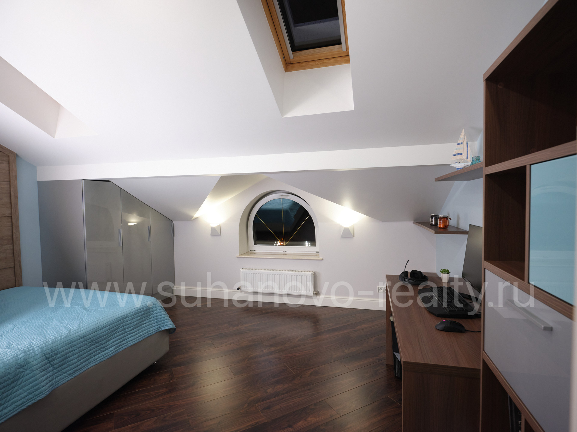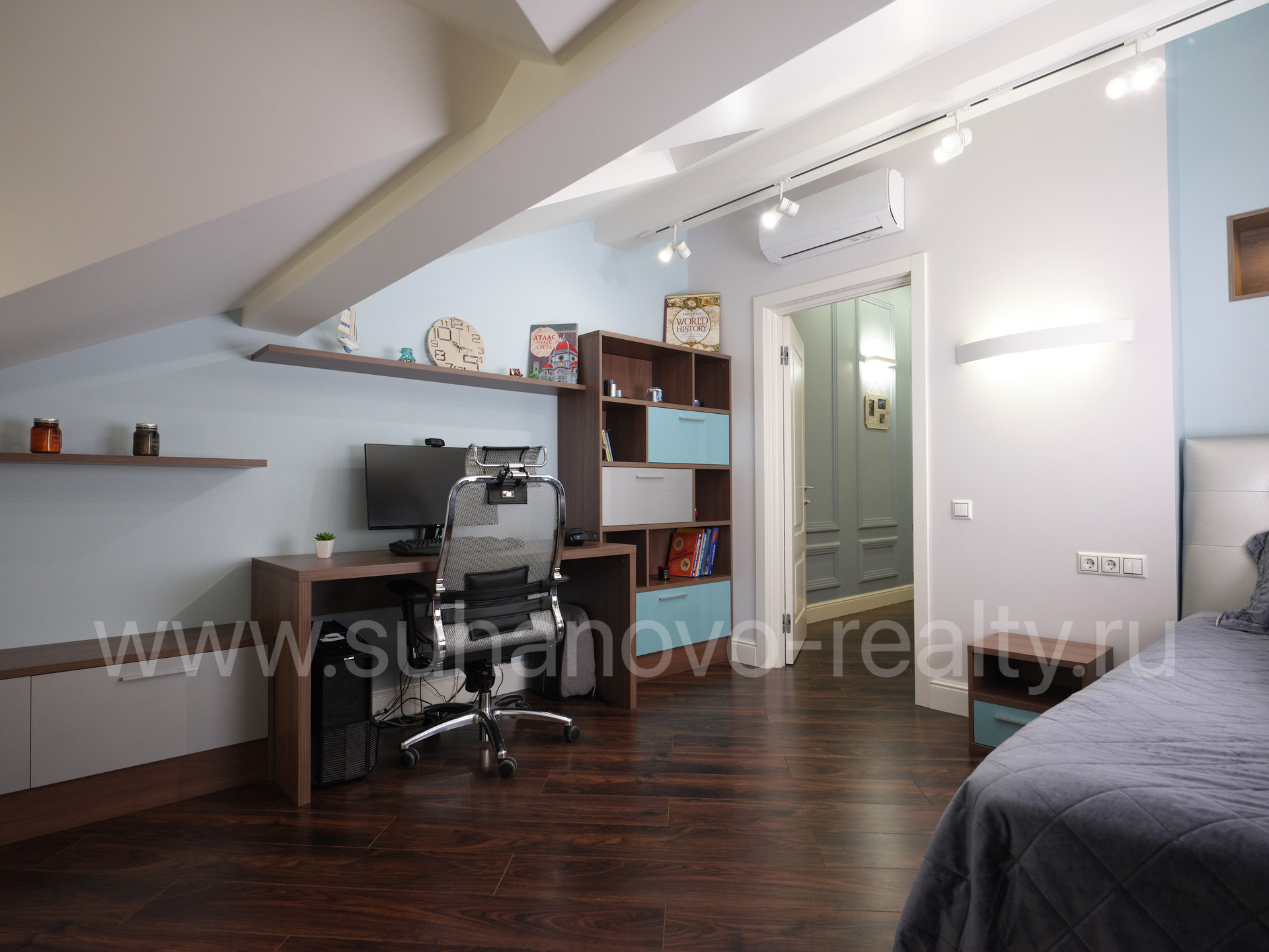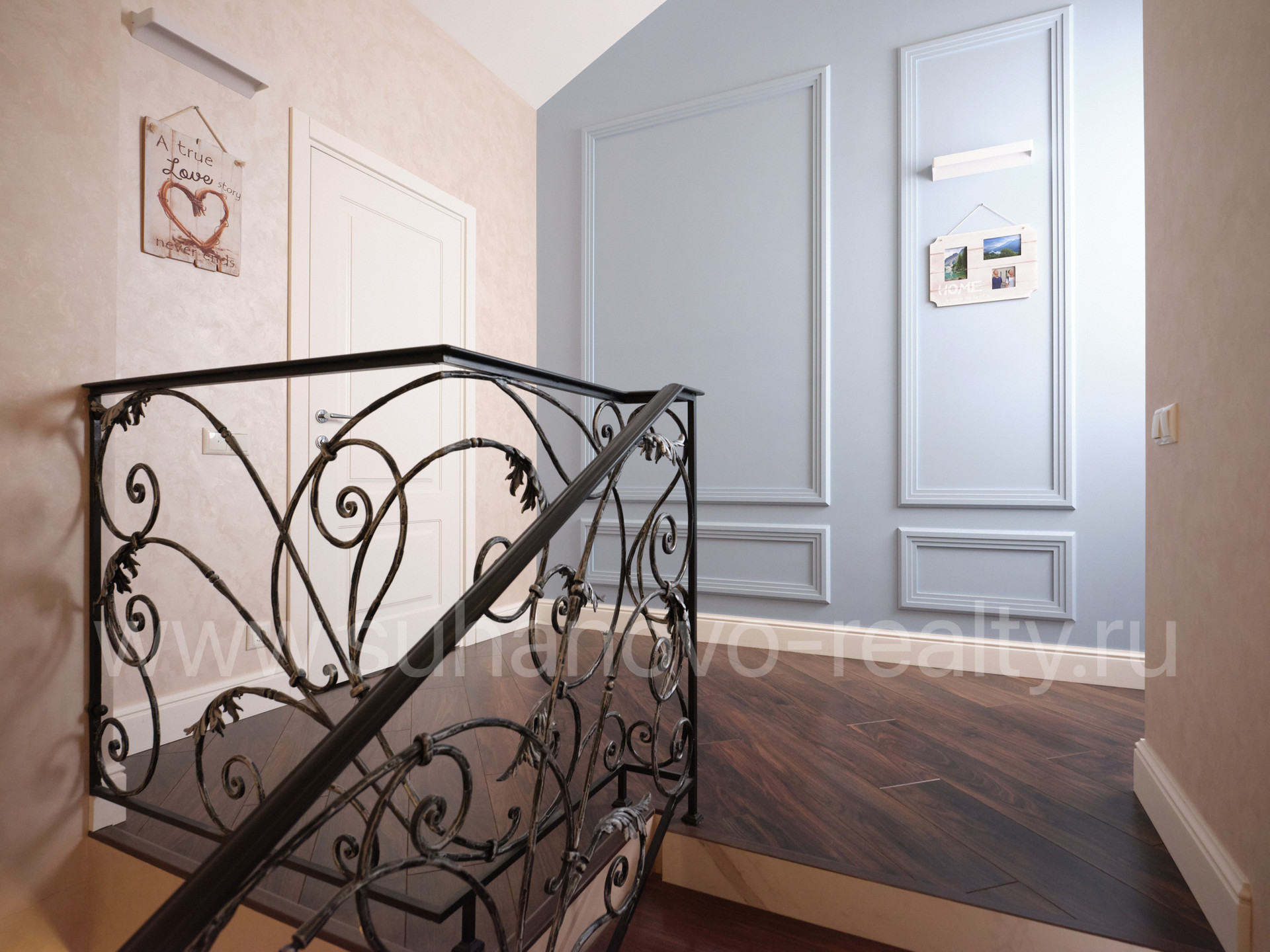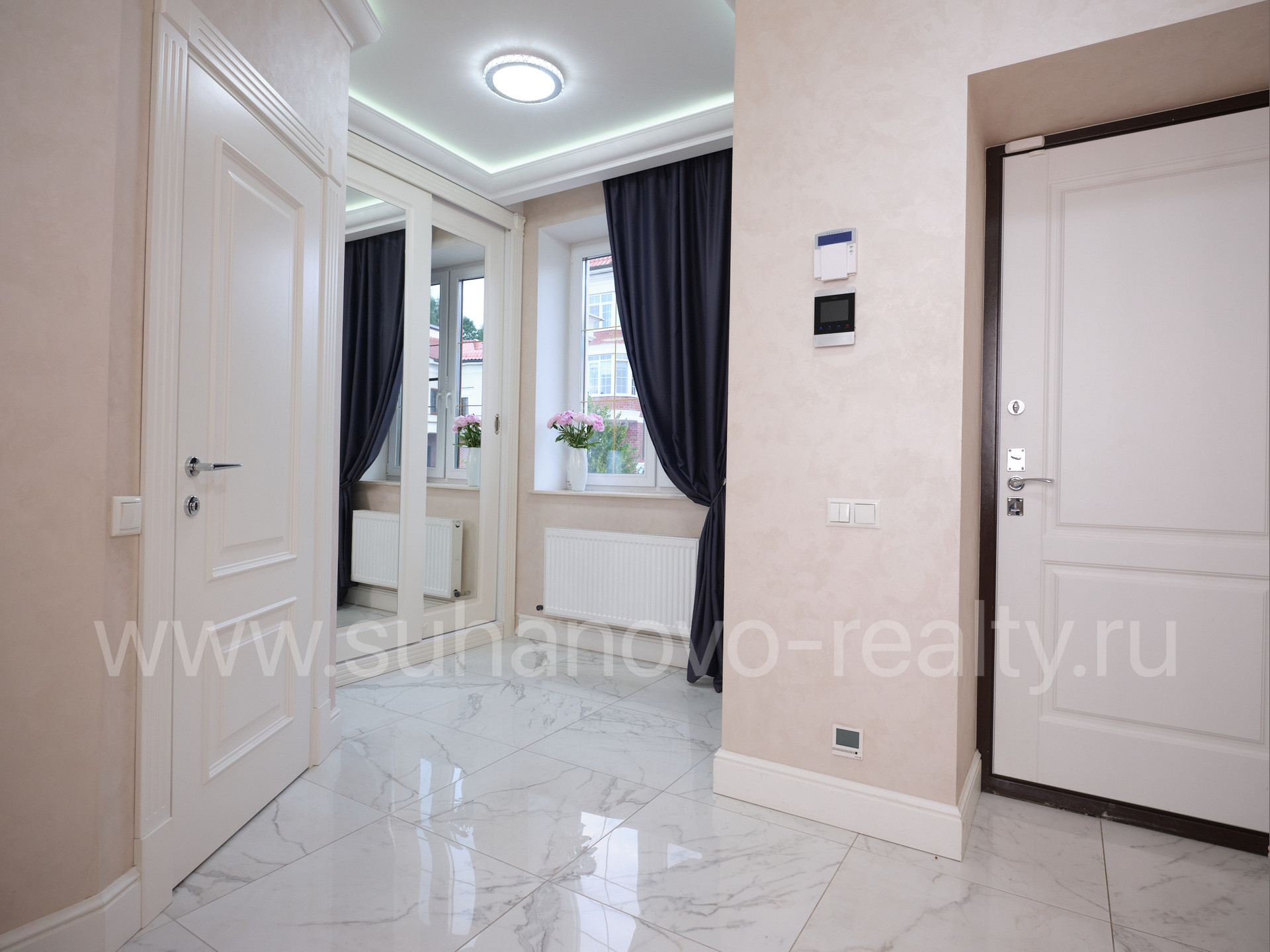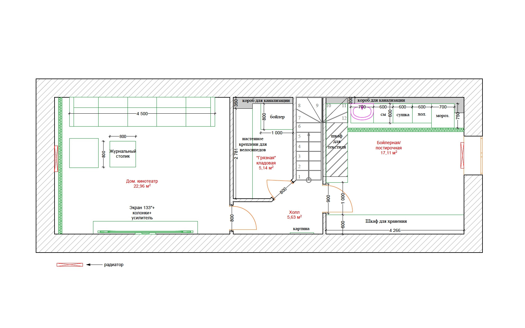 На 1 этаже расположены прихожая со встроенным шкафом (9,35 кв.м), гостевой санузел (2,2 кв.м) и совмещенная с кухней большая светлая гостиная (35 кв.м.) с панорамными французскими окнами, через которые осуществляется выход во внутренний дворик с зоной барбекю и зеленым газоном. На 2 этаже - просторная хозяйская спальня (17,5 кв.м.) с хорошей звукоизоляцией, санузел с ванной и душевой кабиной (6,8 кв.м.), а также кабинет (13 кв.м.) с выходом на балкон. На 3 этаже - две комнаты для детей/подростков (17 кв.м. каждая) и санузел (6 кв.м.). В цоколе устроены бойлерная (5 кв.м.) со стеллажами для хранения автомобильных шин, велосипедов и инструментов, постирочная (17 кв.м.) с большим встроенным шкафом, стиральной и сушильной машинами, раковиной, холодильником и морозильником, а также кинотеатр/фотостудия (23 кв.м.) с хорошей звукоизоляцией и всеми необходимыми выводами под оборудование и интернет.