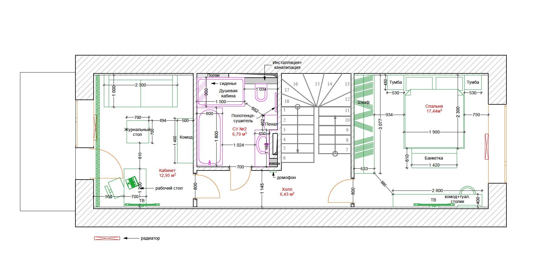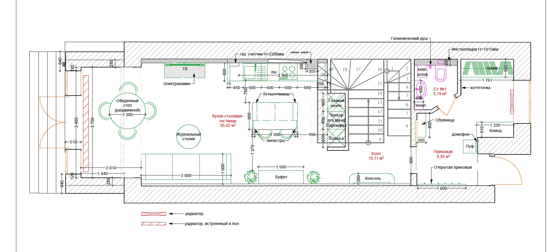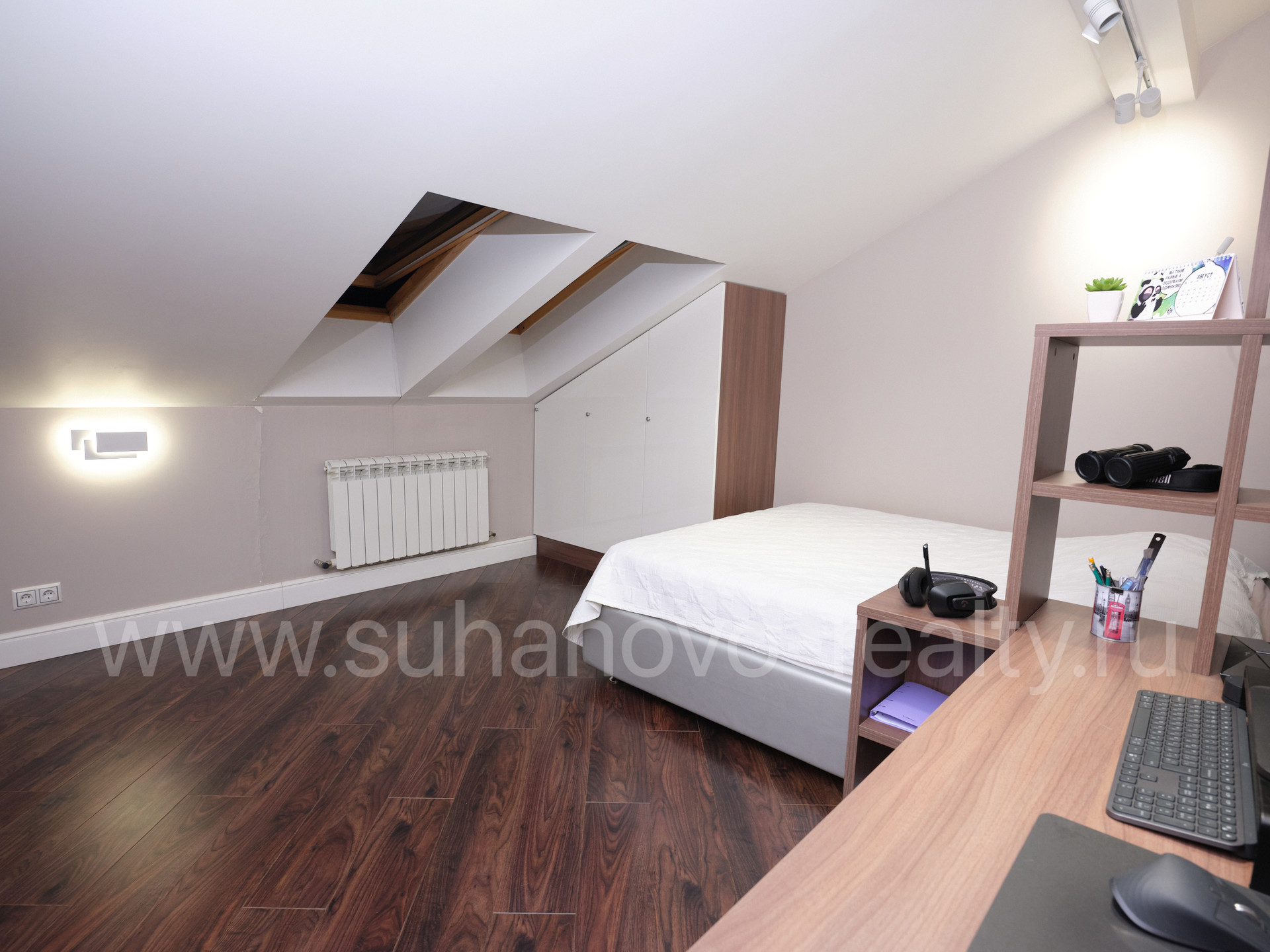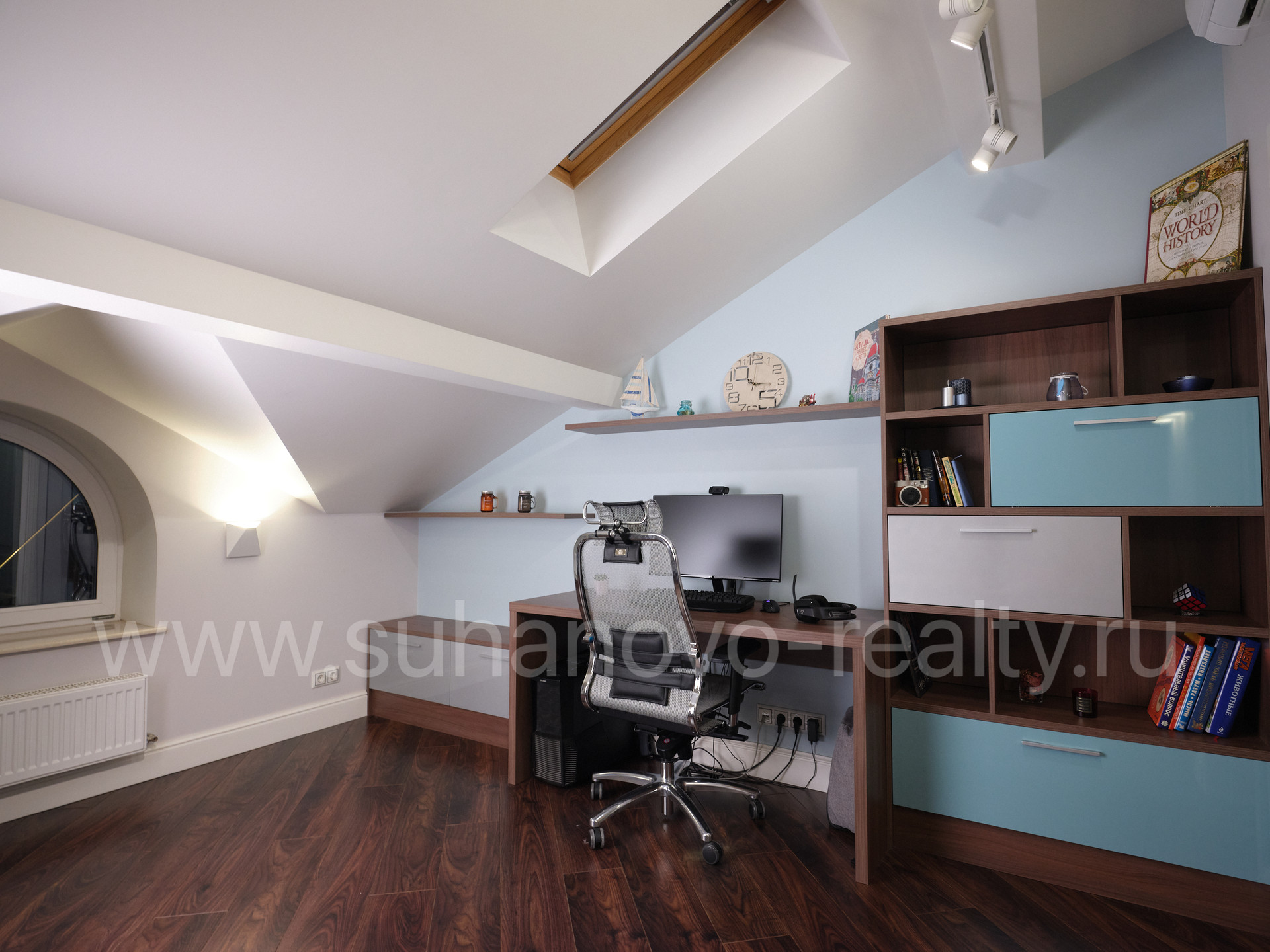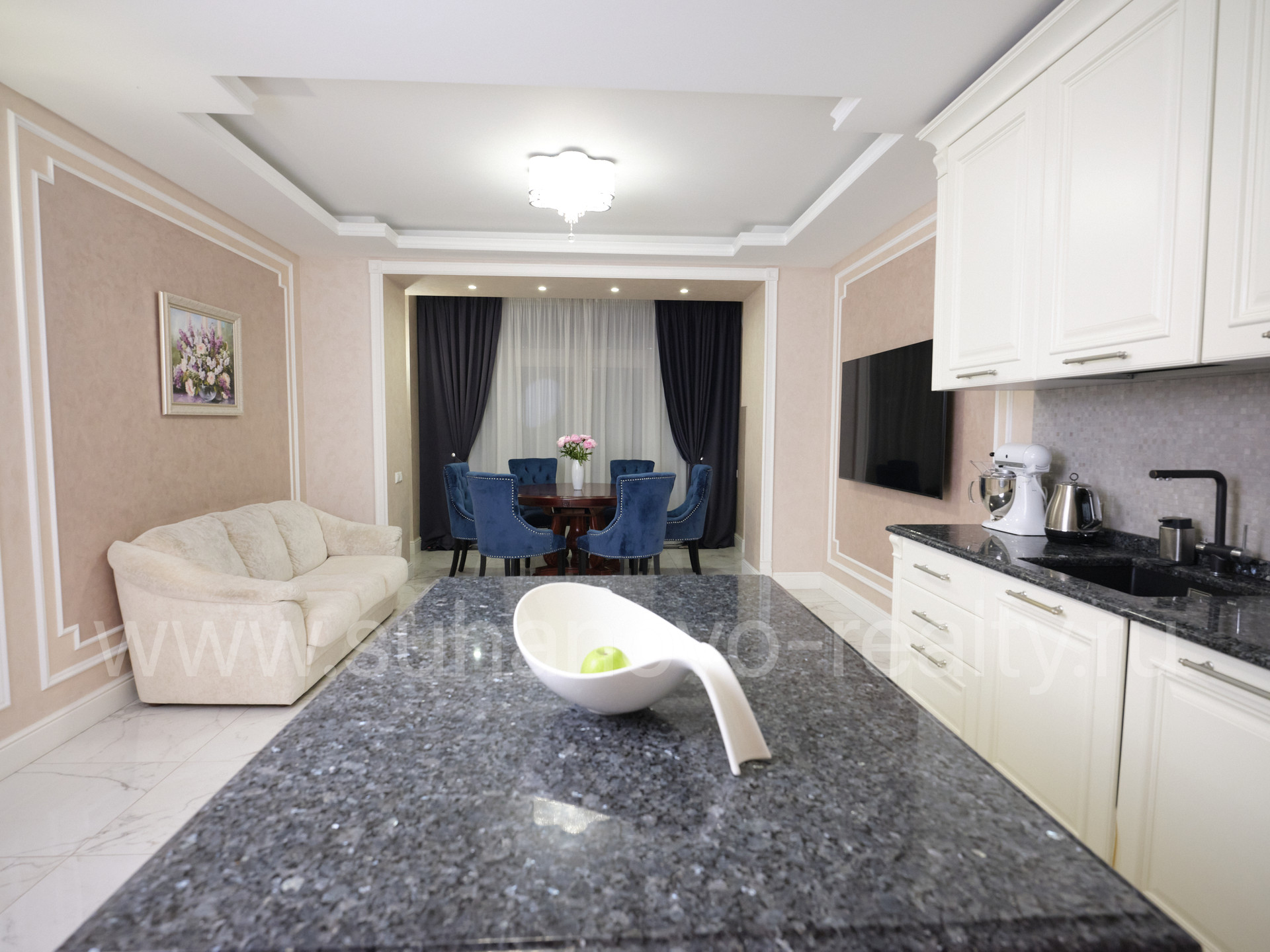 На 1 этаже расположены прихожая со встроенным шкафом (9,35 кв.м), гостевой санузел (2,2 кв.м) и совмещенная с кухней большая светлая гостиная (35 кв.м.) с панорамными французскими окнами, через которые осуществляется выход во внутренний дворик с зоной барбекю и зеленым газоном. На 2 этаже - просторная хозяйская спальня (17,5 кв.м.) с хорошей звукоизоляцией, санузел с ванной и душевой кабиной (6,8 кв.м.), а также кабинет (13 кв.м.) с выходом на балкон. На 3 этаже - две комнаты для детей/подростков (17 кв.м. каждая) и санузел (6 кв.м.). В цоколе устроены бойлерная (5 кв.м.) со стеллажами для хранения автомобильных шин, велосипедов и инструментов, постирочная (17 кв.м.) с большим встроенным шкафом, стиральной и сушильной машинами, раковиной, холодильником и морозильником, а также кинотеатр/фотостудия (23 кв.м.) с хорошей звукоизоляцией и всеми необходимыми выводами под оборудование и интернет.