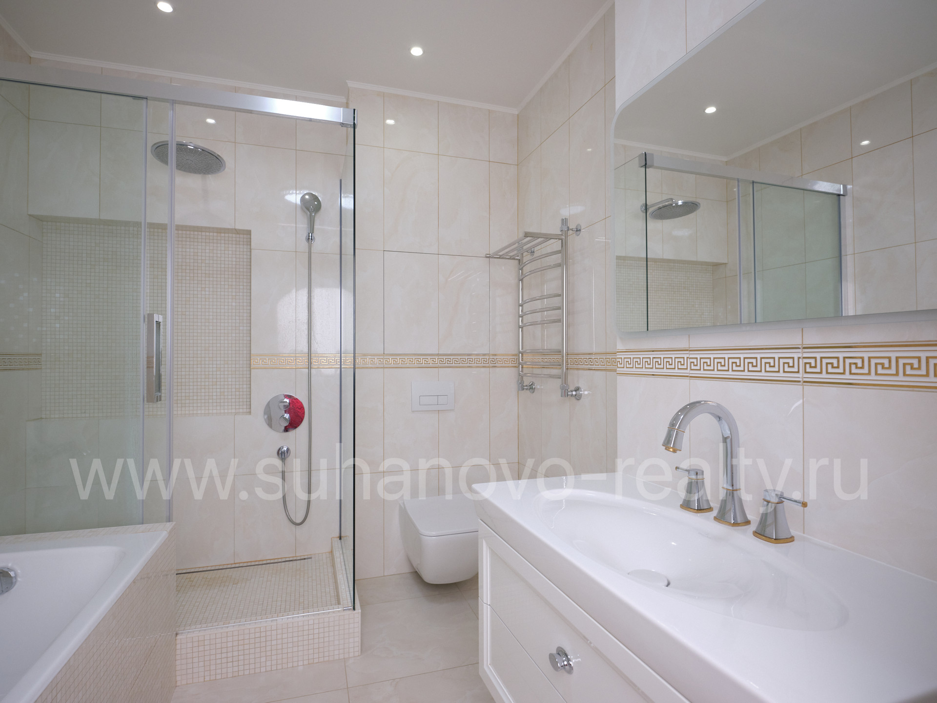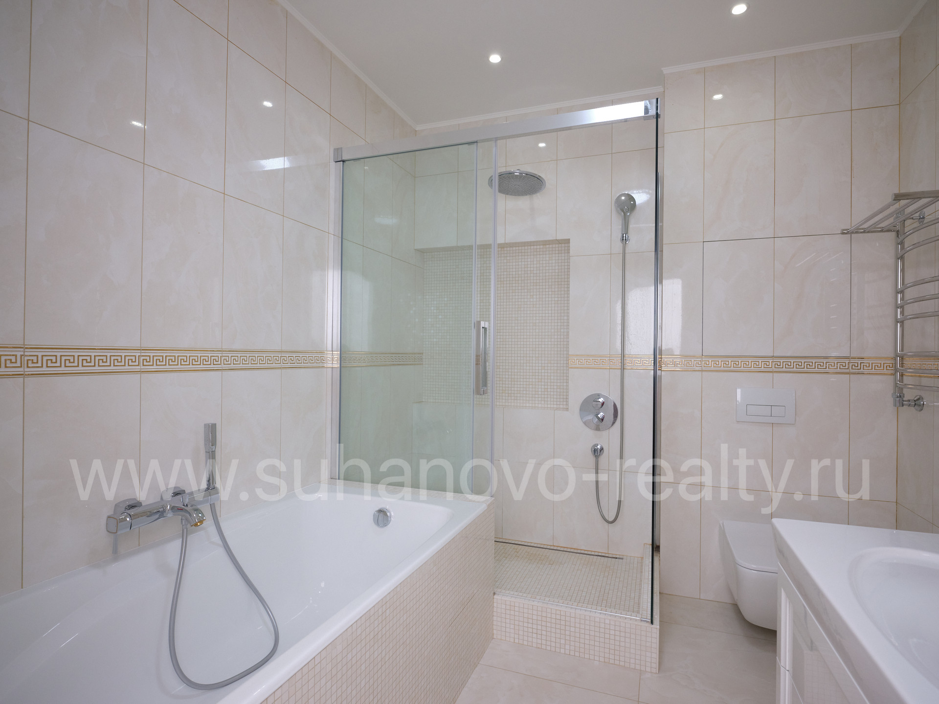 В таунхаусе выполнен дизайнерский ремонт в классическом стиле с использованием дорогих отделочных материалов и оборудования(итальянская плитка Atlas Concorde, сантехника Vileroy&Boch, бытовая техника Neff (электрическая духовка, микроволновка, вытяжка), Bosch (посудомойка, газовая плита, стиральная машина, сушильная машина), Gorenje (холодильник и морозильник в цоколе), кондиционеры Mitsubishi, двери Dorian, встроенная мебель Mr.Doors, кухня Virs, подоконники и столешницы из итальянского натурального мрамора и гранита, между этажами монолитная лестница с отделкой из натурального дуба и изысканными коваными перилами. В доме газовое отопление, бойлер объемом 250л., теплые полы. Вся сантехника, коммуникации и отделка в отличном состоянии.