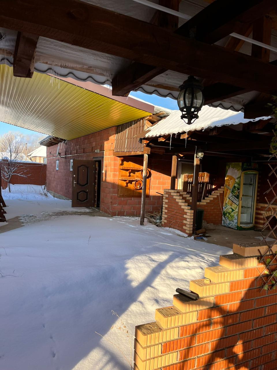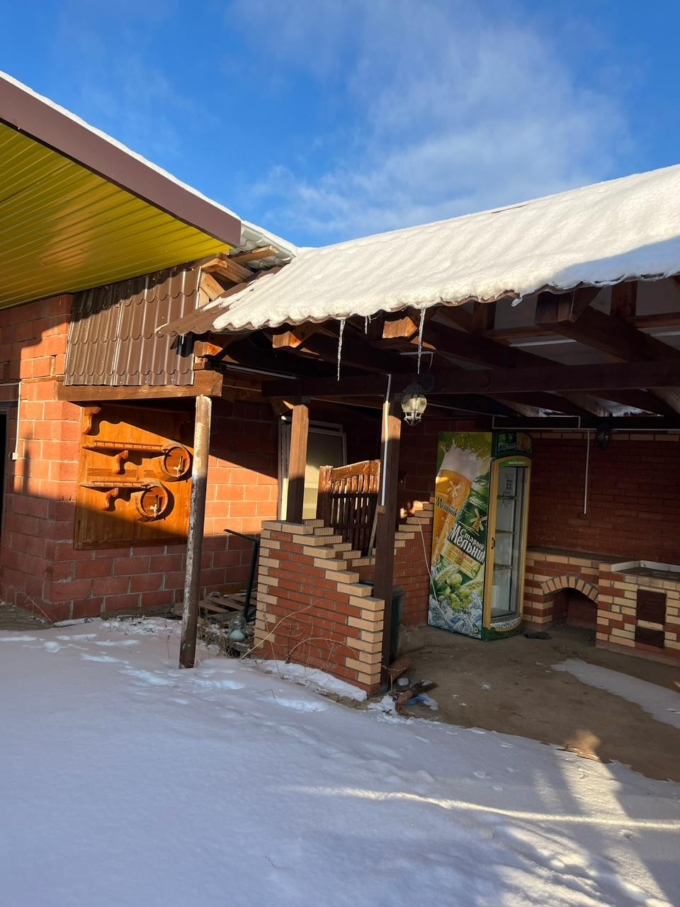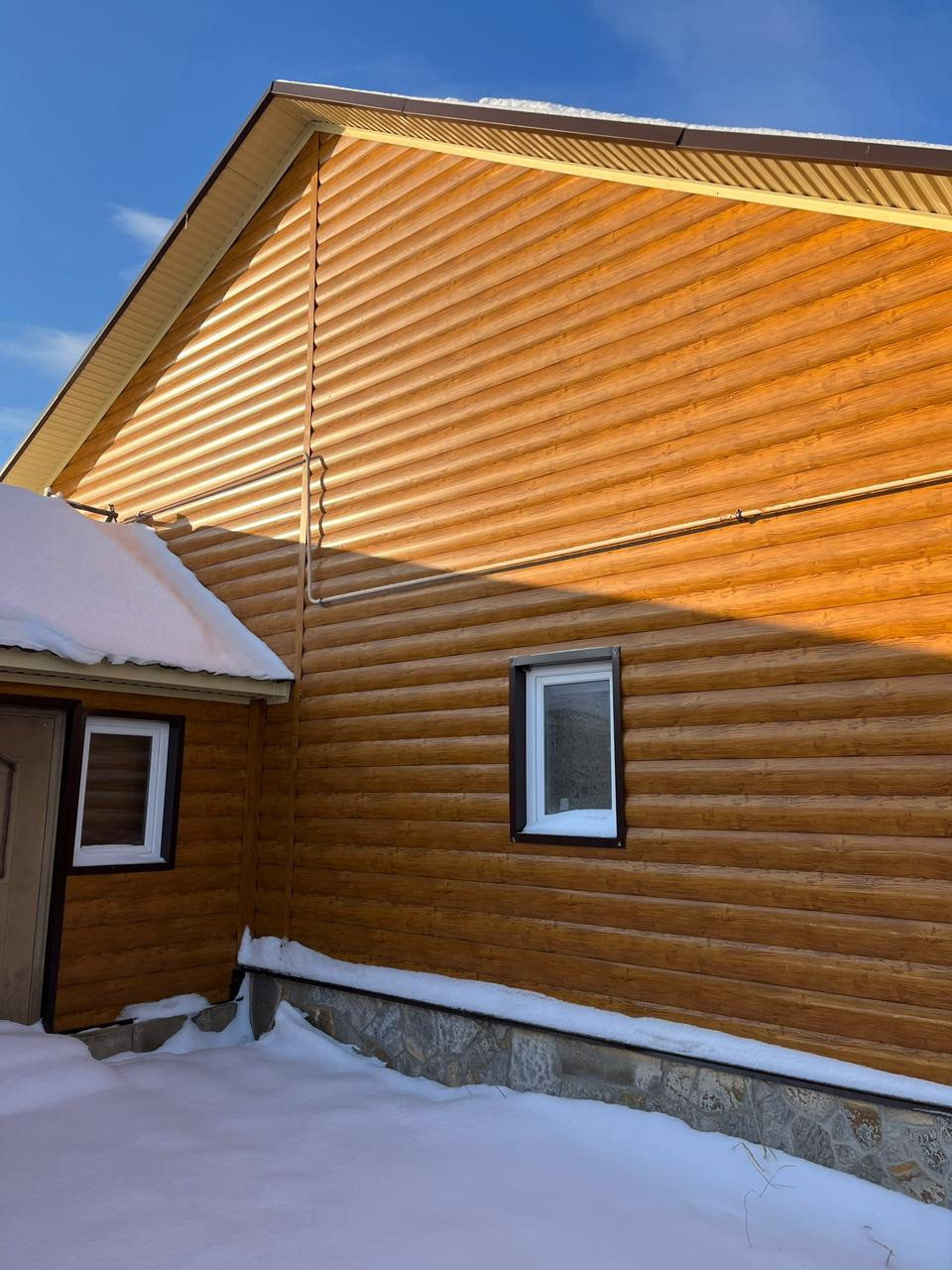 Построен из бруса 20/20 + утеплитель, снаружи обшит металлосайдингом.