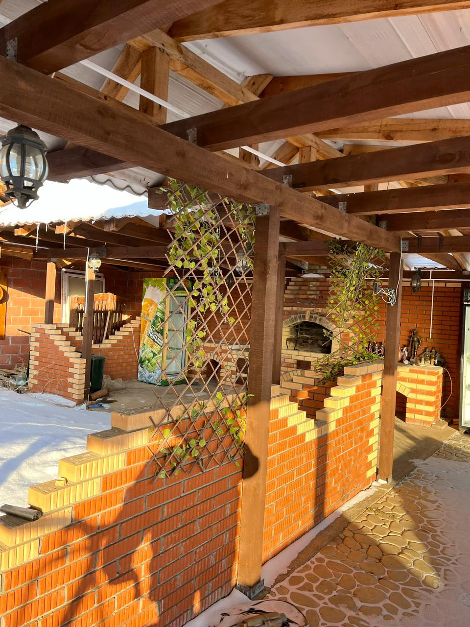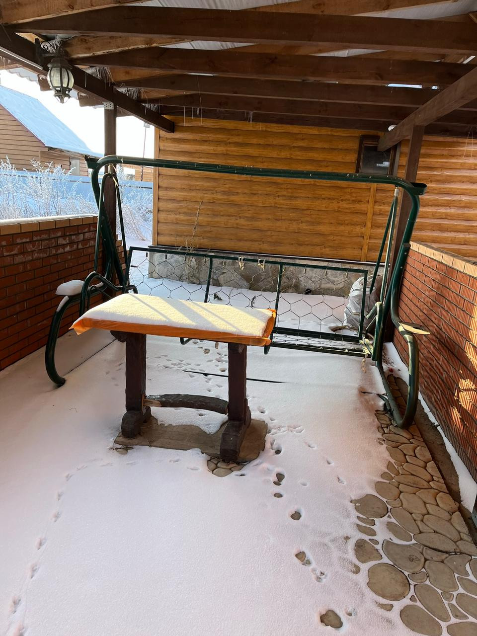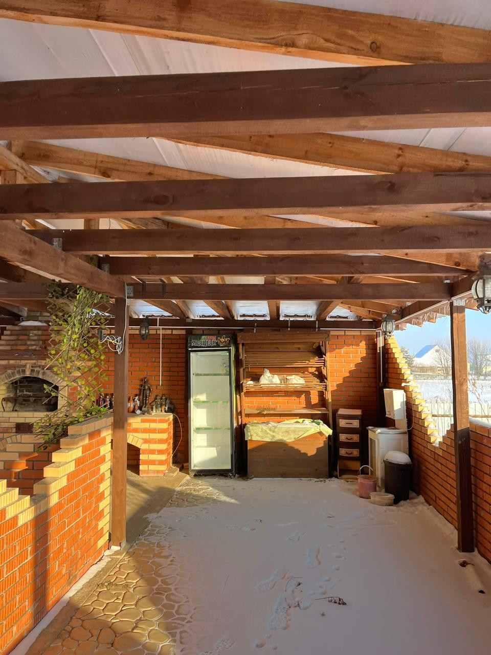 Построен из бруса 20/20 + утеплитель, снаружи обшит металлосайдингом.