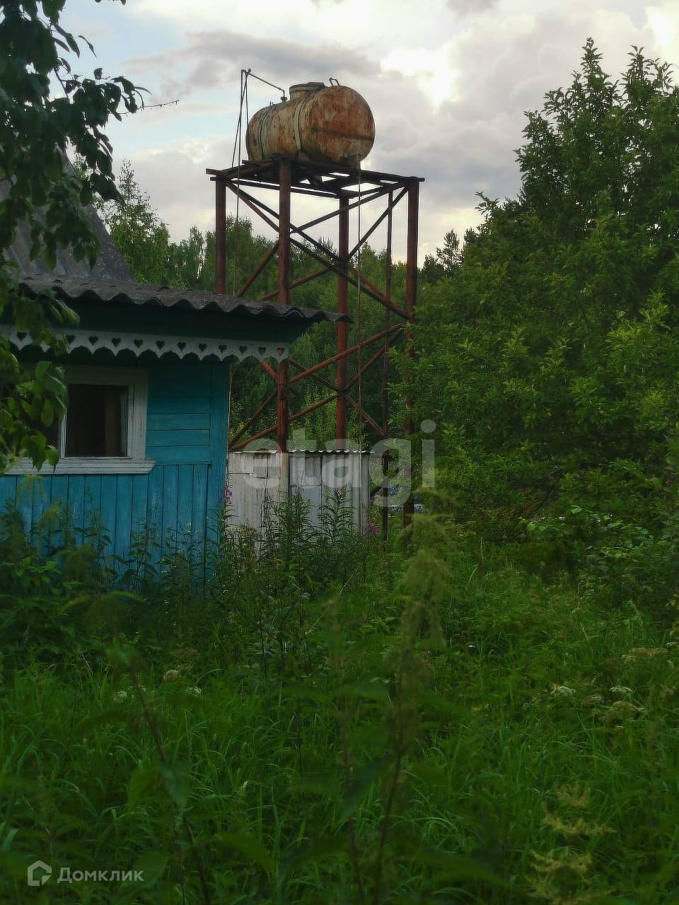 Баня, двор. Скважина с водонапорной башней. Посажены различные фруктовые деревья и