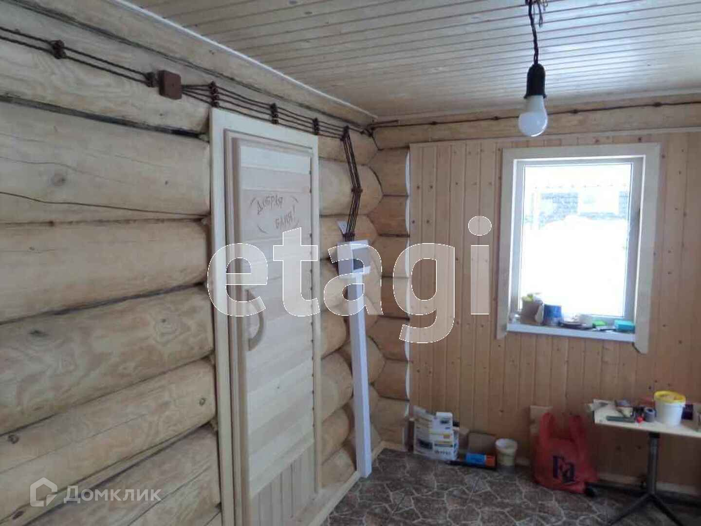 Баня из оцилиндрованного бревна 5*6м (комната отдыха, холл, помывочное отделение, парная, туалет), утепленная веранда 3*5 м.