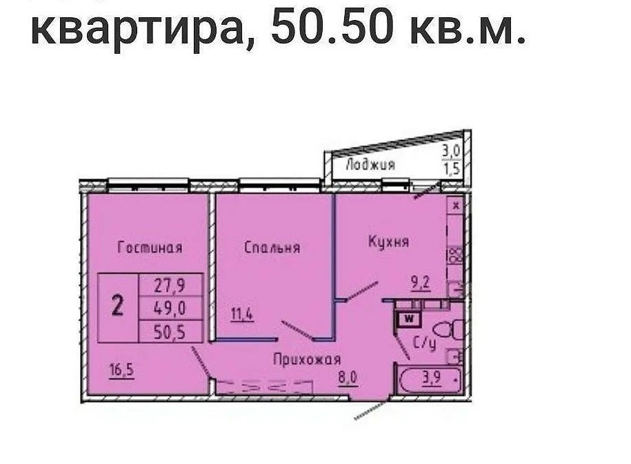 Общая площадь 50.5 м2